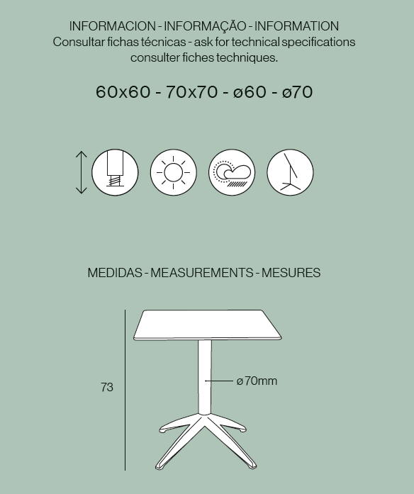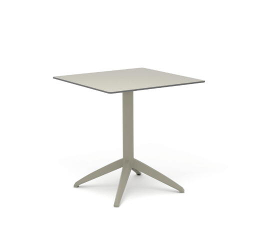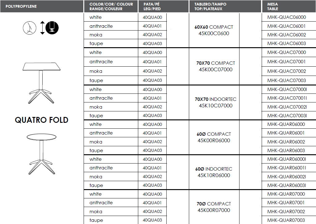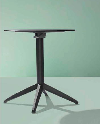 Stolik QUATRO; nowoczesny składany stolik kawiarniany, restauracyjny; metalowa kolumna na czterech regulowanych nóżkach z polipropylenu dostępna w czterech kolorach. Możliwość składania stolika ułatwia jego przechowywanie. Stolik dostępny z blatem okrągłym w dwóch rozmiarach lub z blatem kwadratowym także w dwóch rozmiarach.