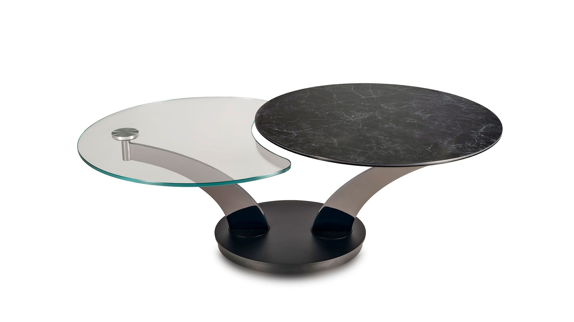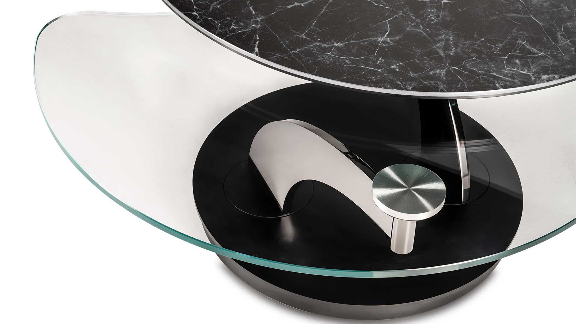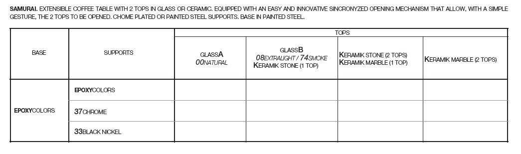 Designerski włoski stolik kawowy SAMURAI - stolik o ciekawym designie; podstawa metalowa; blaty szkło lub ceramiczne. Unikalny mechanizm rozkładający.