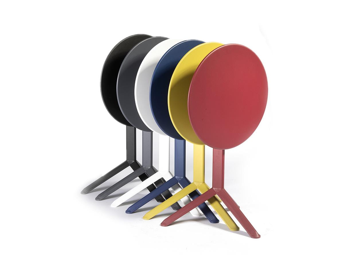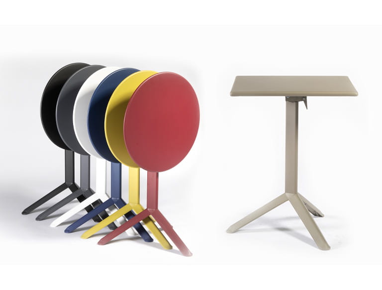 Stół ARKET PLUS; blat metalowy, podstawa połączenie metalu z polipropylenem; stół dostępny z blatem okrągłym w dwóch rozmiarach i blatem kwadratowym. Stół można również użytkować na zewnątrz. Doskonały do niewielkich ogródków gastronomicznych. Dzięki funkcji składania blatu niezwykle łatwy w przechowywaniu.
