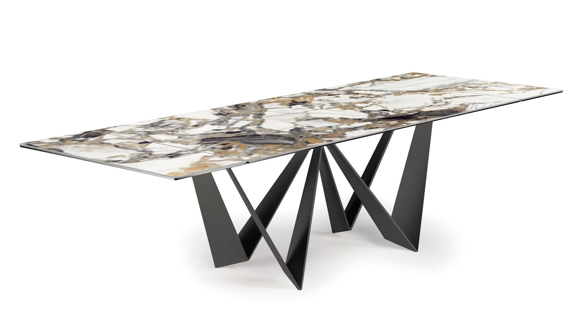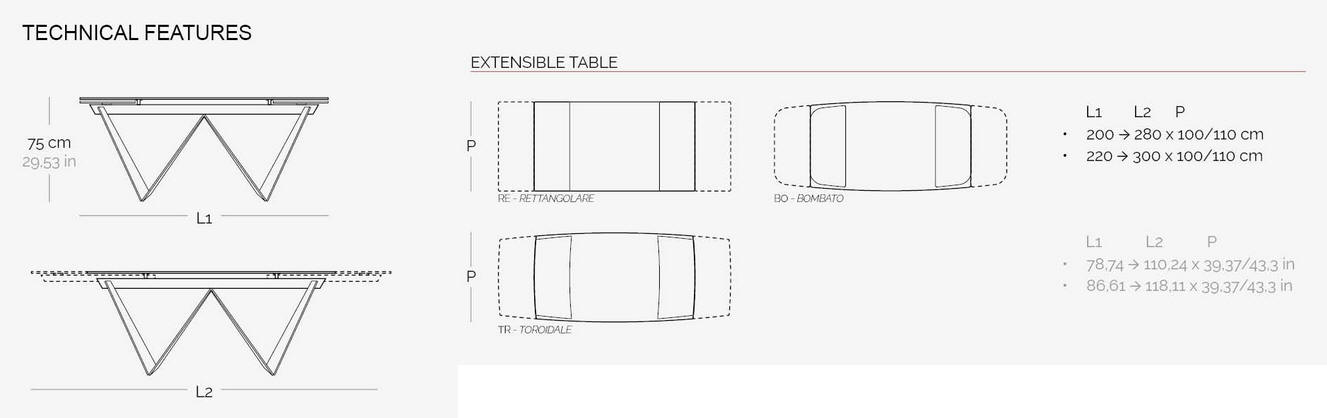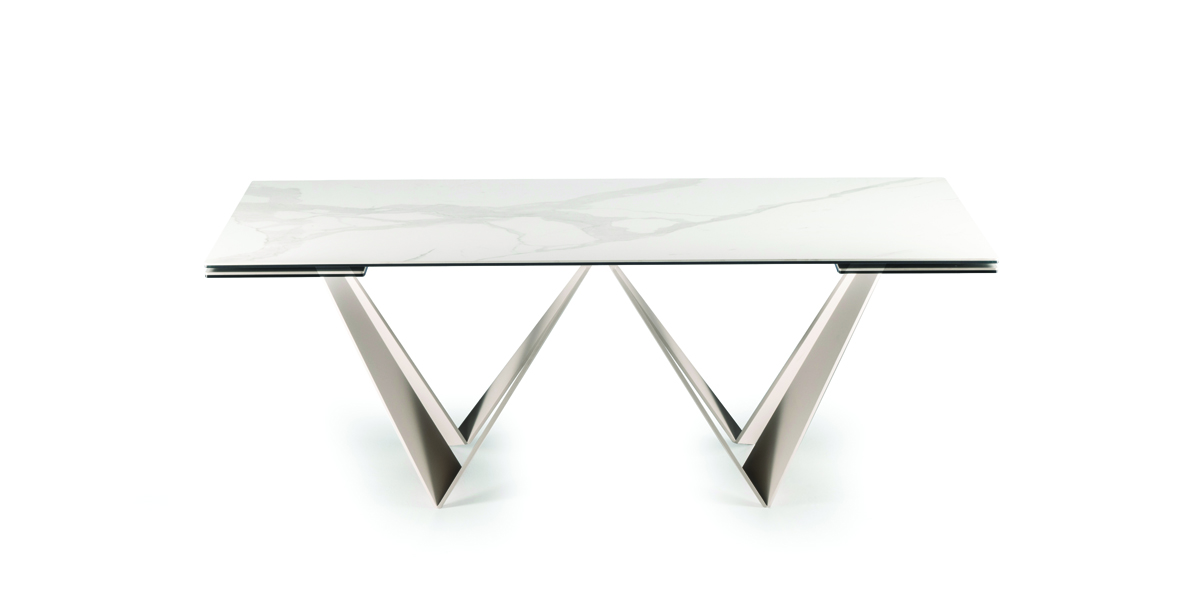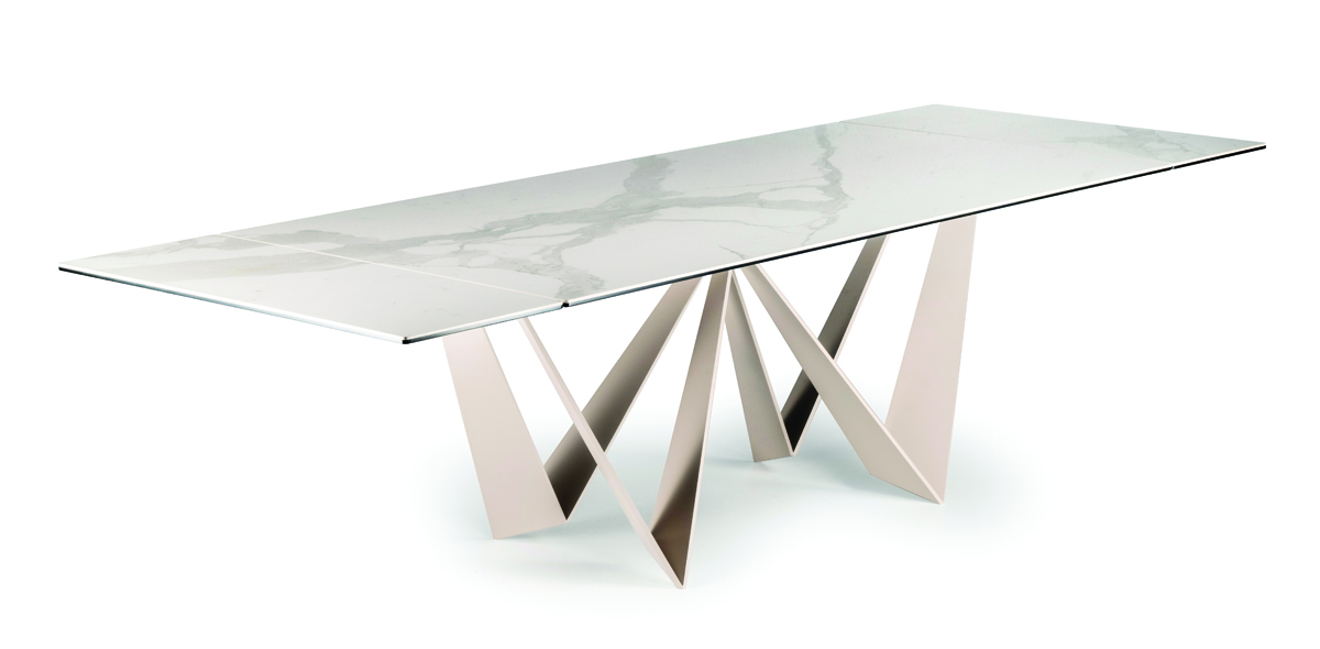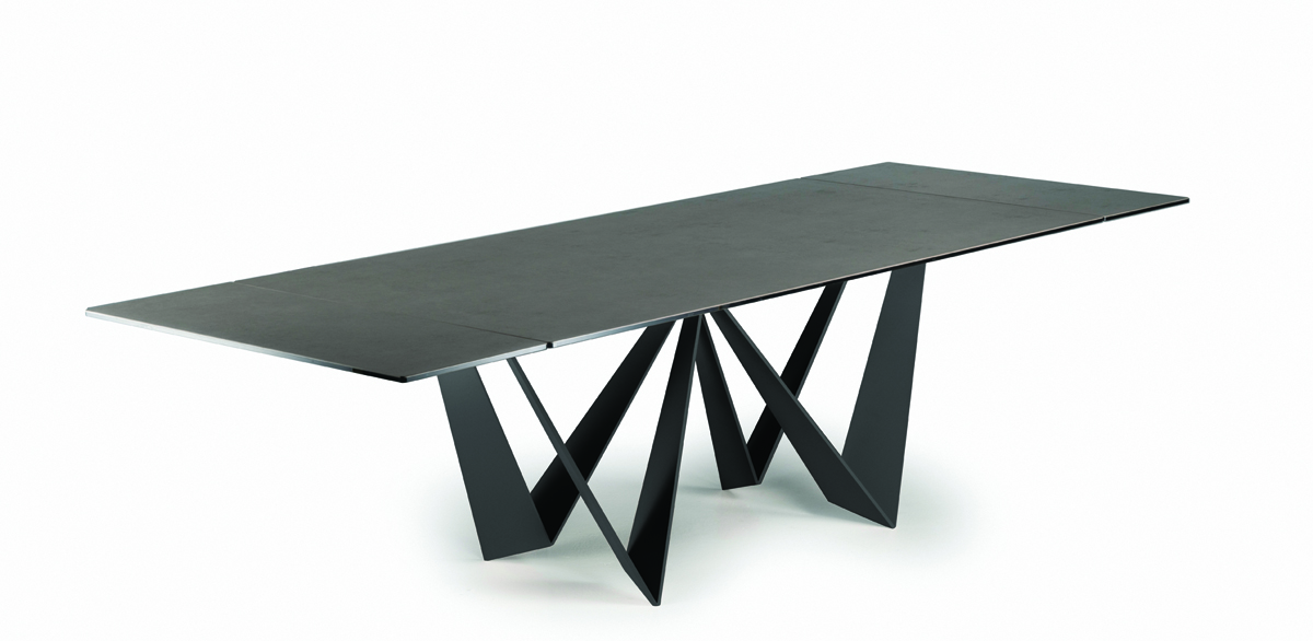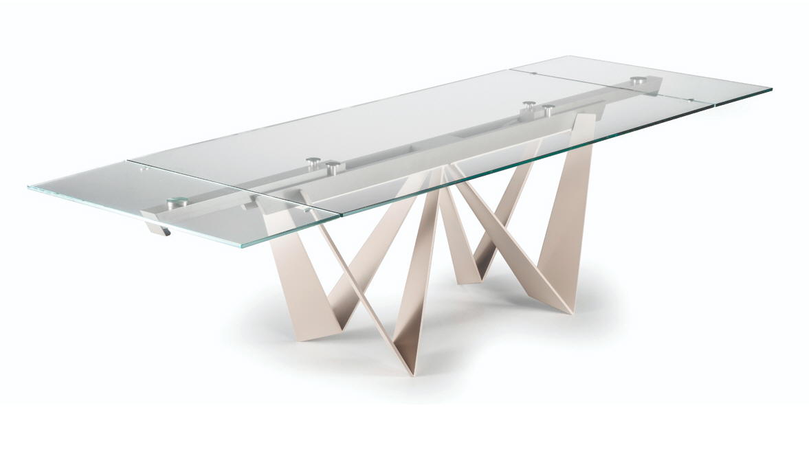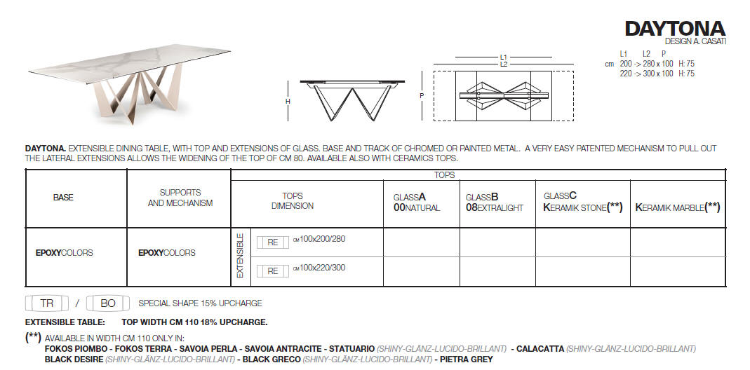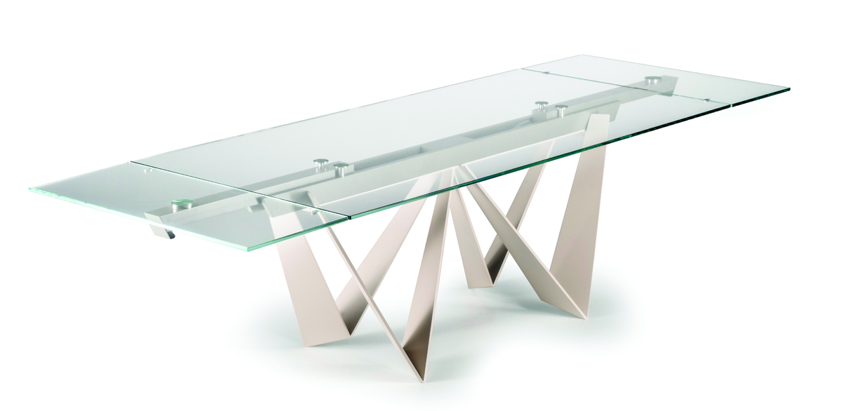 Designerski włoski stół DAYTONA - stół o wyjątkowym designie; podstawa metalowa; blaty i wkładka rozszerzająca szklane lub ceramiczne. Unikalny mechanizm rozkładający. Stół dostępny w wersji rozkładanej i nierozkładanej.