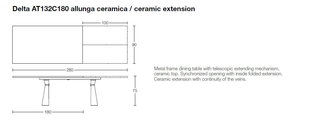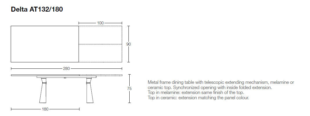 Nowoczesny włoski stół DELTA - stół o nowoczesnej konstrukcji; metalowa podstawa dostępna w 8 kolorach; dostępne trzy rozmiary stołu; stół rozkładany; blat: melamina, ceramiczny 3mm, ceramiczny 5mm. W przypadku stołu z blatem ceramicznym 3mm występują modele z wkładką powiększającą z materiału dopasowanego kolorystycznie lub z ceramiki takiej jak blat .