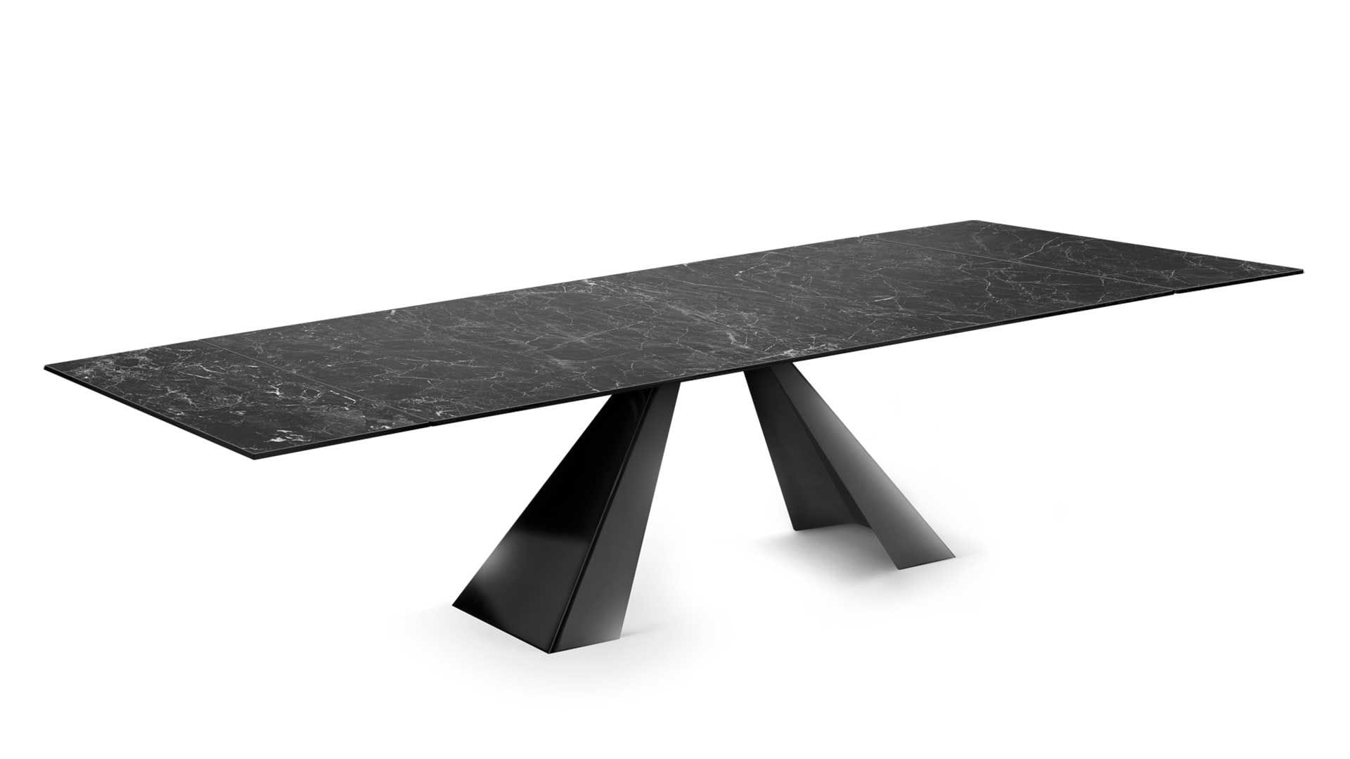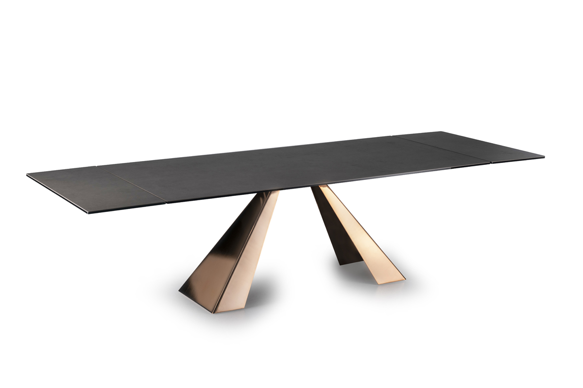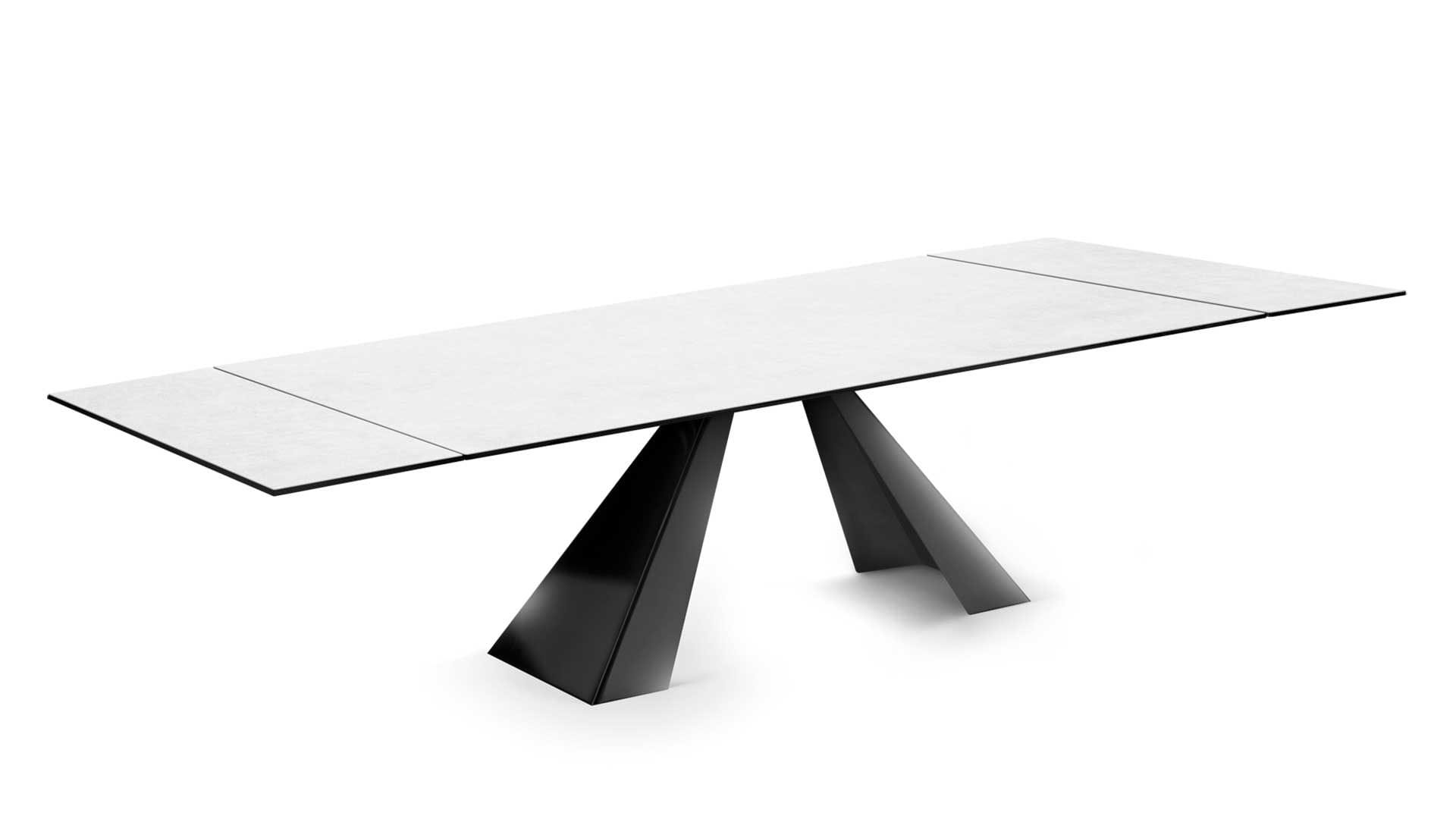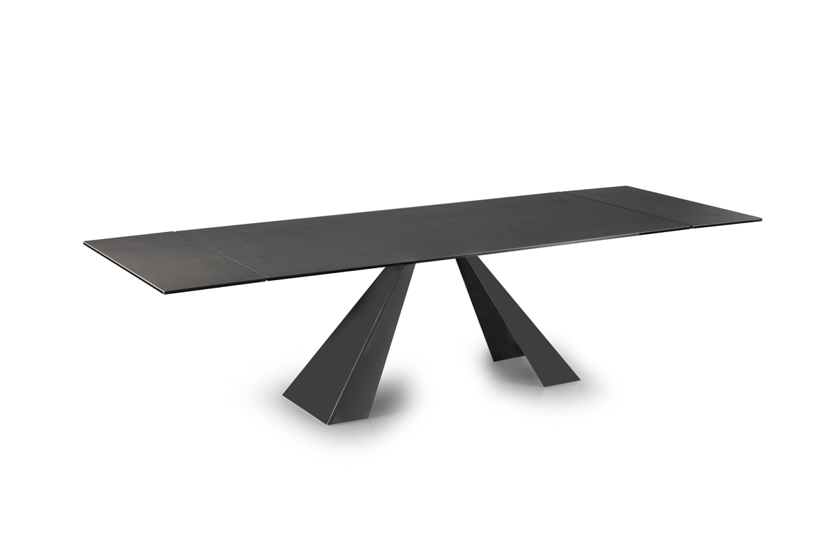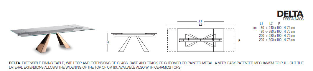 Designerski włoski stół DELTA - stół o wyjątkowym designie; podstawa metalowa; blaty i wkładka rozszerzająca szklane lub ceramiczne. Unikalny mechanizm rozkładający. Stół dostępny w wersji rozkładanej i nierozkładanej.