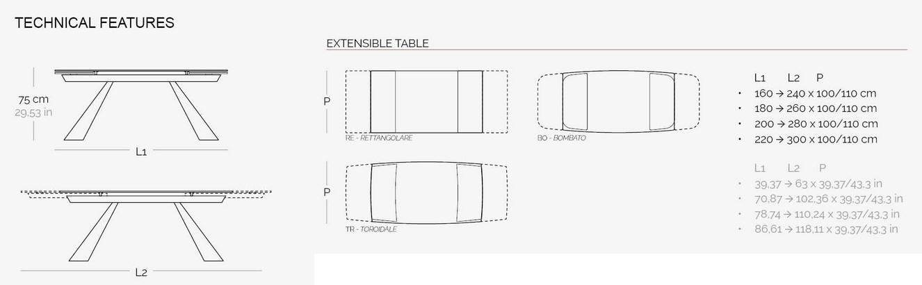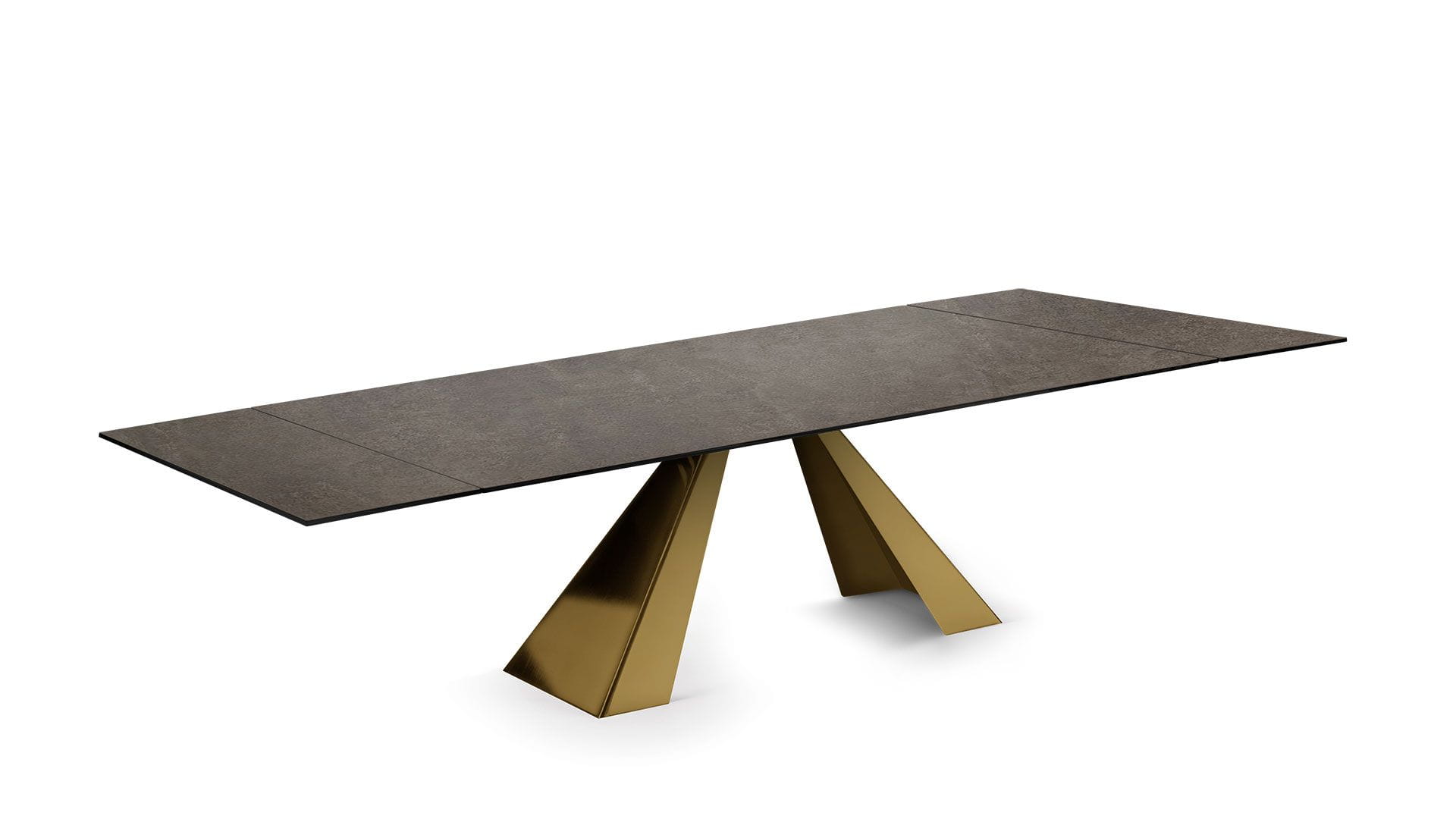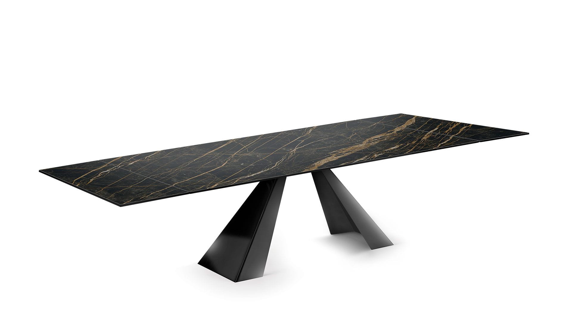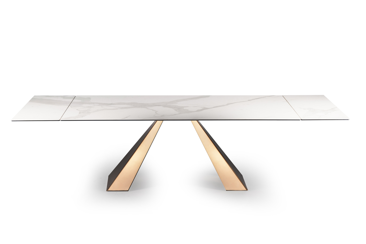 Designerski włoski stół DELTA - stół o wyjątkowym designie; podstawa metalowa; blaty i wkładka rozszerzająca szklane lub ceramiczne. Unikalny mechanizm rozkładający. Stół dostępny w wersji rozkładanej i nierozkładanej.
