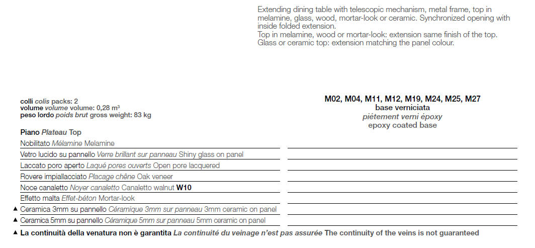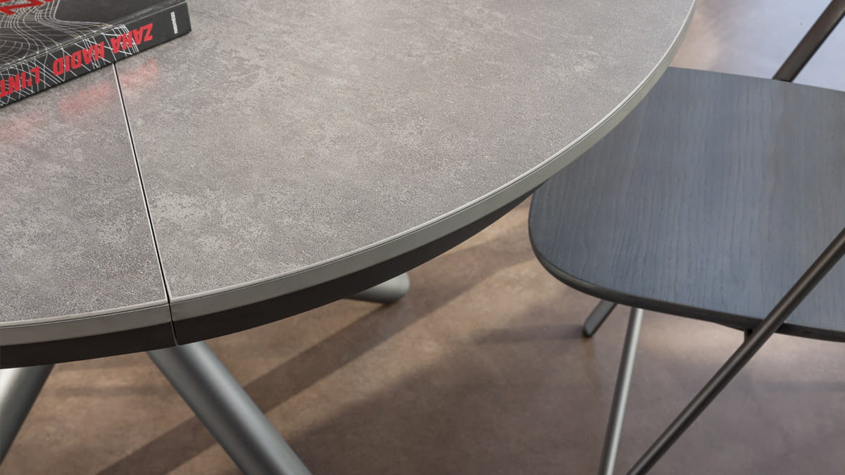 Nowoczesny włoski stół FAHRENHEIT Round - stół okrągły, rozkładany; podstawa metalowa o nowoczesnej linii; blat: melamina, szkło, open pore, oak veneer, moratr-look, ceramic 3mm, ceramic 5mm.