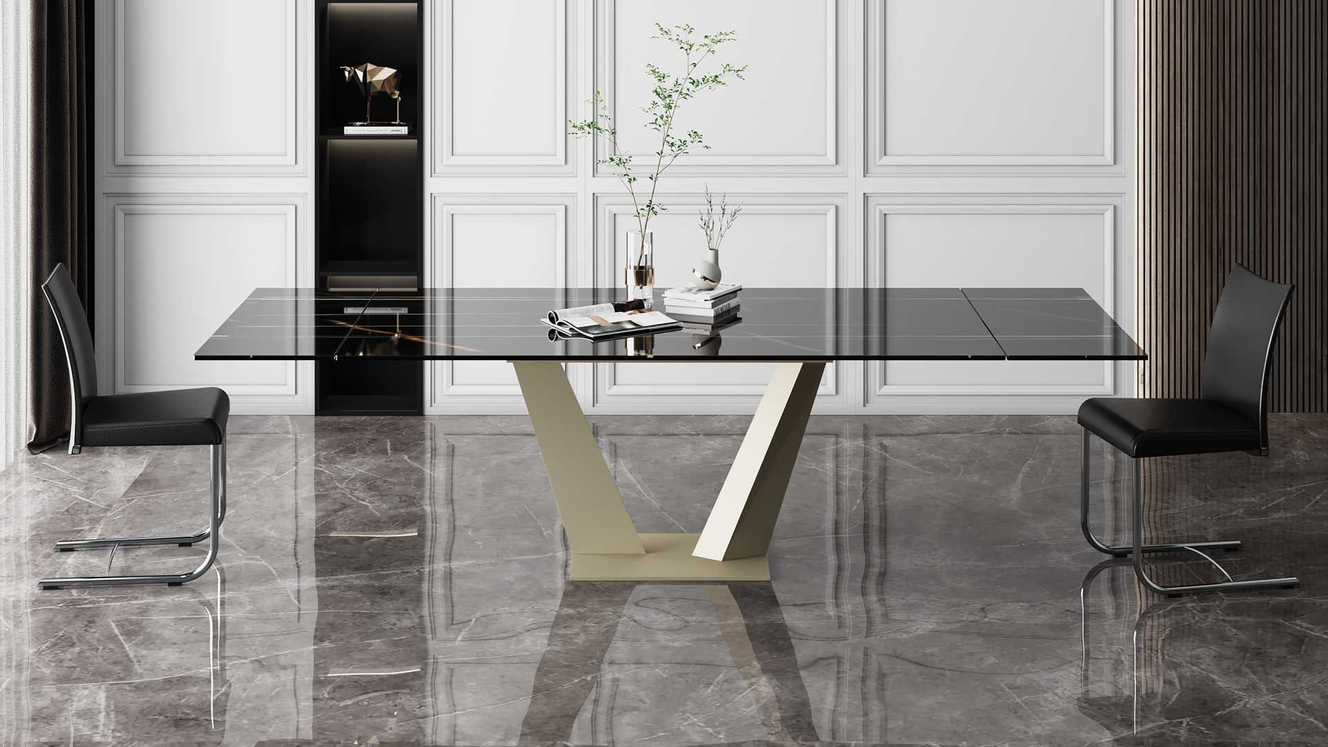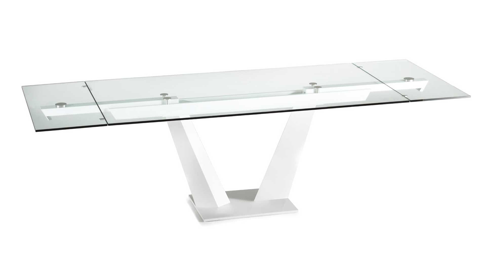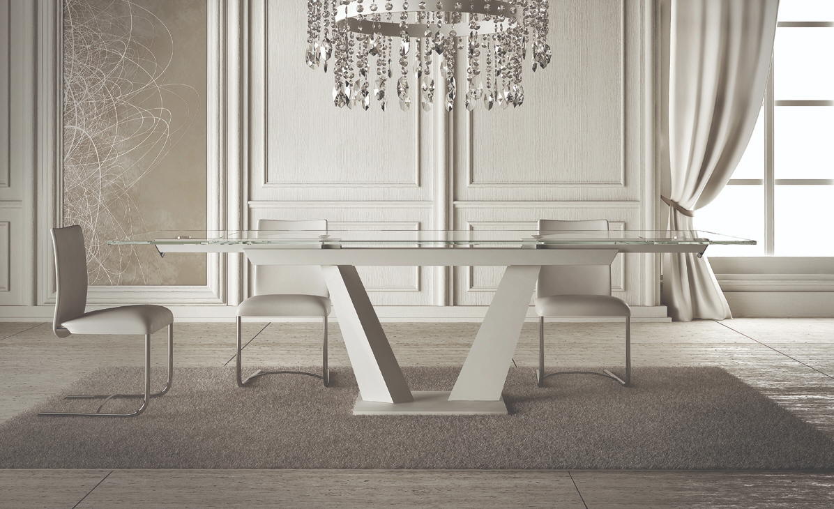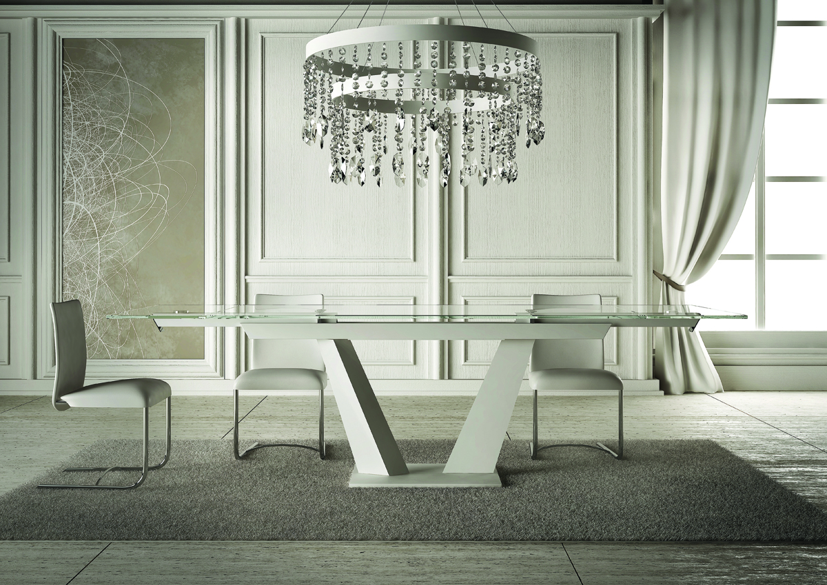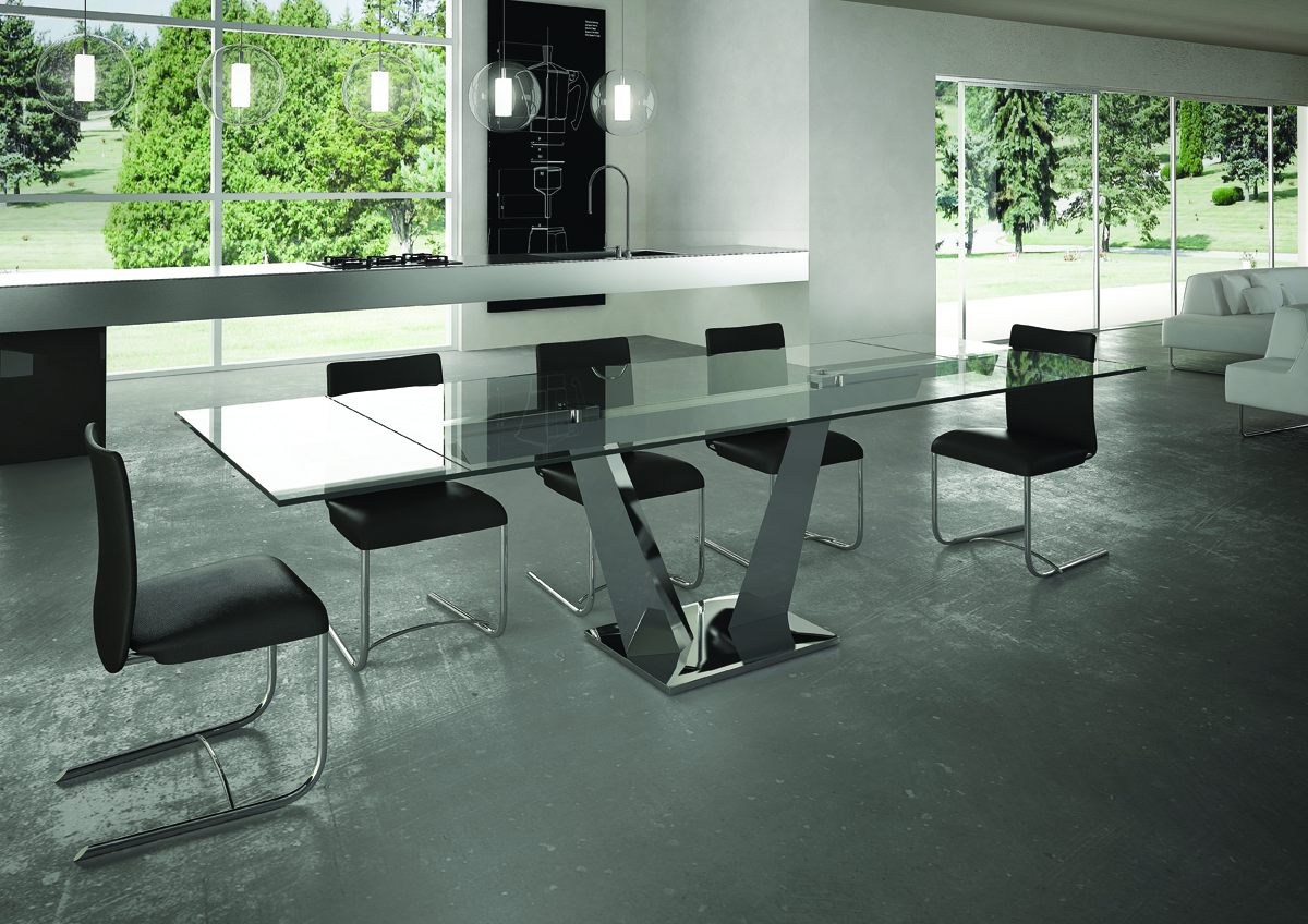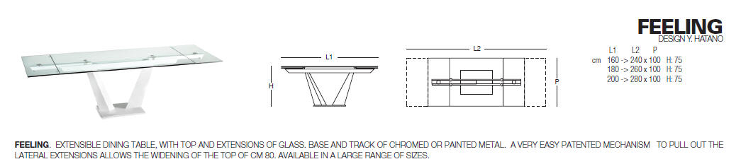 Designerski włoski stół FEELING - stół o wyjątkowym designie; podstawa metalowa; blaty i wkładka rozszerzająca szklane lub ceramiczne. Unikalny mechanizm rozkładający. Stół dostępny w wersji rozkładanej i nierozkładanej.