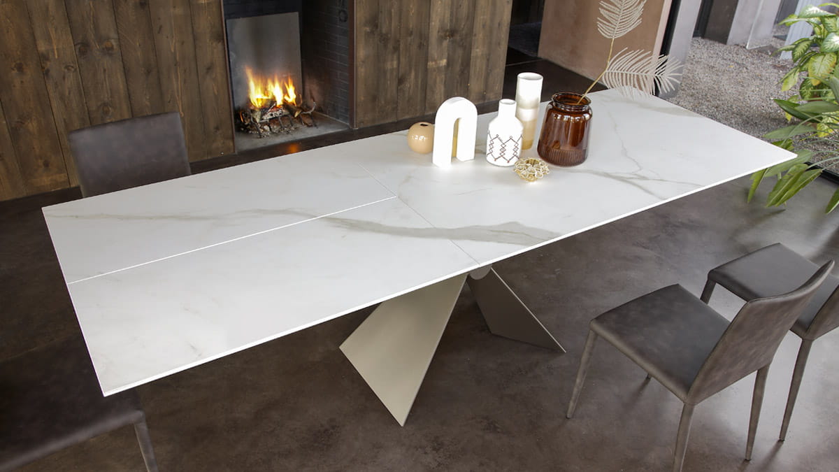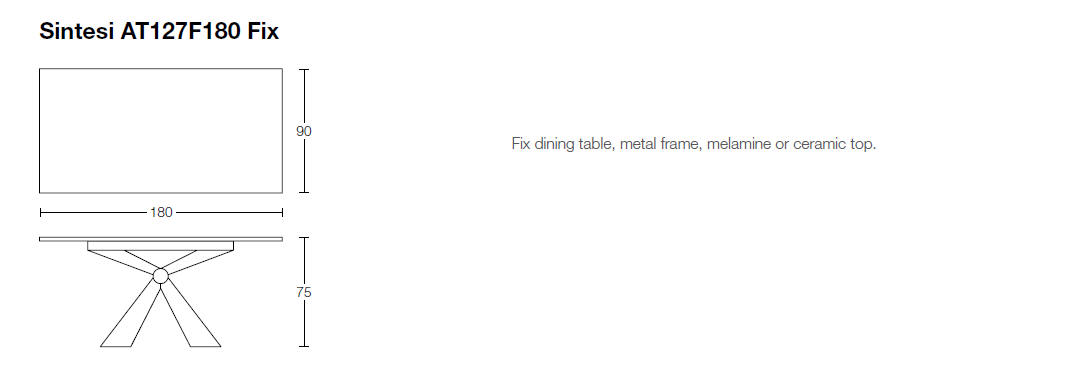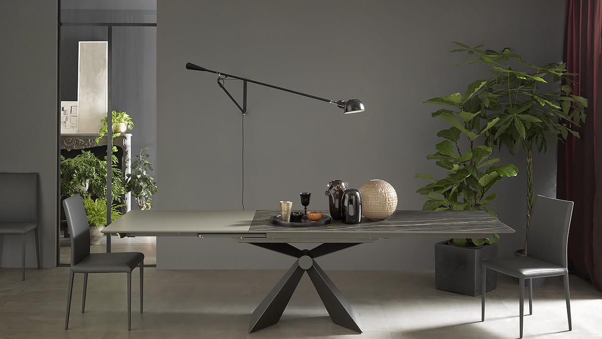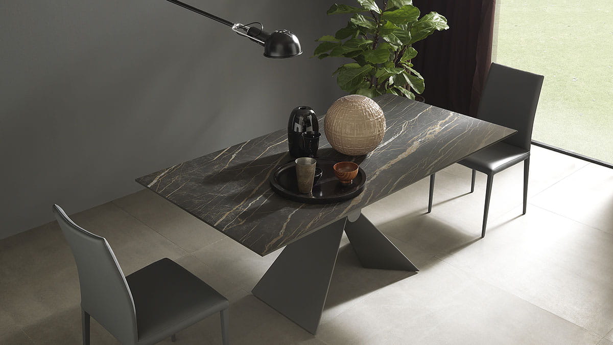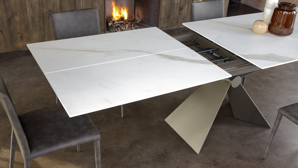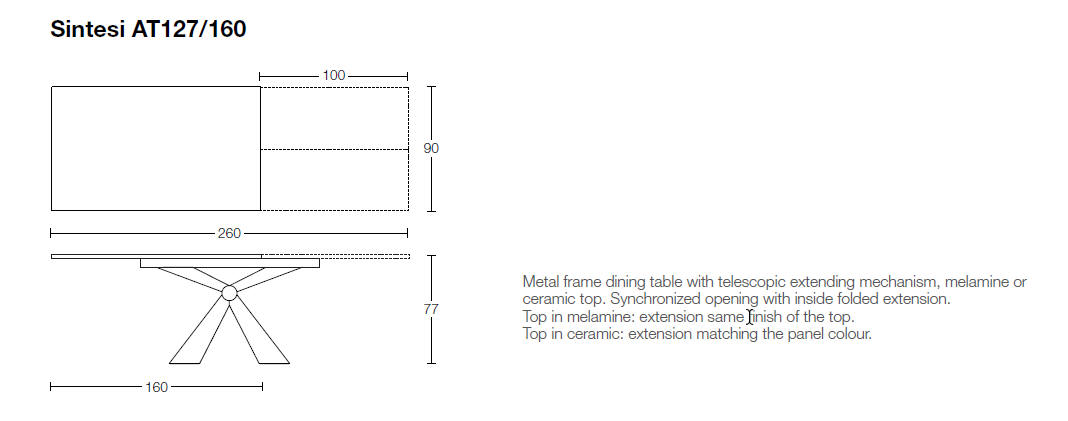 Nowoczesny włoski stół SINTESI - stół w wersji rozkładanej lub nierozkładanej; podstawa metalowa o interesującym kształcie; blat ceramiczny lub laminowany melaminą; dostępnych kilka rozmiarów. Stół wyposażony w system łatwego rozkładania; blat: melamina, ceramiczny 3mm, ceramiczny 5mm. W przypadku stołu rozkładanego z blatem ceramicznym 3mm występują modele z wkładką powiększającą z materiału dopasowanego kolorystycznie lub z ceramiki takiej jak blat .