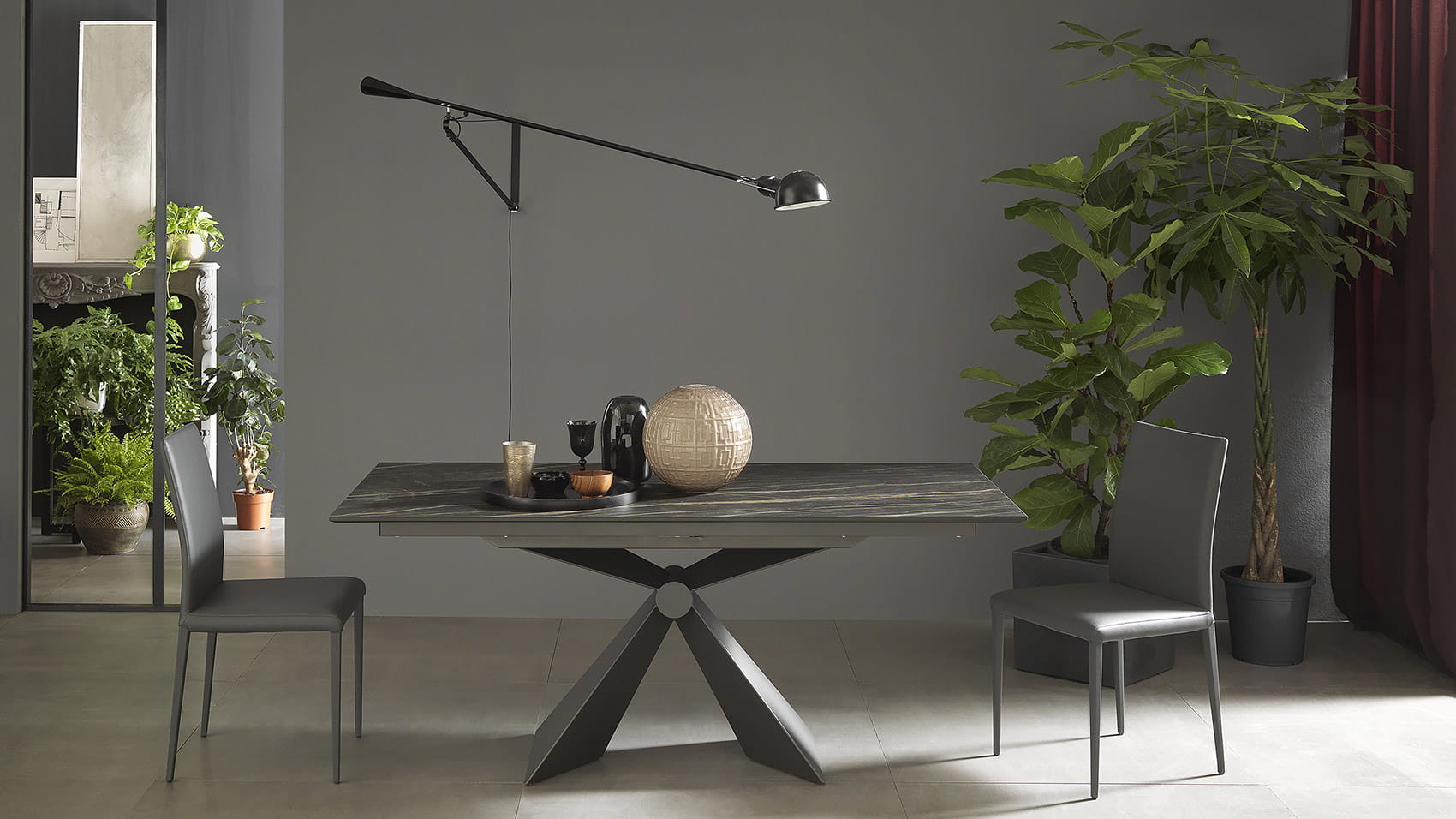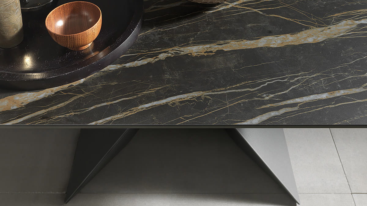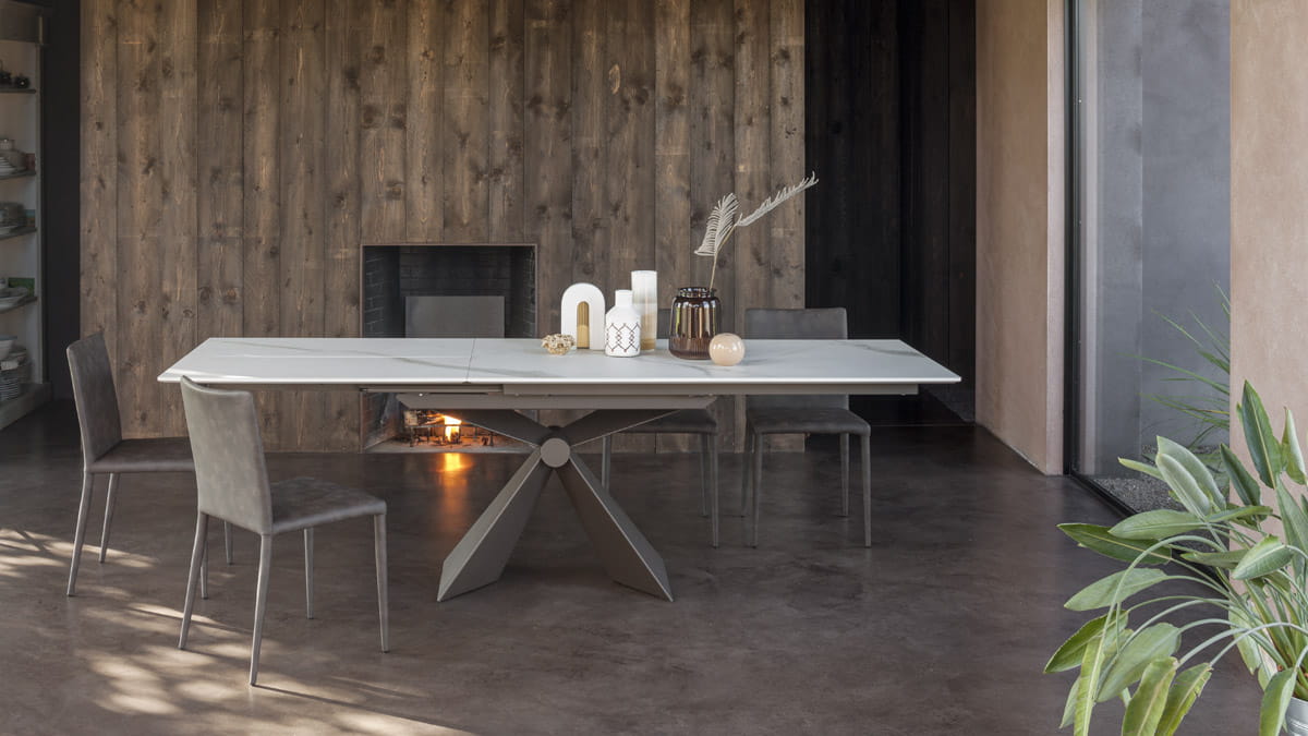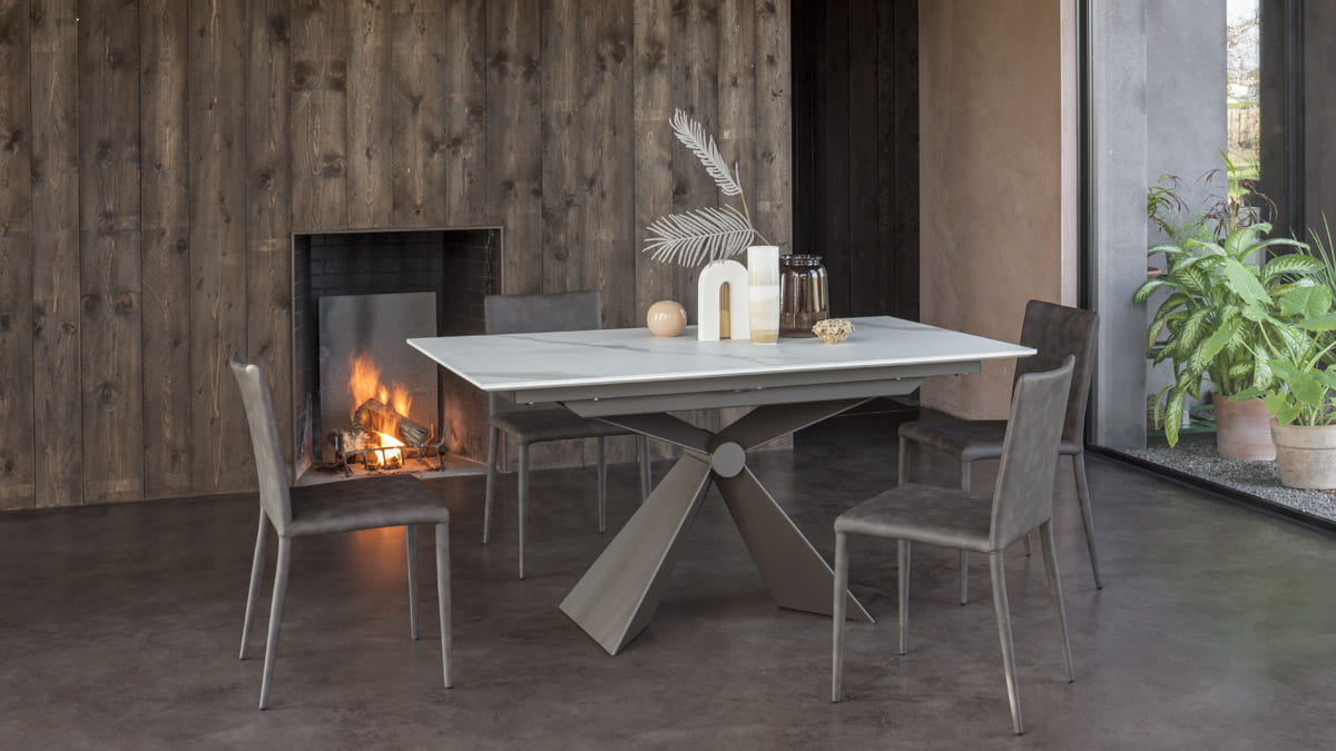 Nowoczesny włoski stół SINTESI - stół w wersji rozkładanej lub nierozkładanej; podstawa metalowa o interesującym kształcie; blat ceramiczny lub laminowany melaminą; dostępnych kilka rozmiarów. Stół wyposażony w system łatwego rozkładania; blat: melamina, ceramiczny 3mm, ceramiczny 5mm. W przypadku stołu rozkładanego z blatem ceramicznym 3mm występują modele z wkładką powiększającą z materiału dopasowanego kolorystycznie lub z ceramiki takiej jak blat .