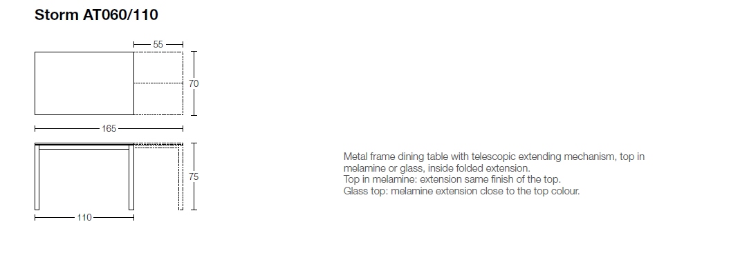 - AT060/110 wymiary: 110-165x70xh75 cm rozkładany, cena od 3 166 zł brutto (dotyczy wariantu z blatem melamina)