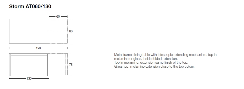 - AT060/130 wymiary: 130-190x80xh75 cm rozkładany, cena od 3 659 zł brutto dotyczy wariantu z blatem melamina)
