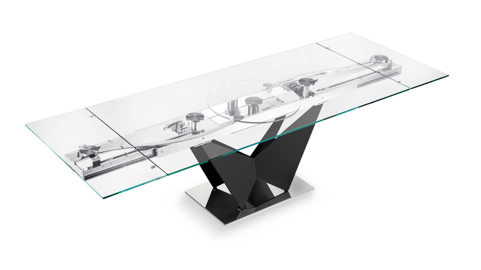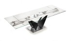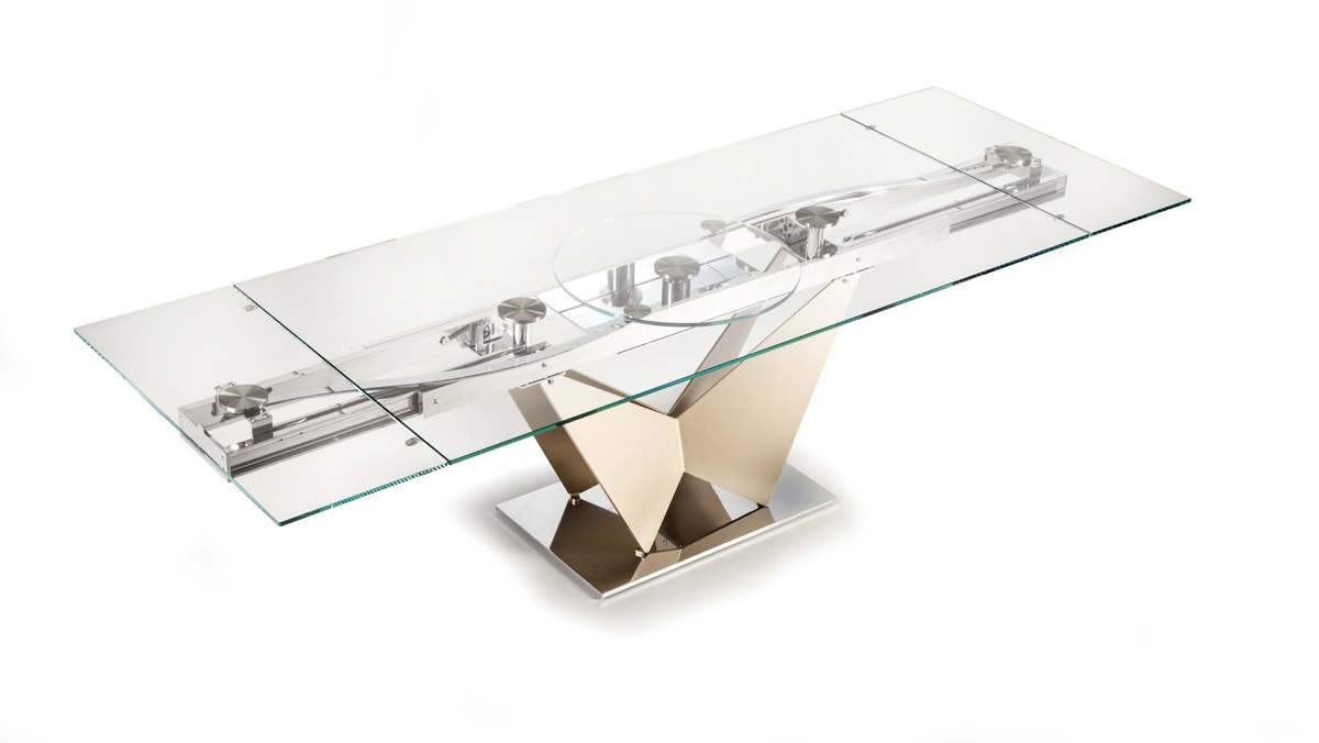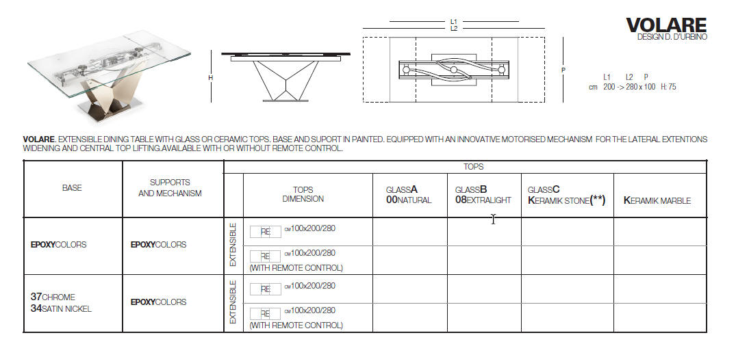 Designerski włoski stół VOLARE - stół o intrygującym designie; podstawa lakierowana stal lub chrom; blat szkło, szkło lakierowane lub blat ceramiczny. Unikalny mechanizm rozkładania pozwalający na proste rozkładanie stołu. Możliwość wyposażenia stołu w pilota rozkładającego stół.