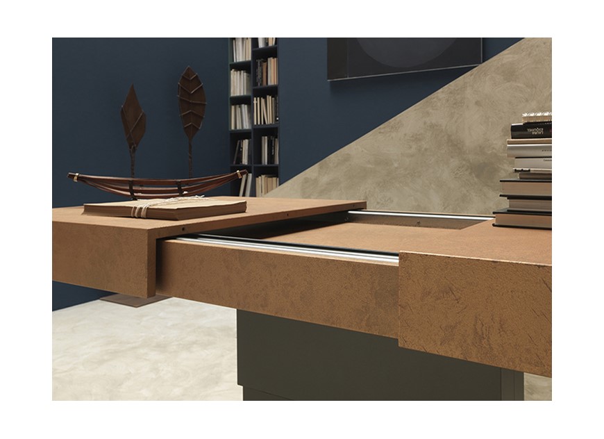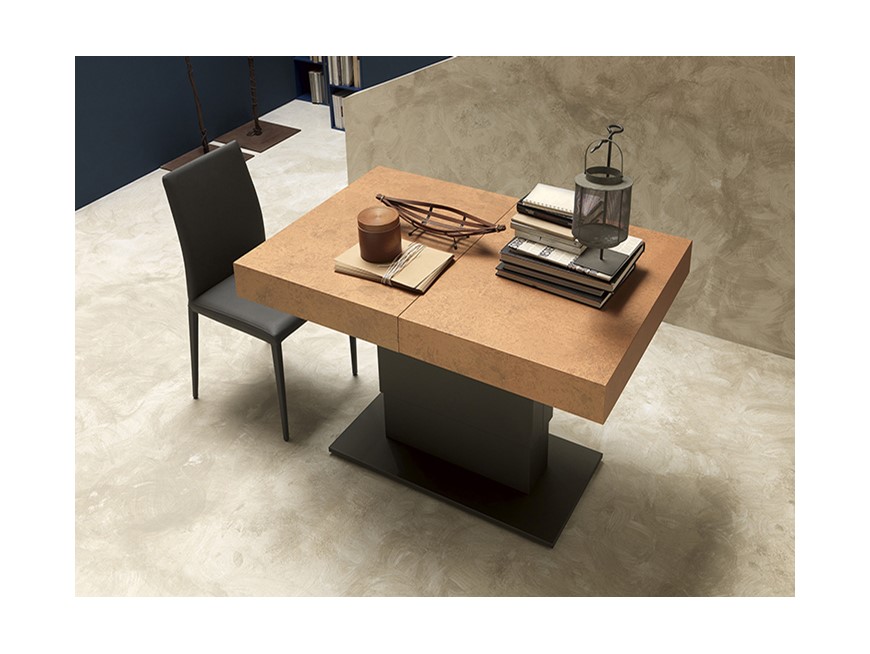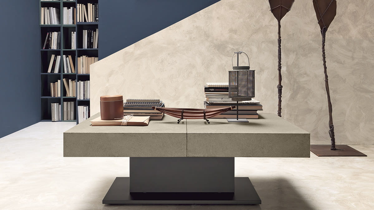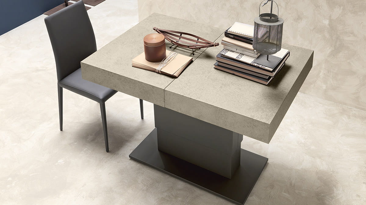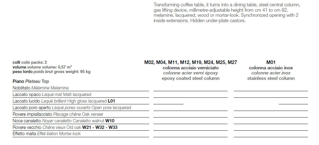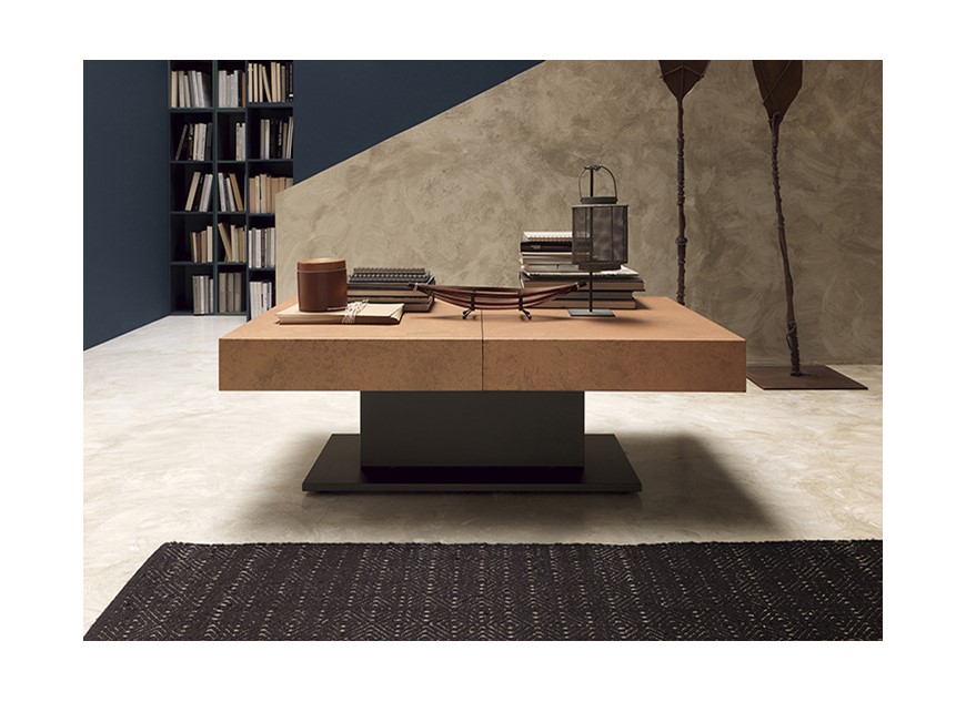 Nowoczesny włoski stolik podnoszony rozkładany do wielkości stołu ARES FOLD - stół regulowany ze stolika kawowego do stołu jadalnianego; centralna baza ze stali; mechanizm podnoszenia gazowy; regulacja wysokości od 41 cm do 82 cm; blat: melamina, Matt lacquered, High gloss lacquered, Open pore lacquered, Oak veneer, Solid Wood, Mortar-look.