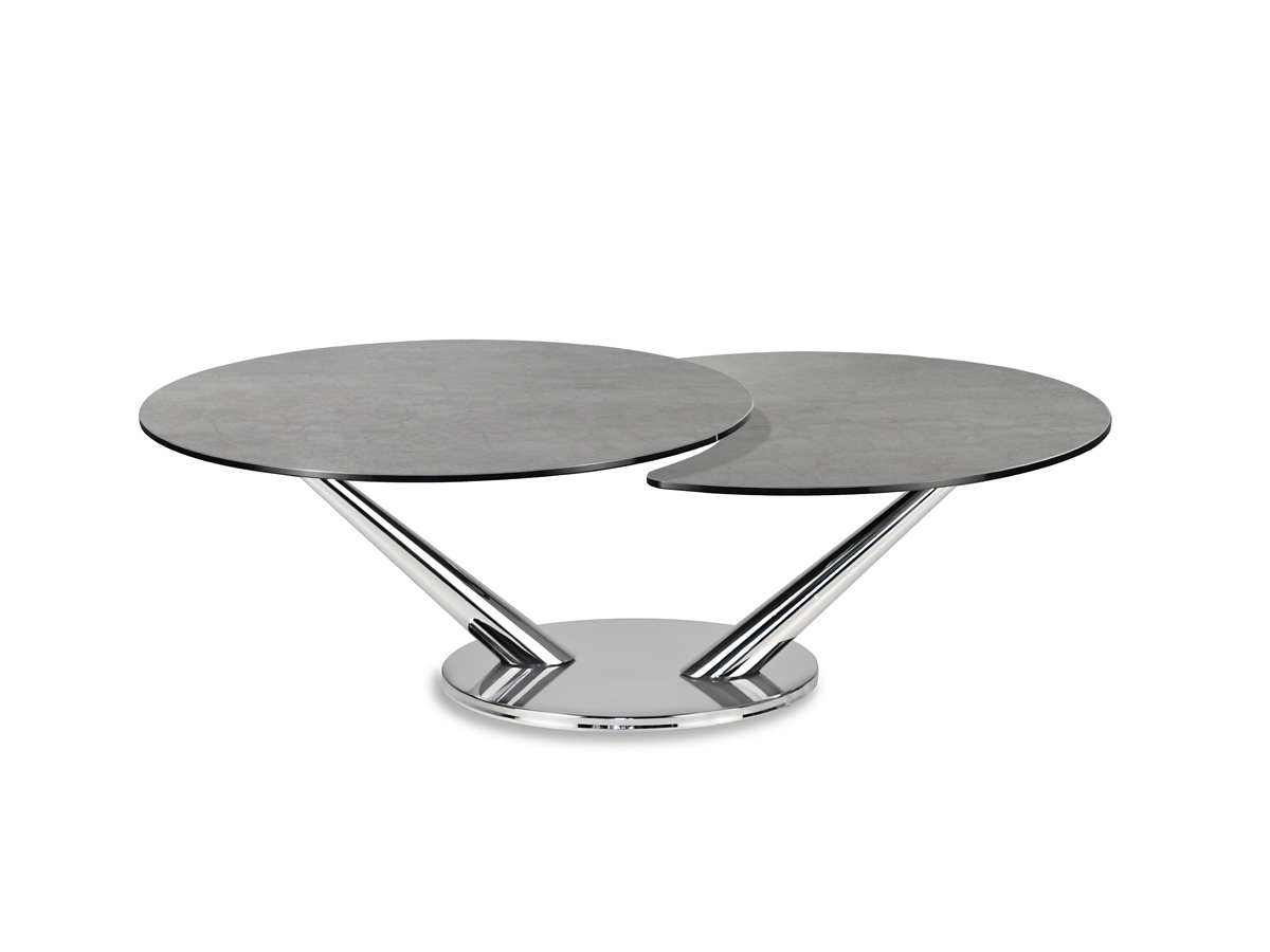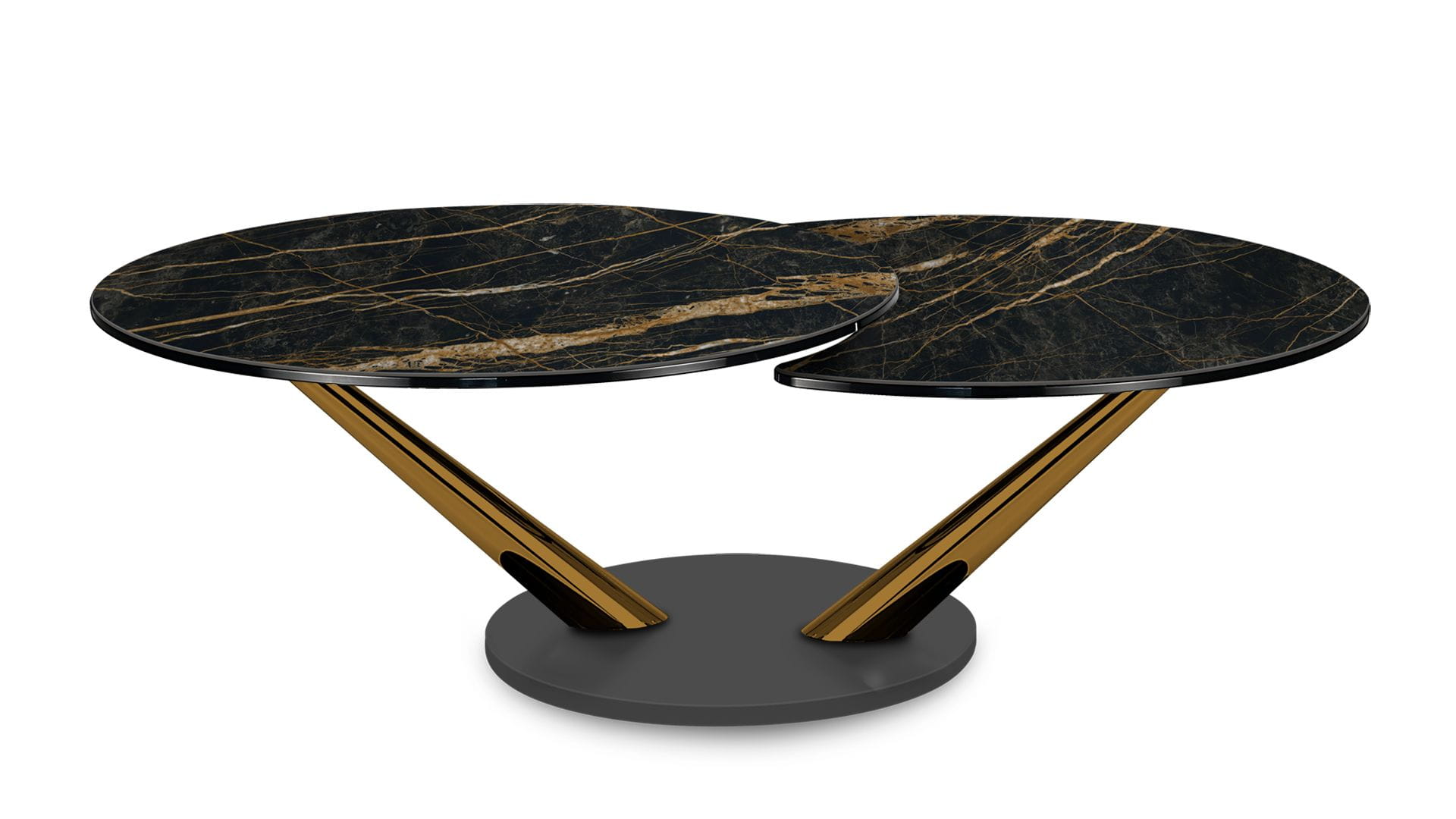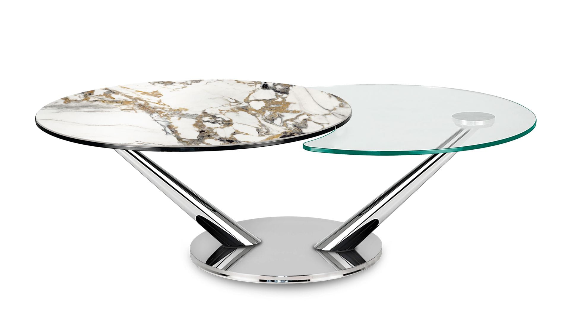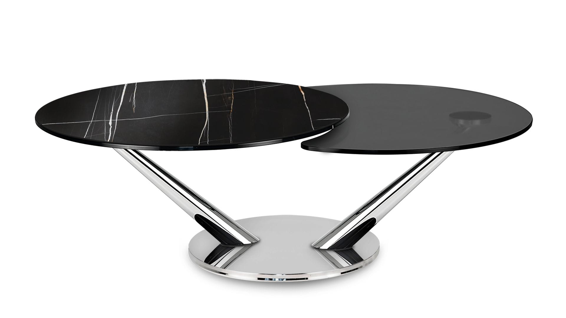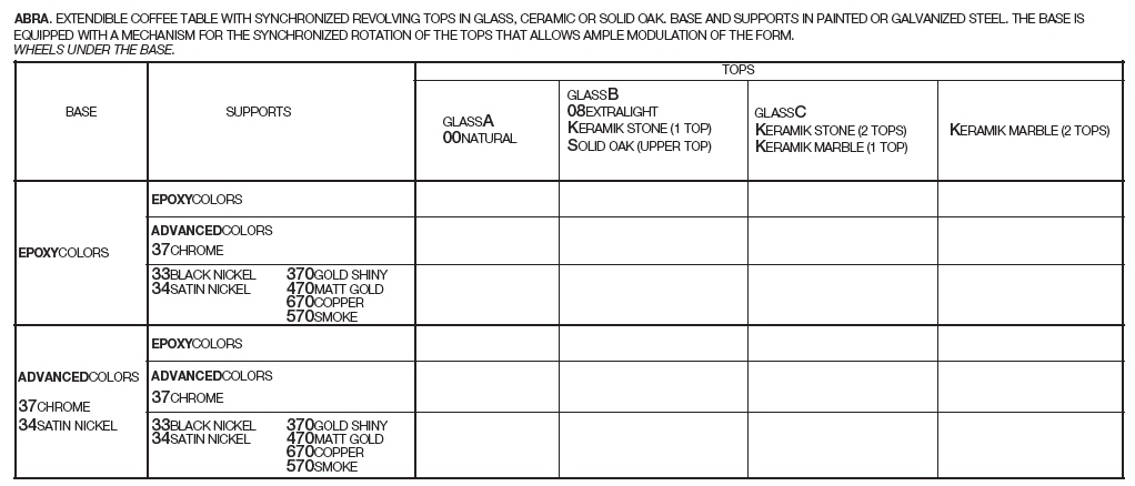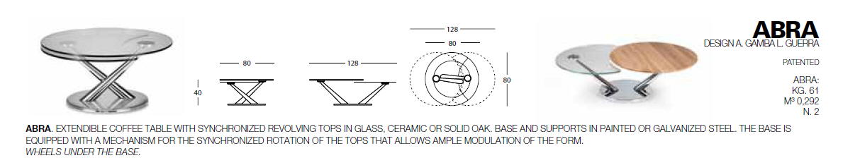 Designerski włoski stolik kawowy ABRA - stolik o intrygującym designie; podstawa metalowa; blaty szkło, ceramiczne. Unikalny mechanizm rozkładający. W podstawie ukryte kółka ułatwiające przesuwanie.