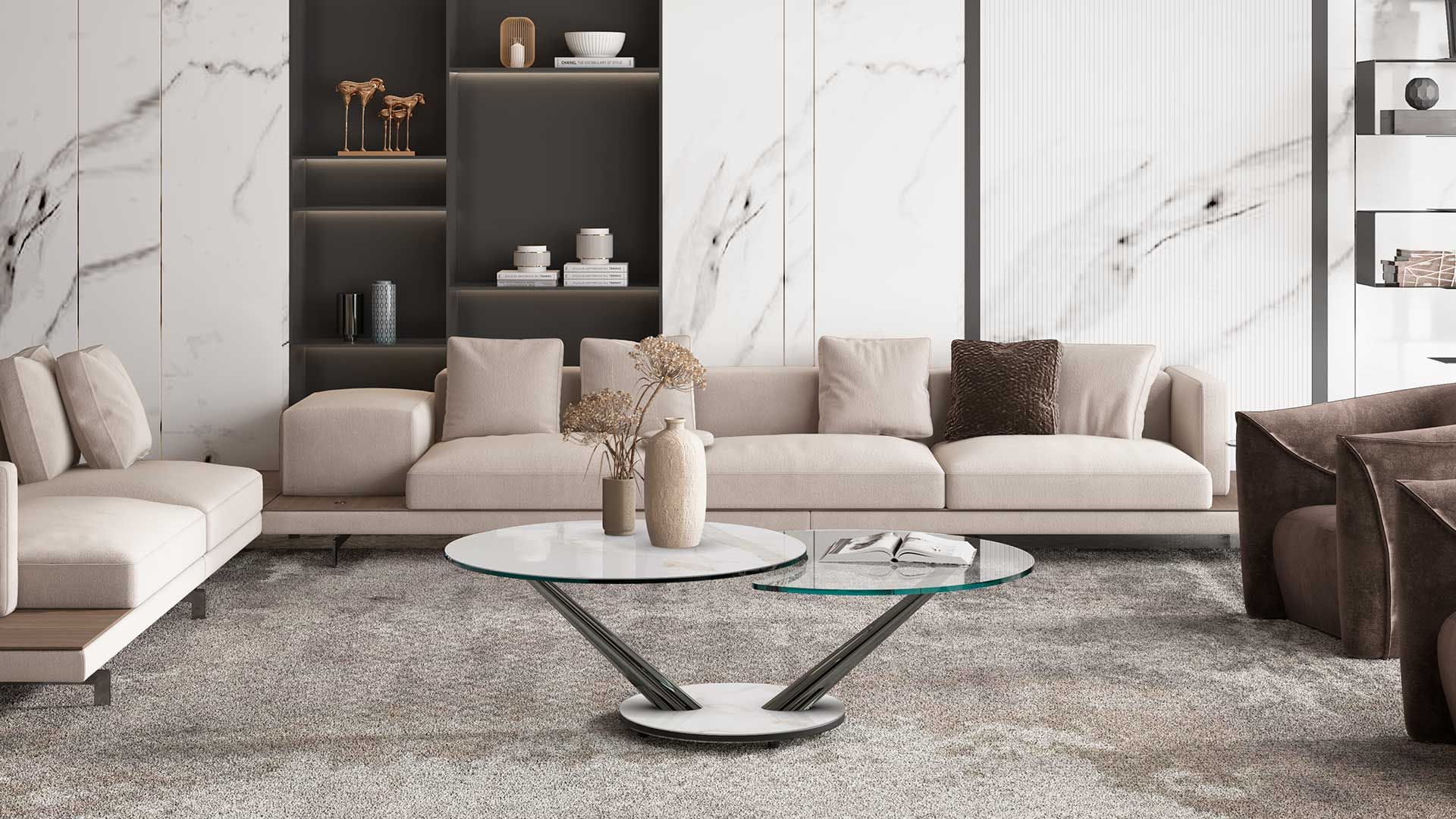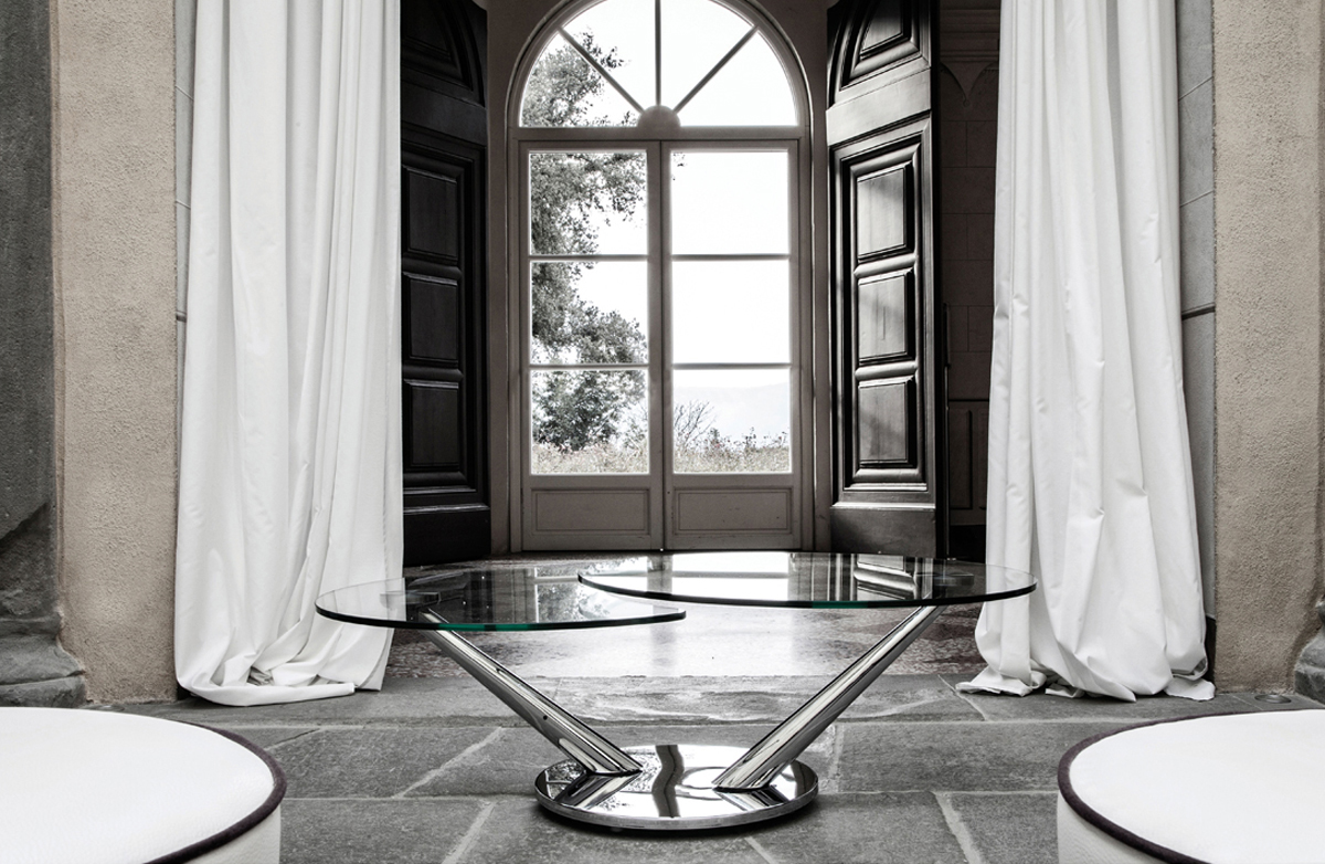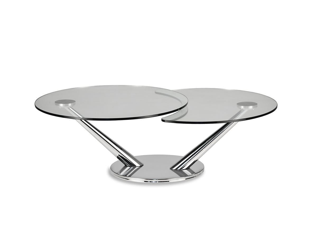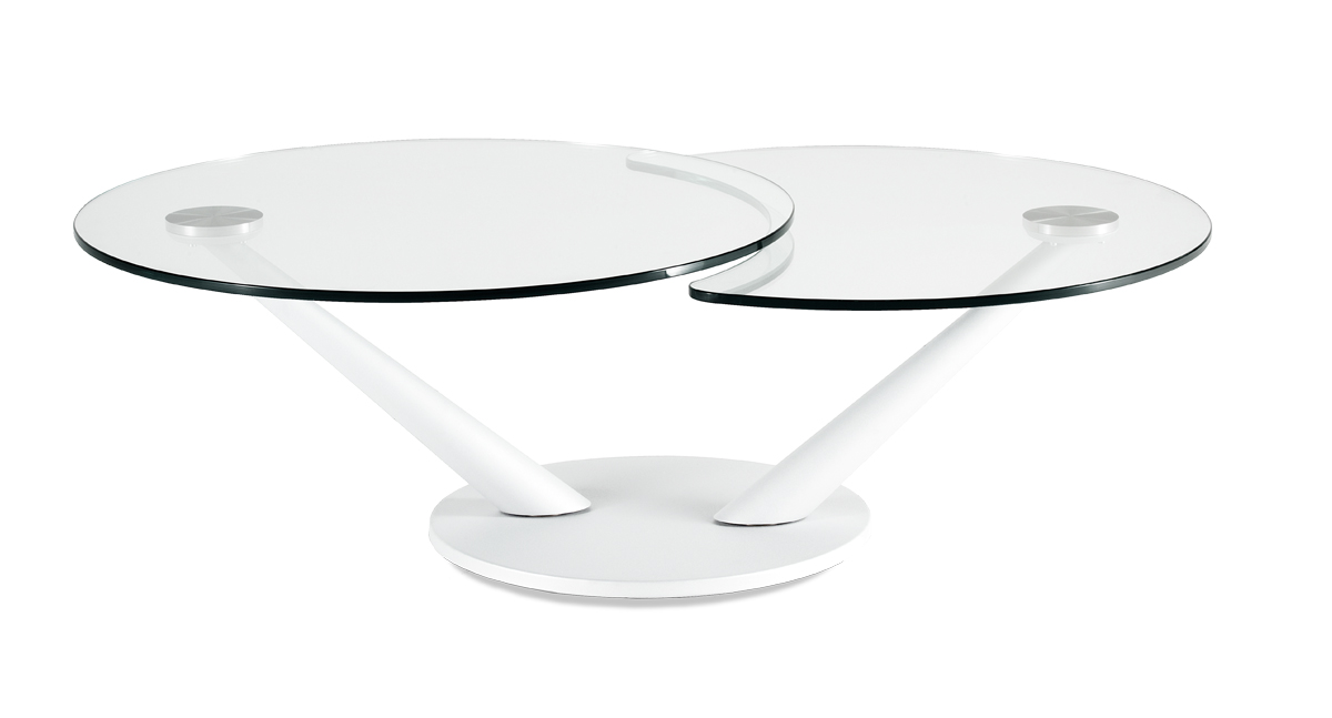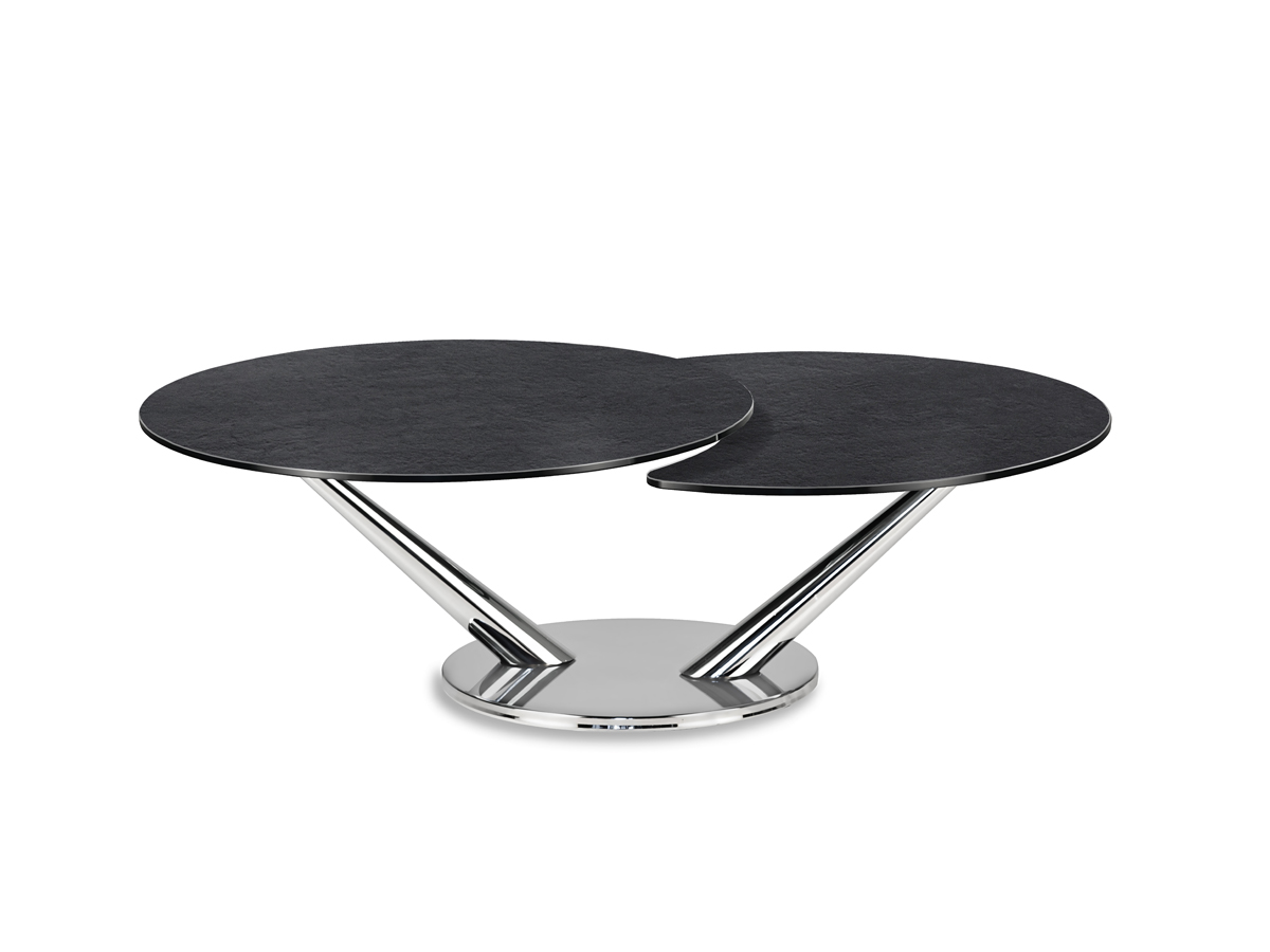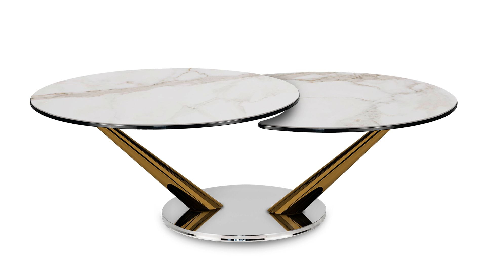 Designerski włoski stolik kawowy ABRA - stolik o intrygującym designie; podstawa metalowa; blaty szkło, ceramiczne. Unikalny mechanizm rozkładający. W podstawie ukryte kółka ułatwiające przesuwanie.