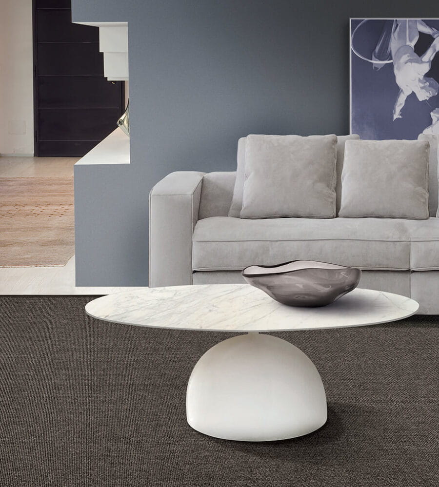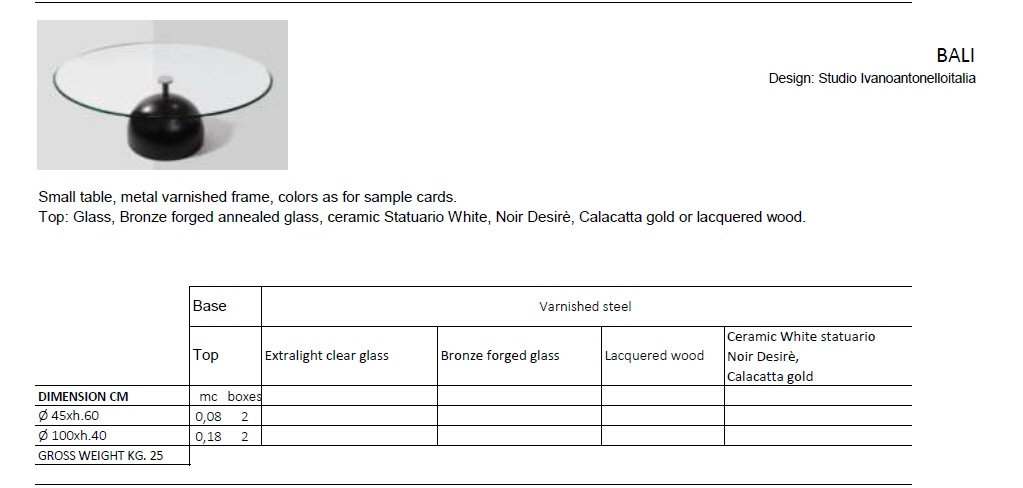 Stolik kawowy BALI - nowoczesny włoski stolik okrągły; podstawa metalowa; blat ze szkła kutego o wyjątkowej strukturze, szkła transparentnego, z lakierowanego drewna lub ceramiczny. Stolik dostępny w dwóch rozmiarach.