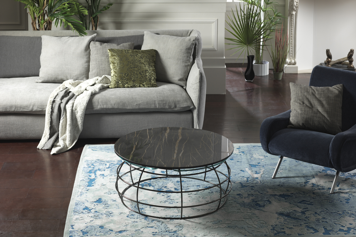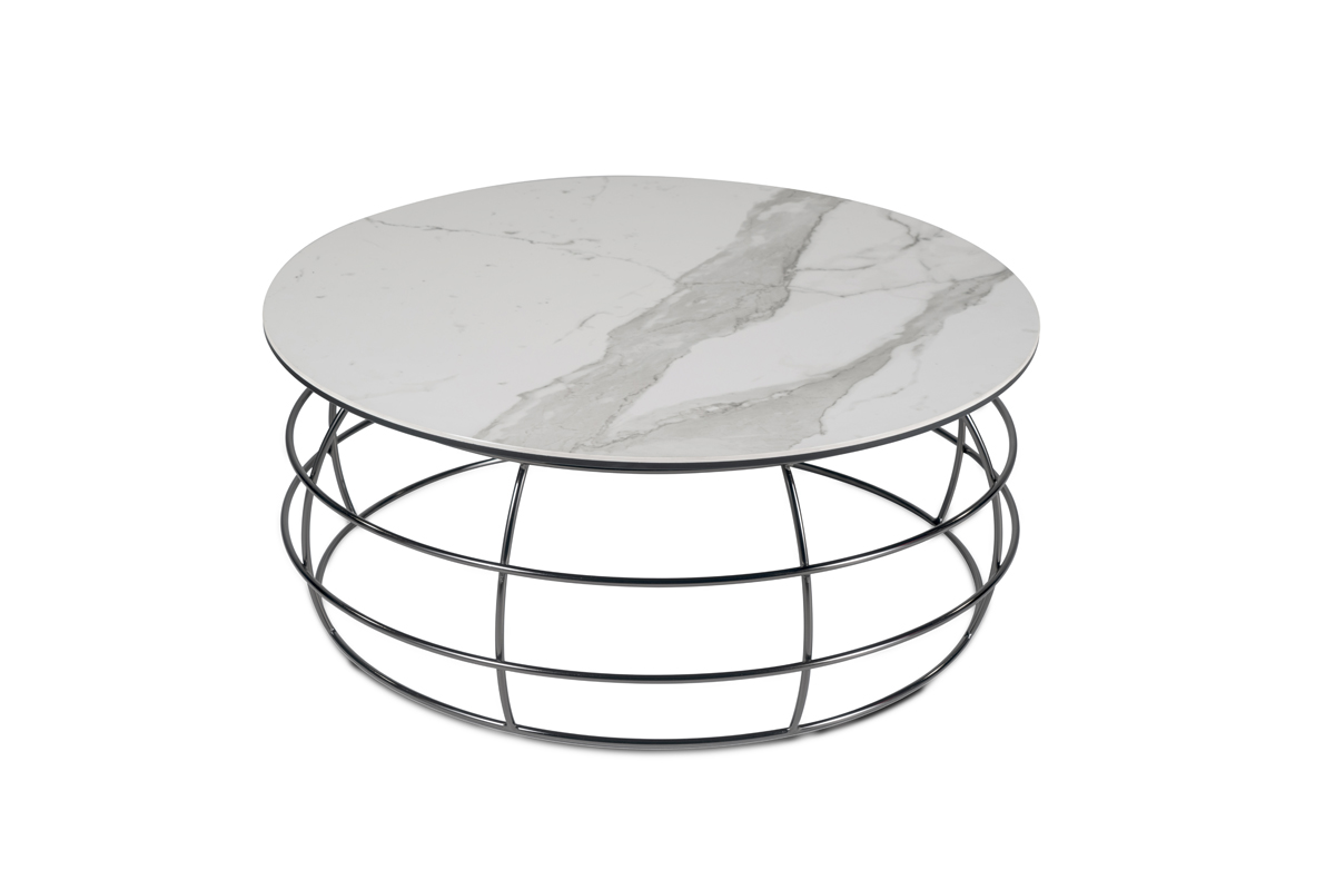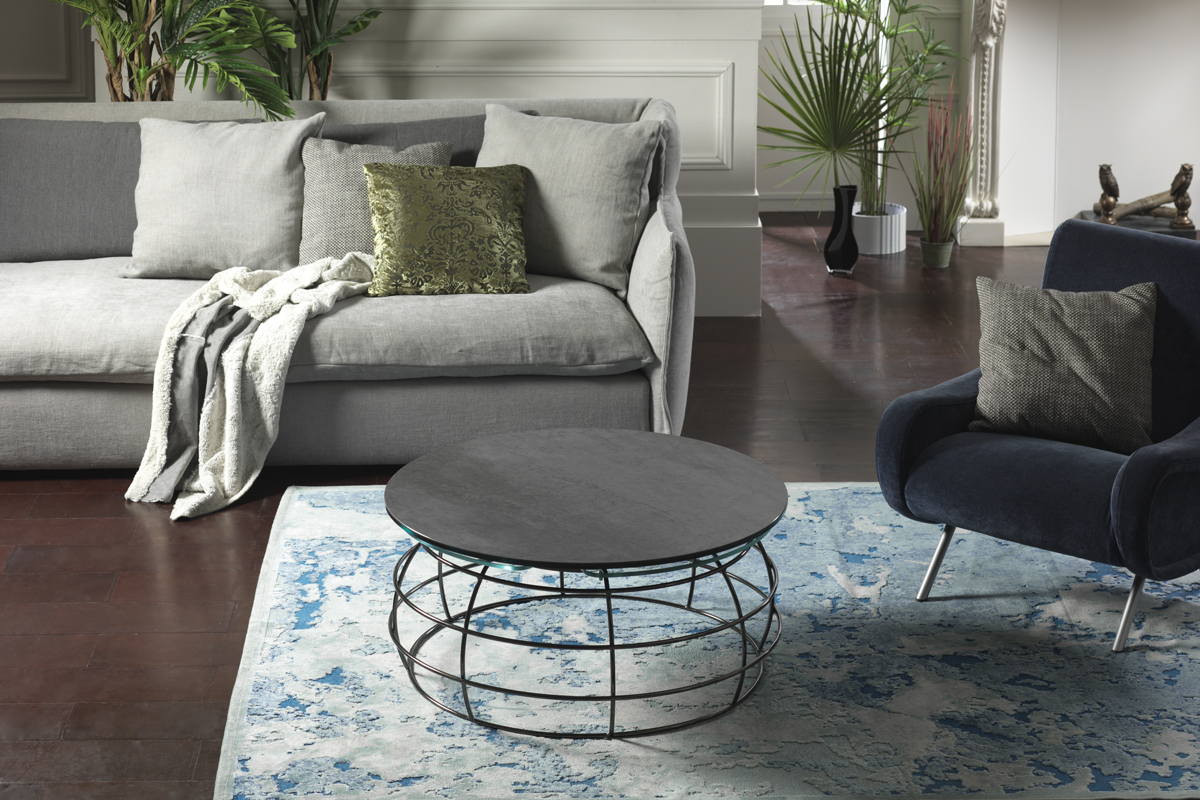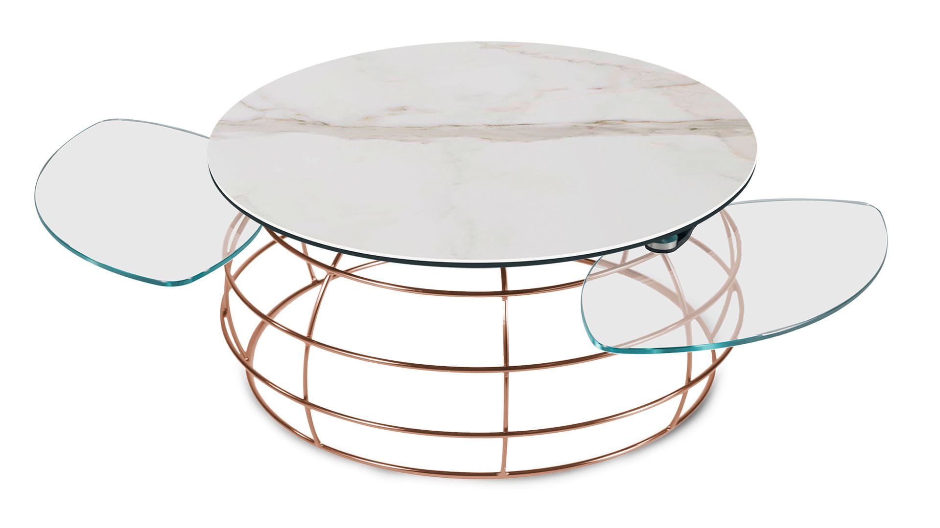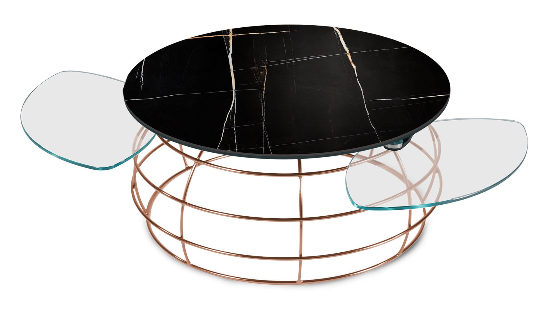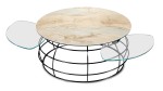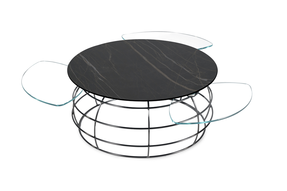 Designerski włoski stolik kawowy BARRIQUE - stolik o intrygującym designie; podstawa metalowa; centralny blat ceramiczny, trzy blaty pomocnicze ceramiczne lub szklane. Opcjonalnie możliwość wyposażenia w wyjątkowy mechanizm rozkładający.
