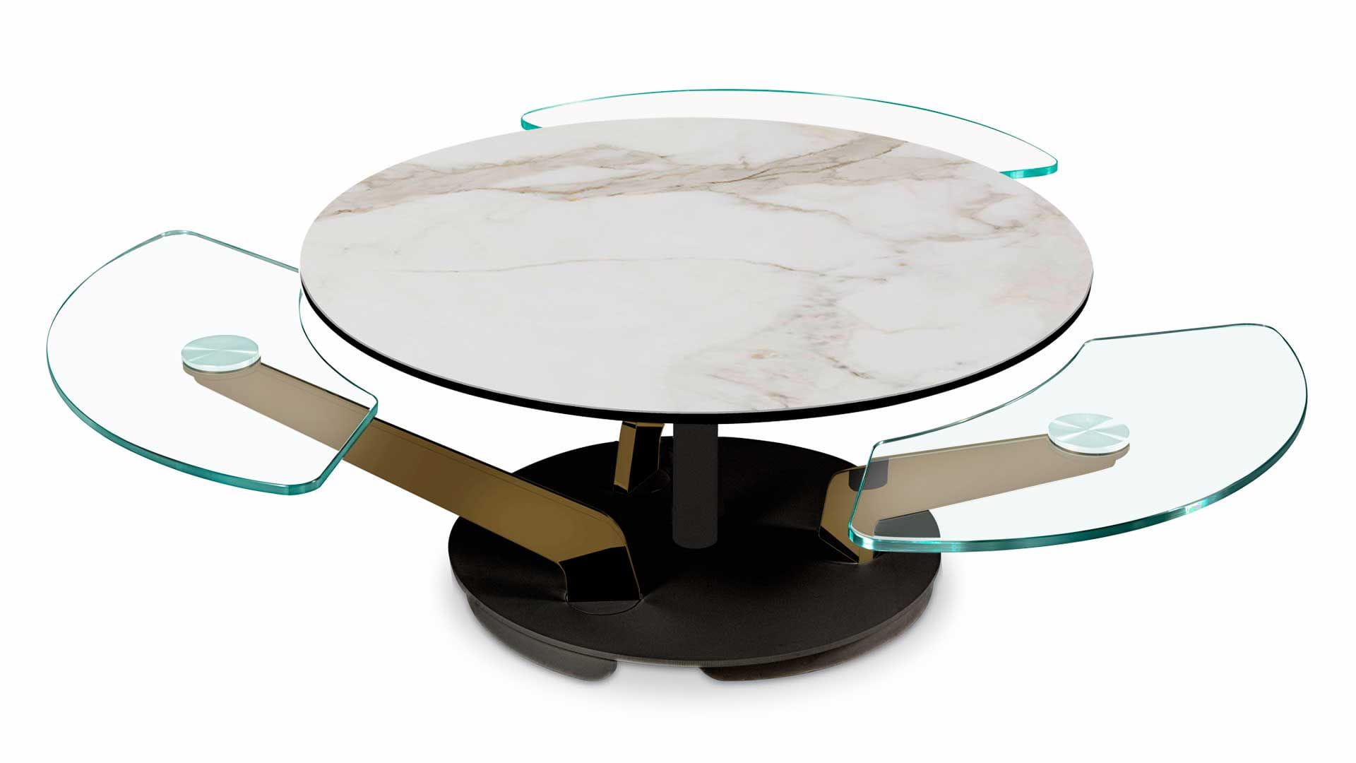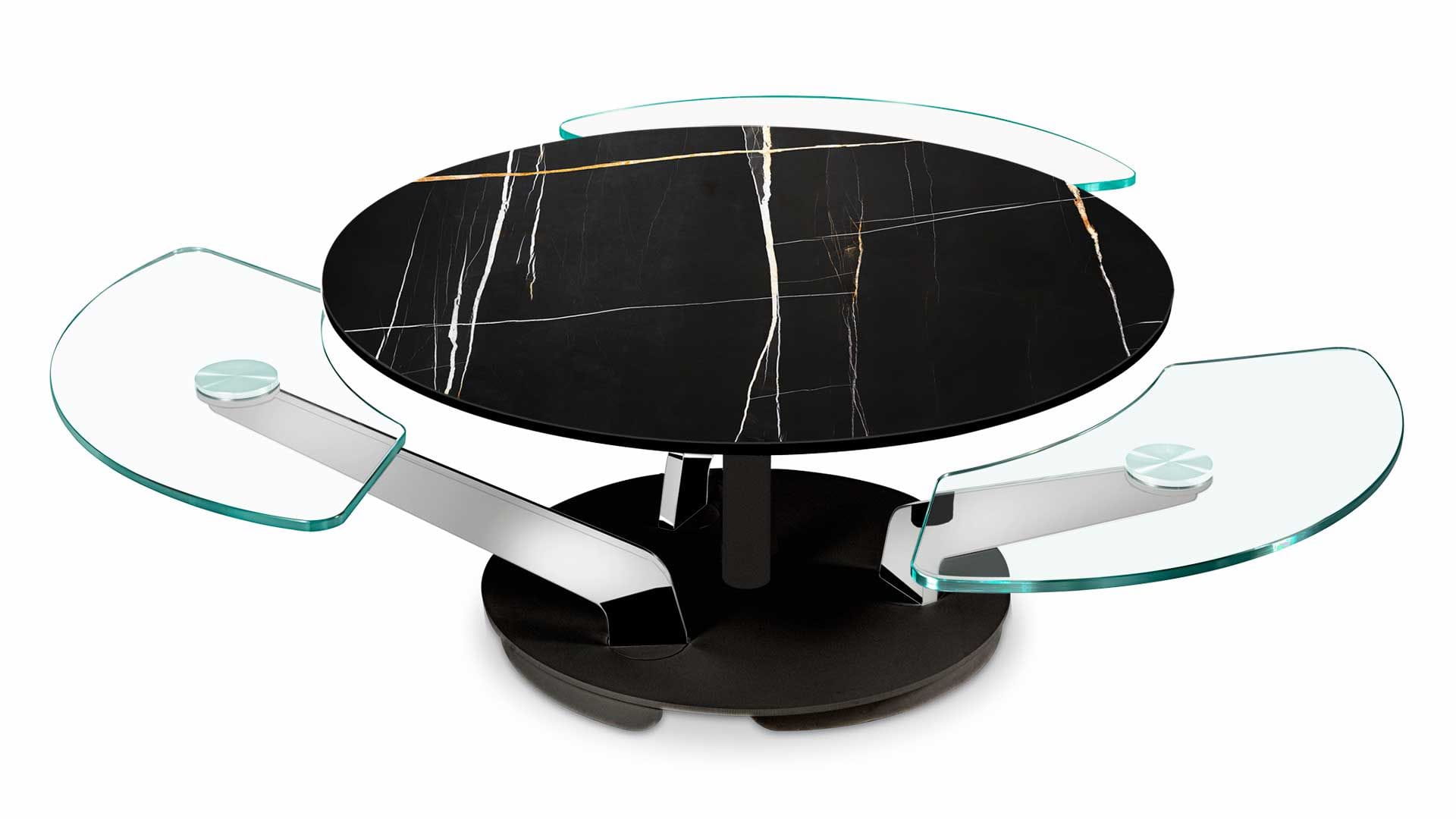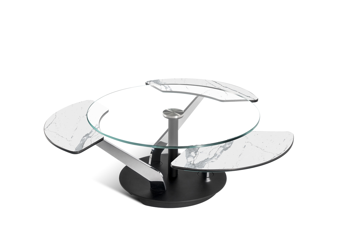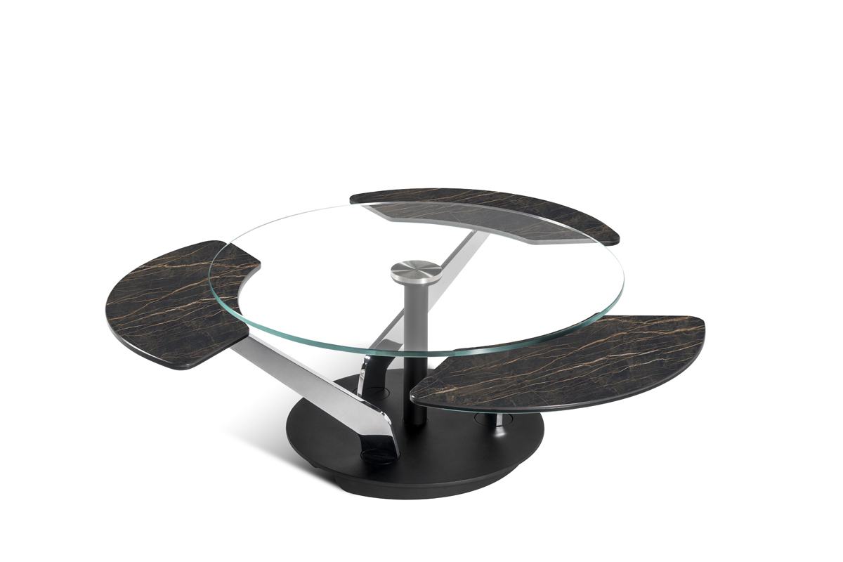 Designerski włoski stolik kawowy BLOSSOM - stolik o intrygującym designie; podstawa metalowa; centralny blat i trzy blaty pomocnicze ceramiczne lub szklane. Unikalny mechanizm rozkładający.