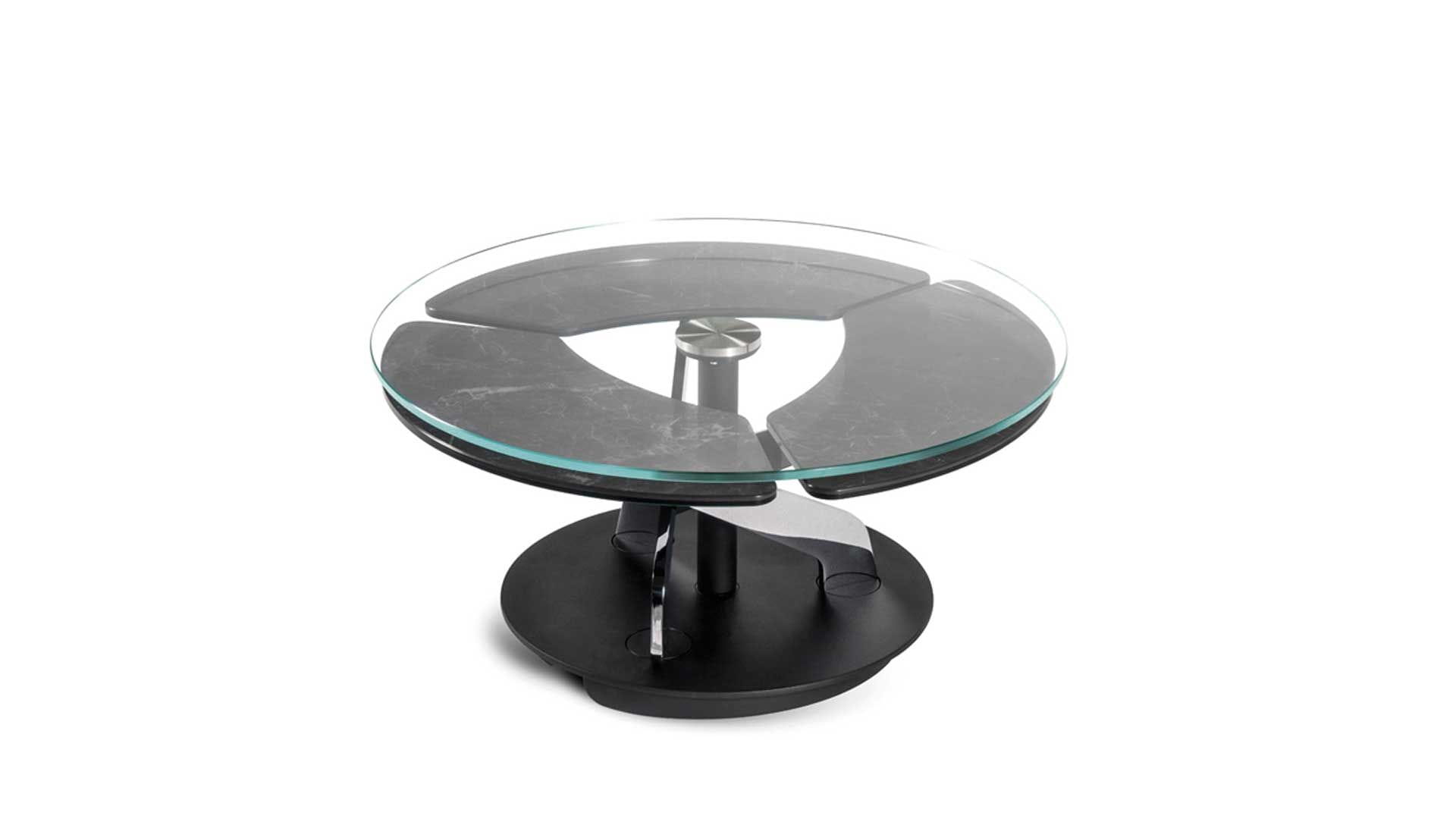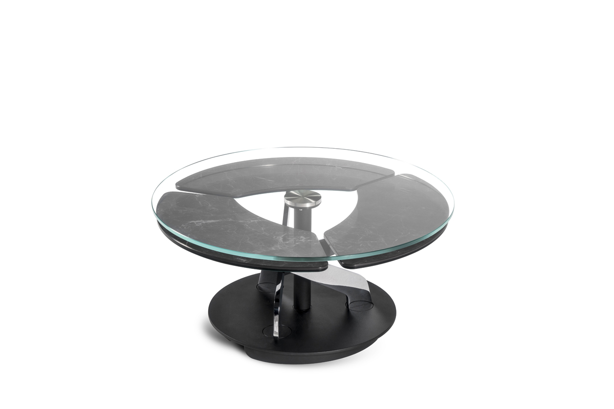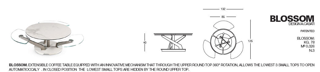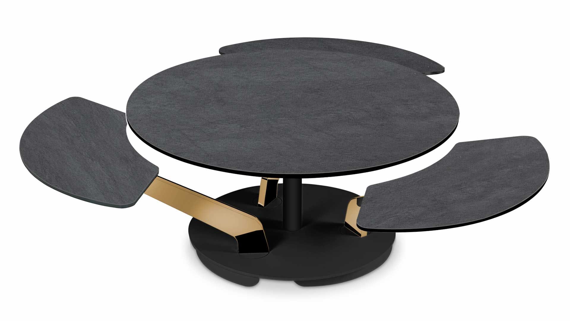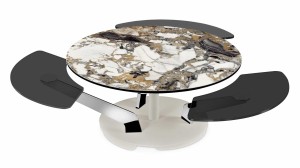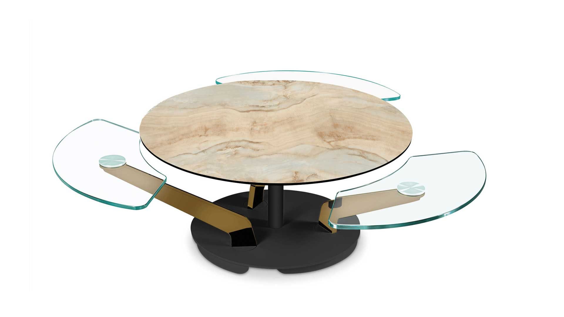 Designerski włoski stolik kawowy BLOSSOM - stolik o intrygującym designie; podstawa metalowa; centralny blat i trzy blaty pomocnicze ceramiczne lub szklane. Unikalny mechanizm rozkładający.