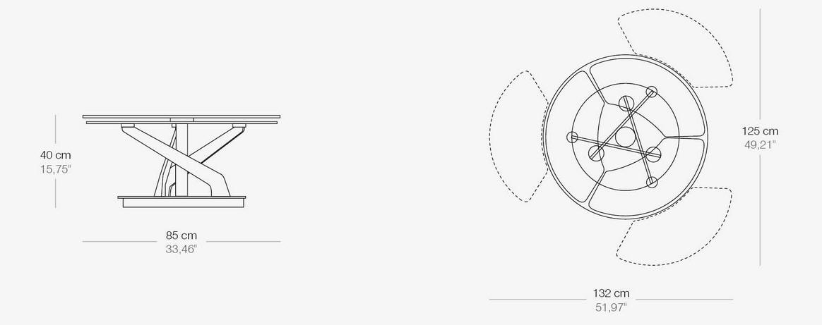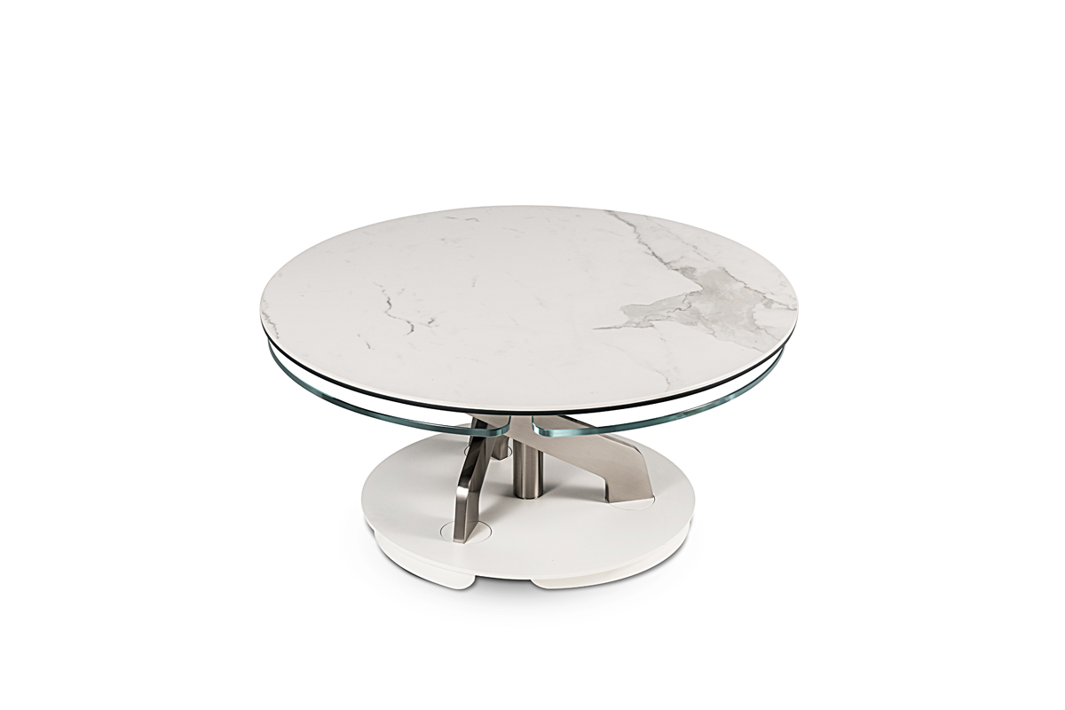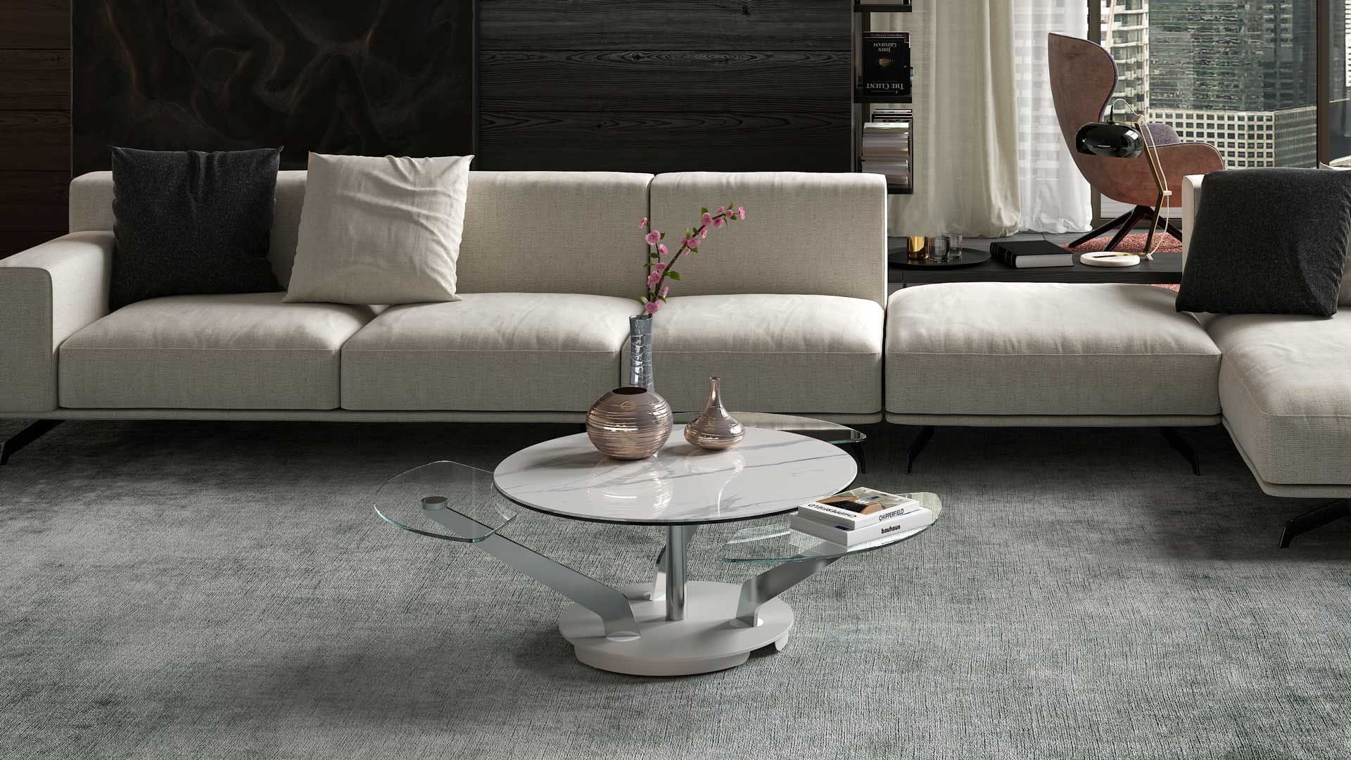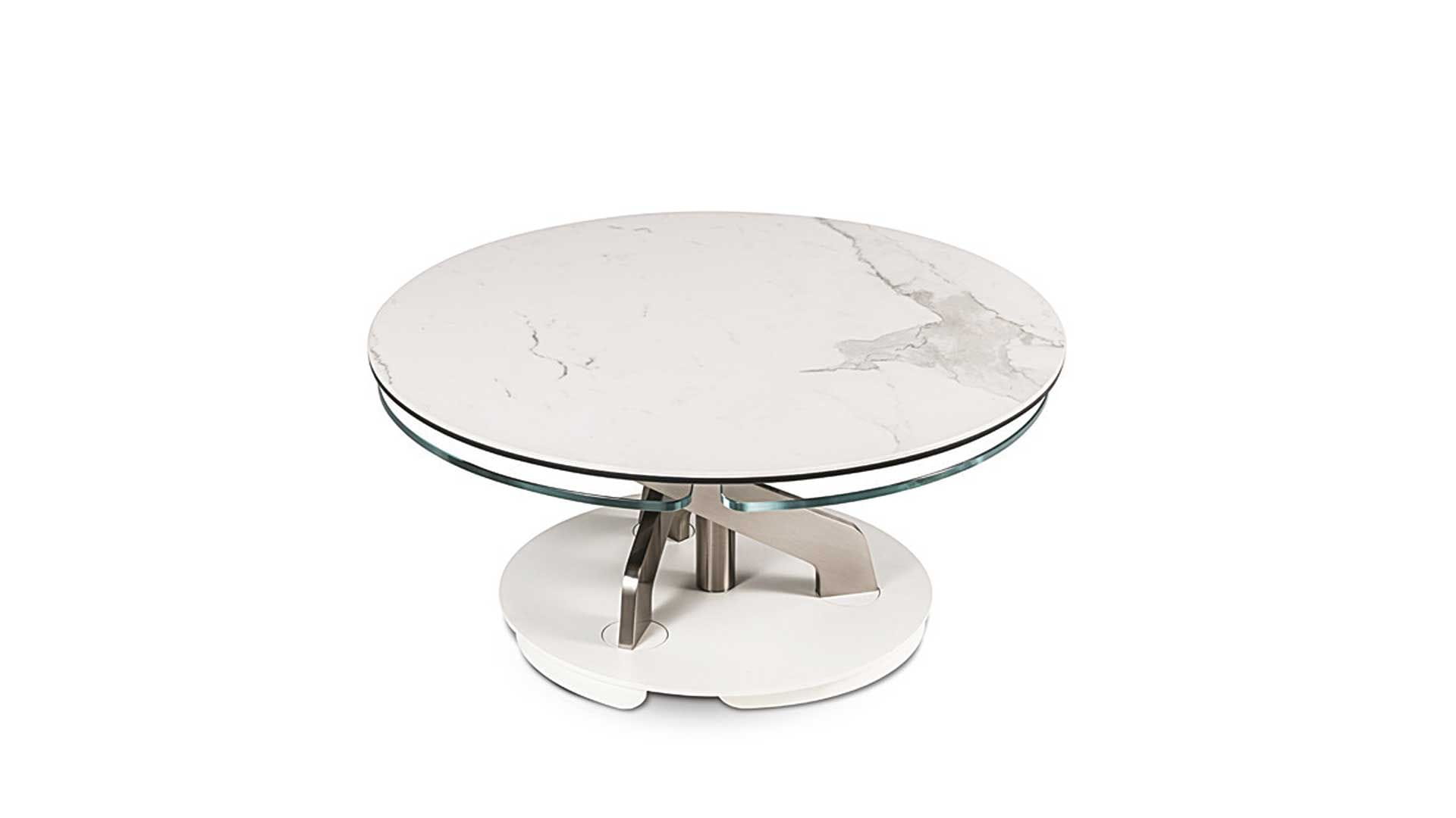 Designerski włoski stolik kawowy BLOSSOM - stolik o intrygującym designie; podstawa metalowa; centralny blat i trzy blaty pomocnicze ceramiczne lub szklane. Unikalny mechanizm rozkładający.