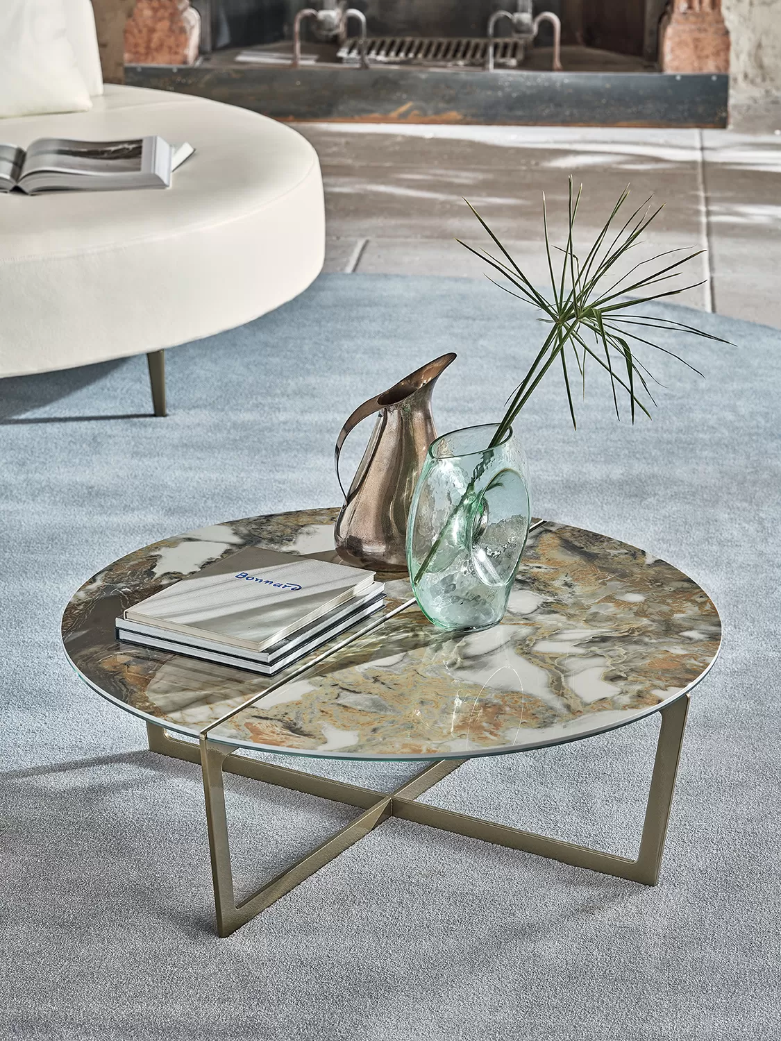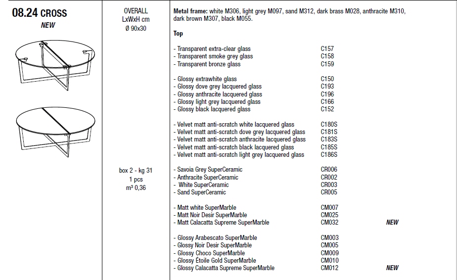 - model 08.24 wymiary fi90xh30 cena od 6 686 zł brutto; dotyczy wariantu: podstawa - white M306, light grey M097, sand M312, dark brass M028, anthracite M310, dark brown M307, black M055; blat - Glossy dove grey lacquered glass C193, Glossy anthracite lacquered glass C196, Glossy black lacquered glass C152;