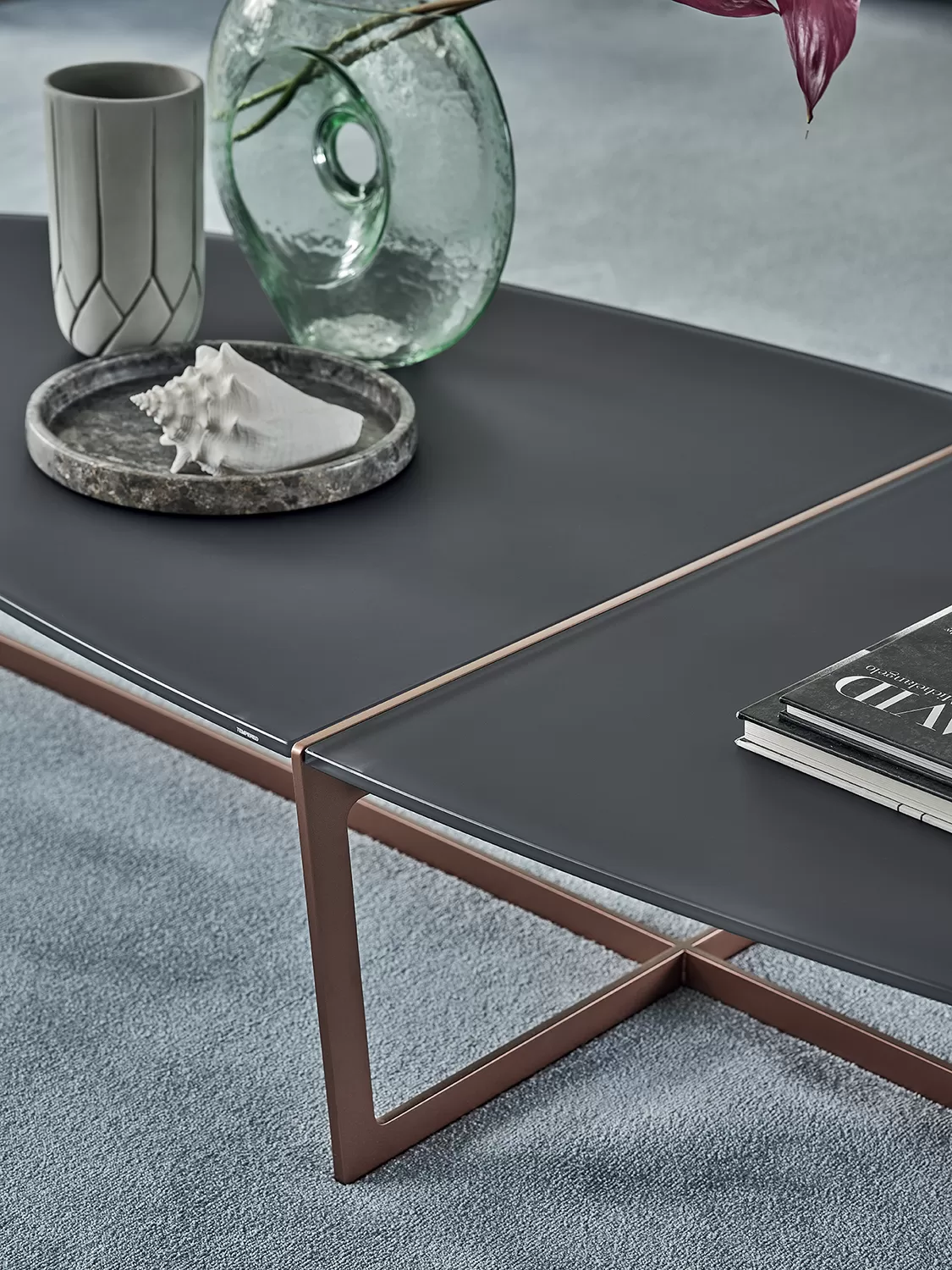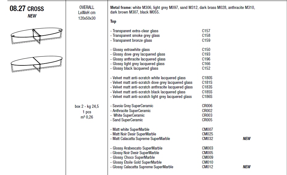 - model 08.27 wymiary 120x50xh30 cena od 6 194 zł brutto; dotyczy wariantu: podstawa - white M306, light grey M097, sand M312, dark brass M028, anthracite M310, dark brown M307, black M055; blat - Transparent extra-clear glass C157, Transparent smoke grey glass C158, Transparent bronze glass C159;
