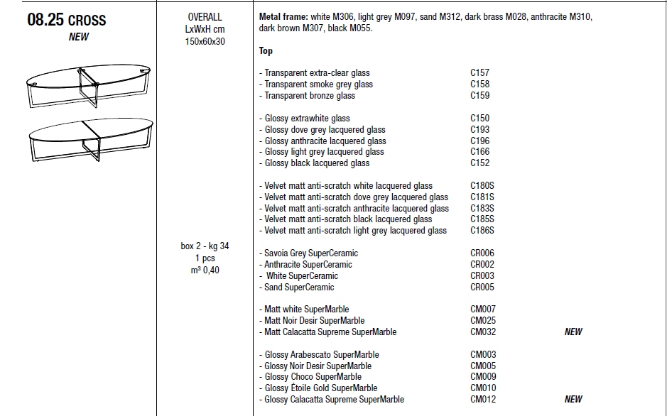 - model 08.25 wymiary 150x60xh30 cena od 6 686 zł brutto; dotyczy wariantu: podstawa - white M306, light grey M097, sand M312, dark brass M028, anthracite M310, dark brown M307, black M055; blat - Glossy dove grey lacquered glass C193, Glossy anthracite lacquered glass C196, Glossy black lacquered glass C152;