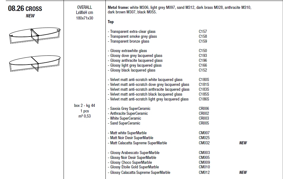 - model 08.26 wymiary 180x71xh30 cena od 7 434 zł brutto; dotyczy wariantu: podstawa - white M306, light grey M097, sand M312, dark brass M028, anthracite M310, dark brown M307, black M055; blat - Transparent extra-clear glass C157, Transparent smoke grey glass C158, Transparent bronze glass C159.