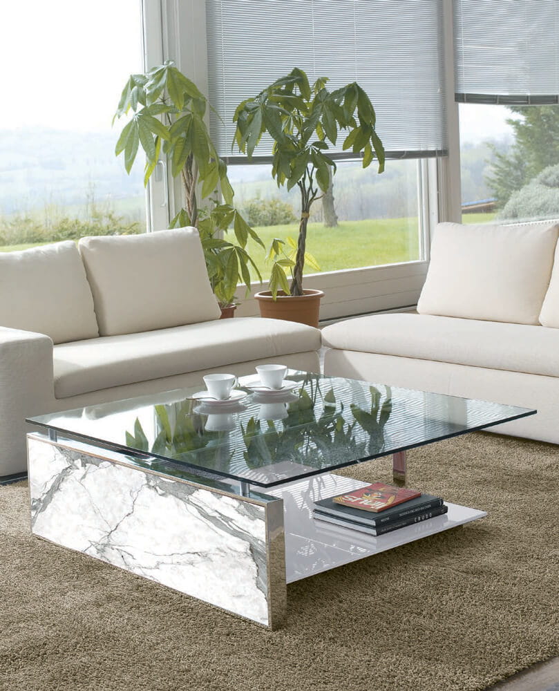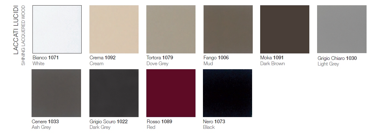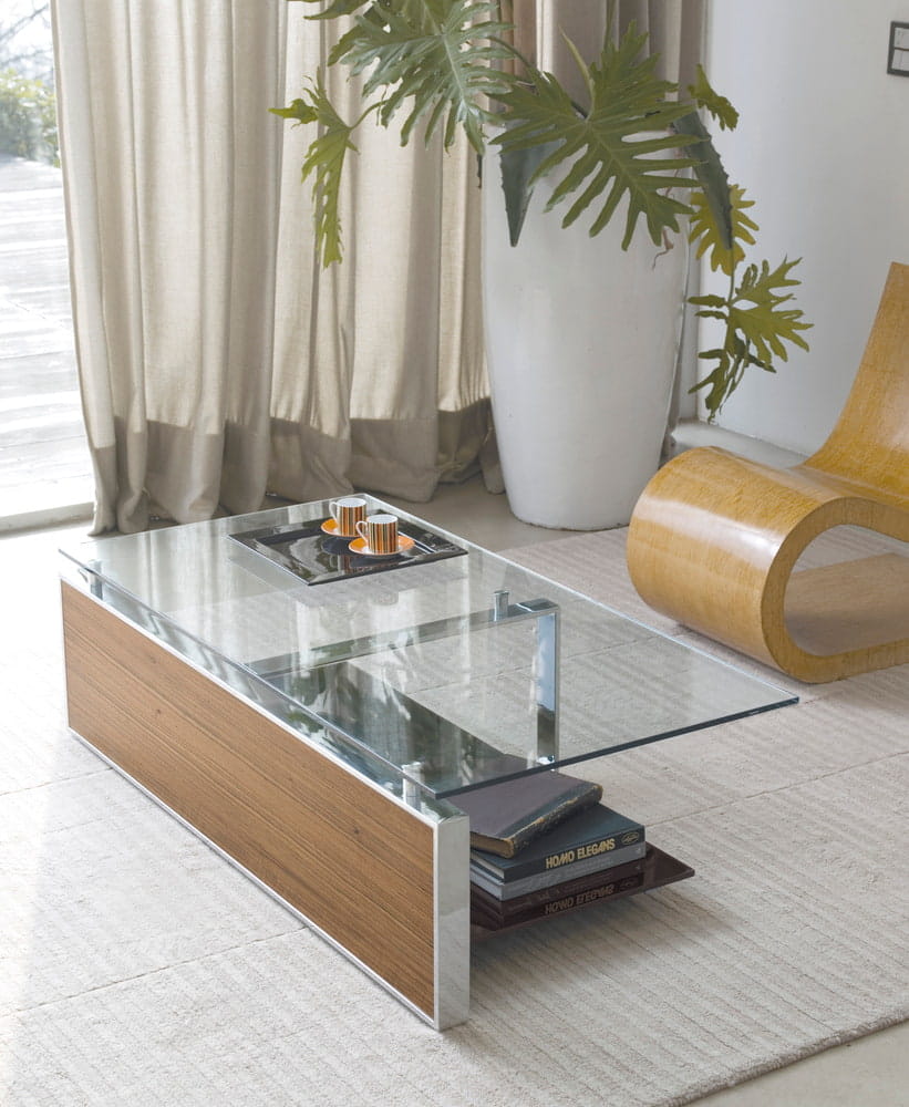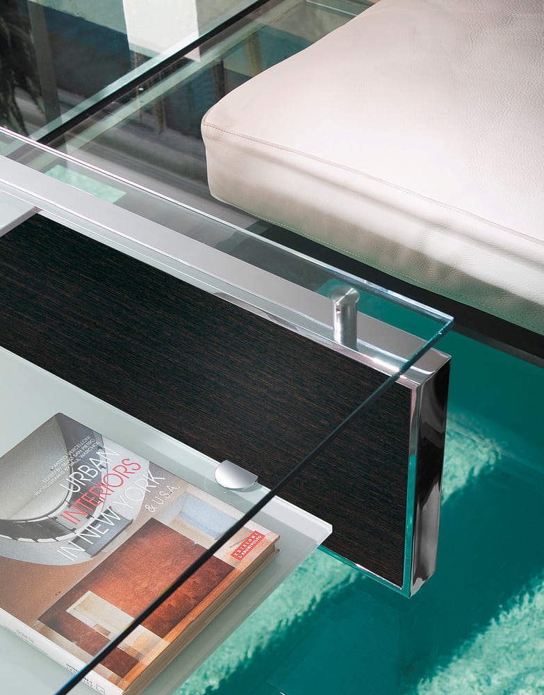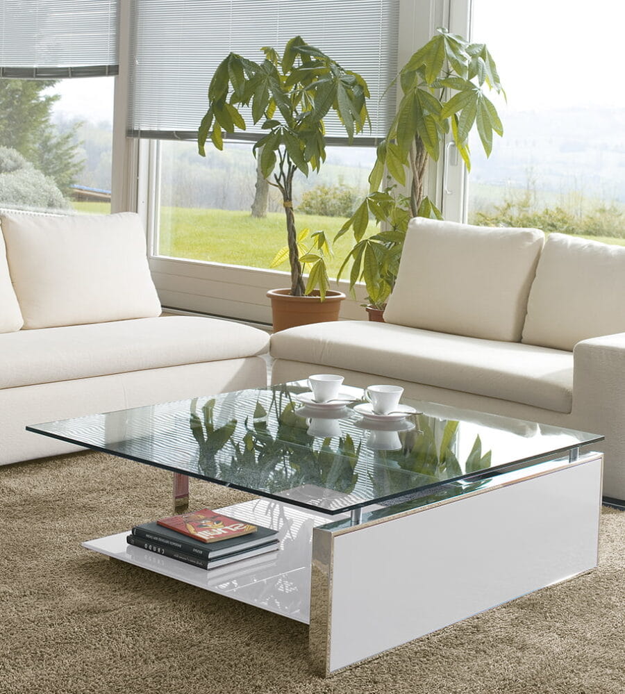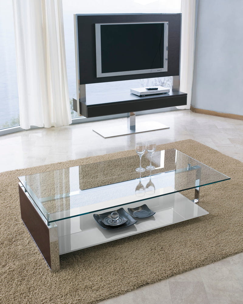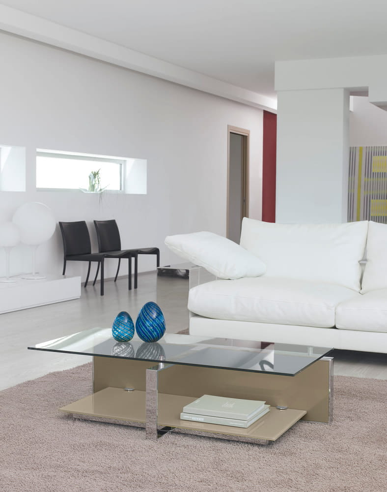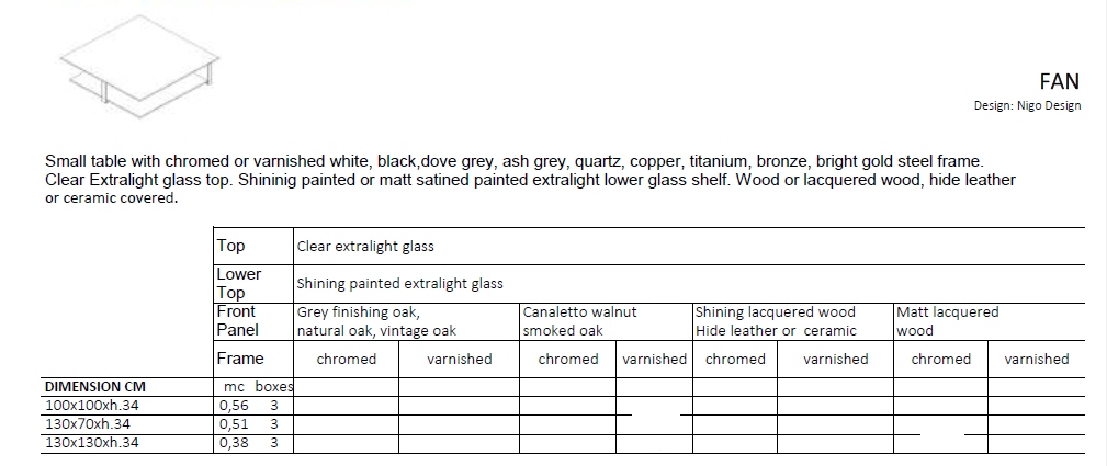 Stolik kawowy FAN - nowoczesny włoski stolik; rama stolika metalowa chromowana lub lakierowana; blat szklany; półka szklana lakierowana błyszcząca lub matowa; panel boczny drewniany, lakierowany lub ceramiczny; stolik dostępny w trzech rozmiarach.