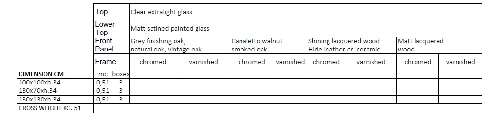 - 130x130xh34 cena od 13 838 zł brutto (dotyczy wariantu: rama metalowa lakierowana: white, black, dove grey, ash grey, quartz, copper, titanium; panel boczny: Grey finishing oak, natural oak, vintage oak; półka szklana: shining painted glass lower shelf)