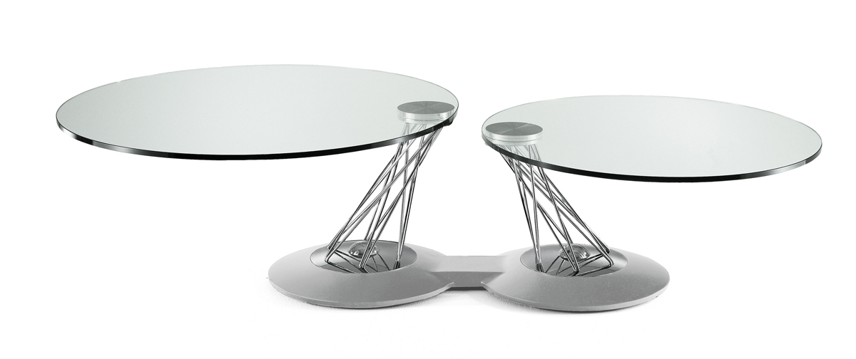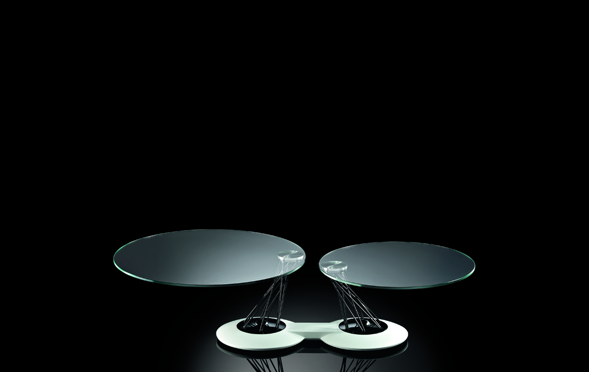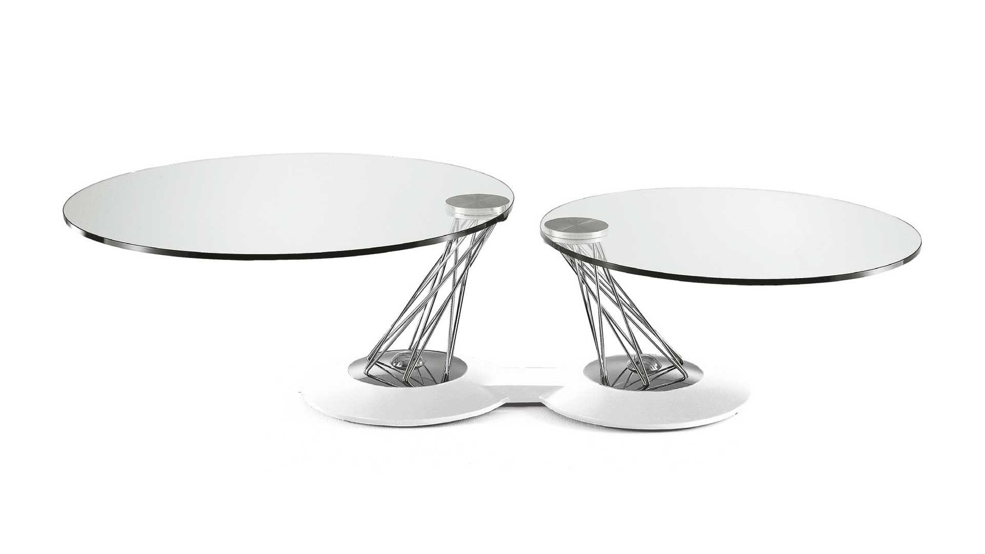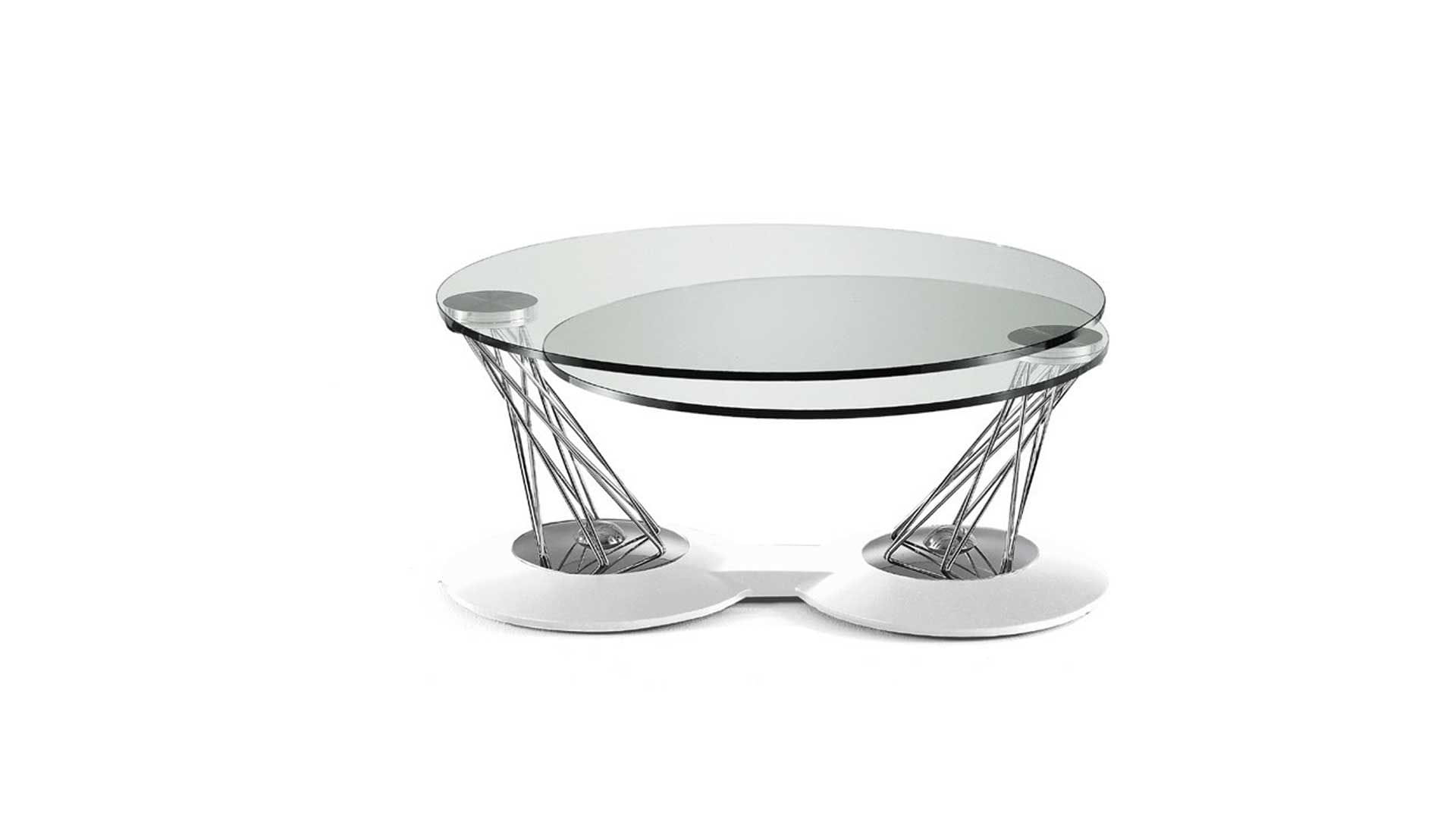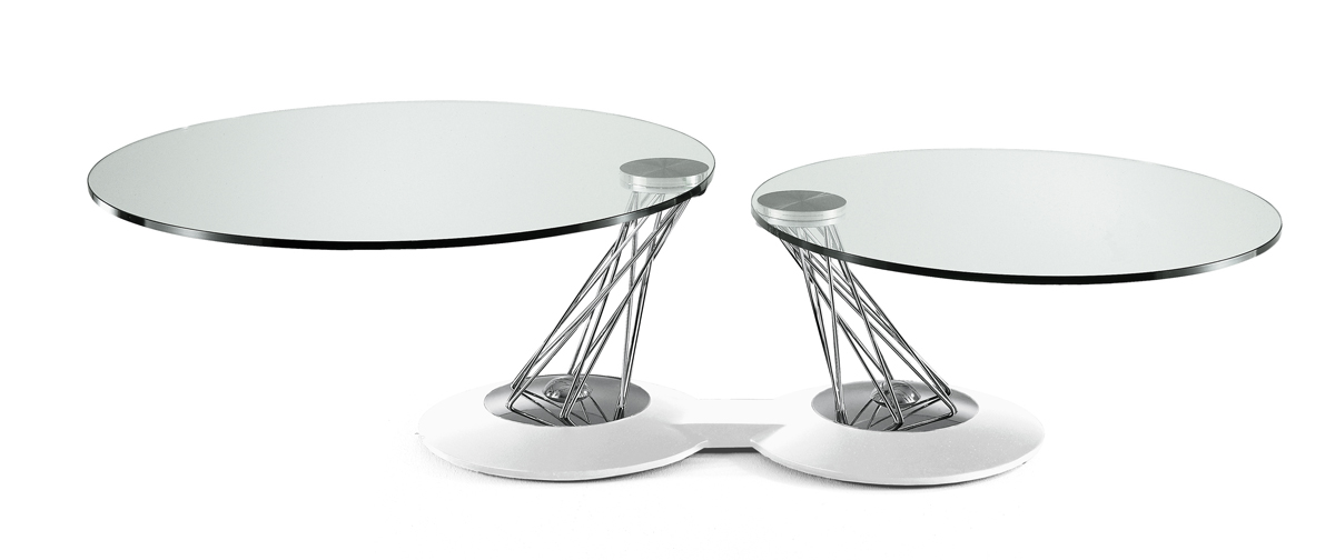 Designerski włoski stolik kawowy GEMELLI - stolik o intrygującym designie; podstawa metalowa pokryta materiałem syntetycznym; kolumna metalowa w dwóch kolorach; blaty szklane. Unikalny mechanizm rozkładający.