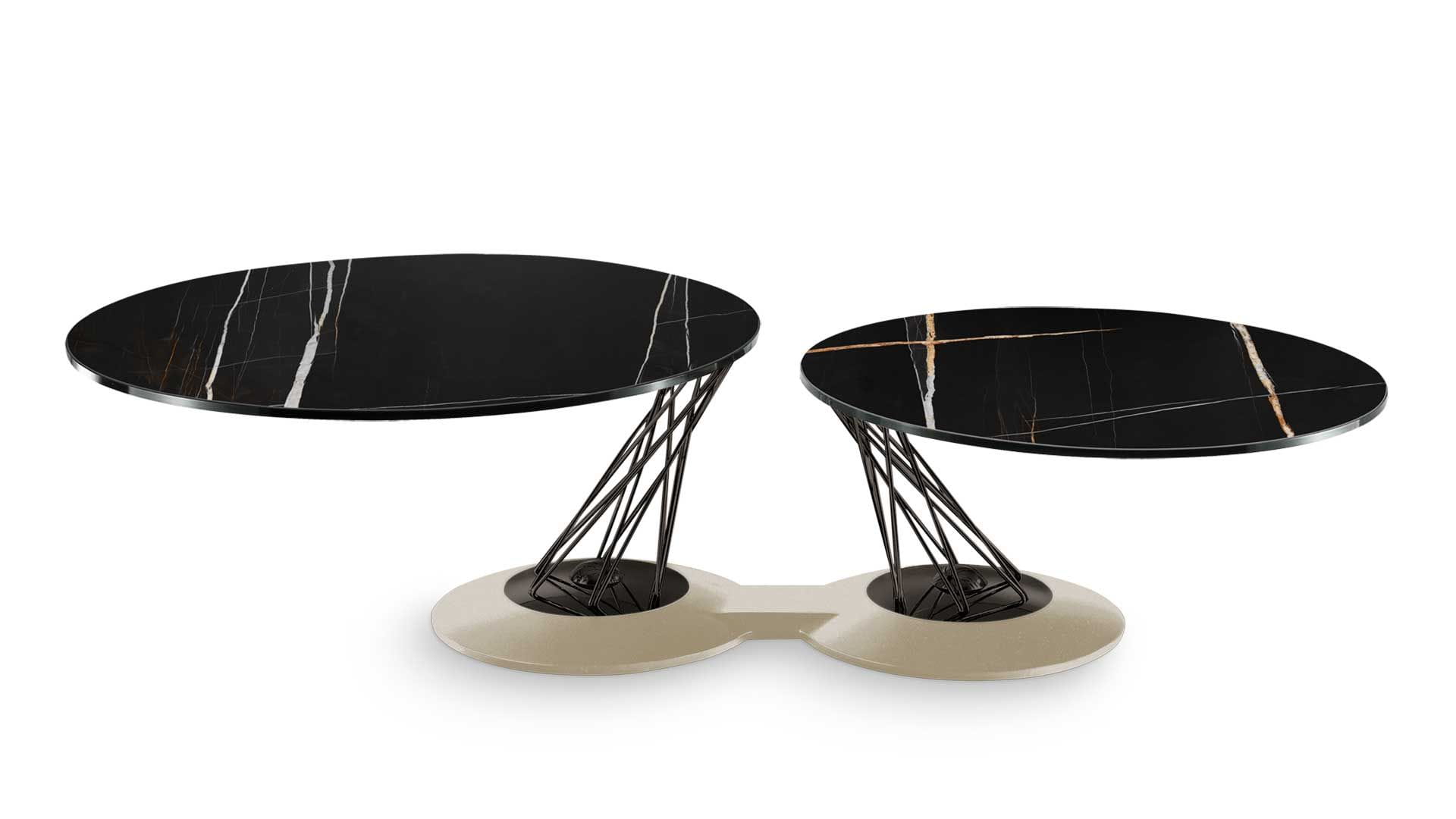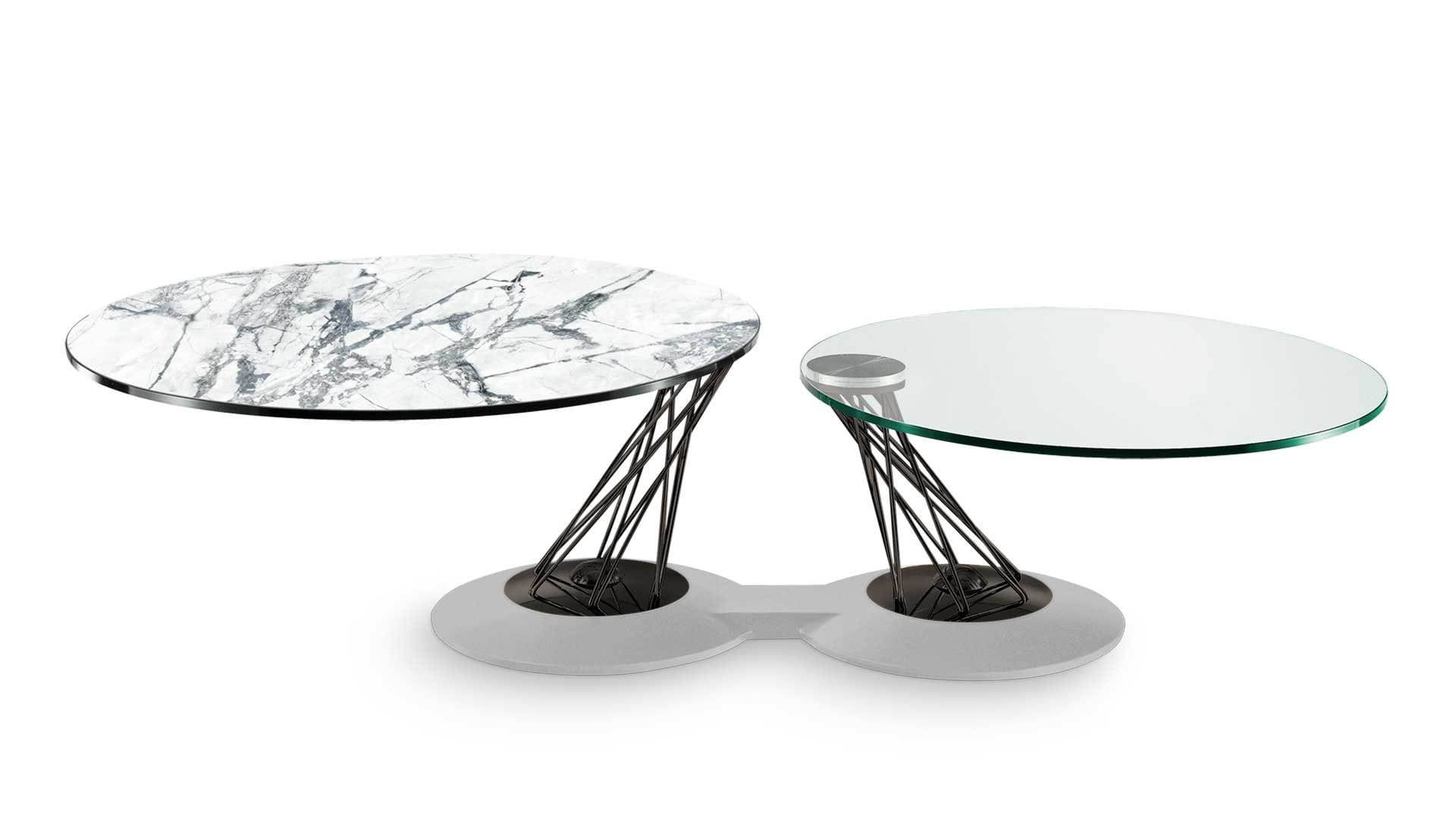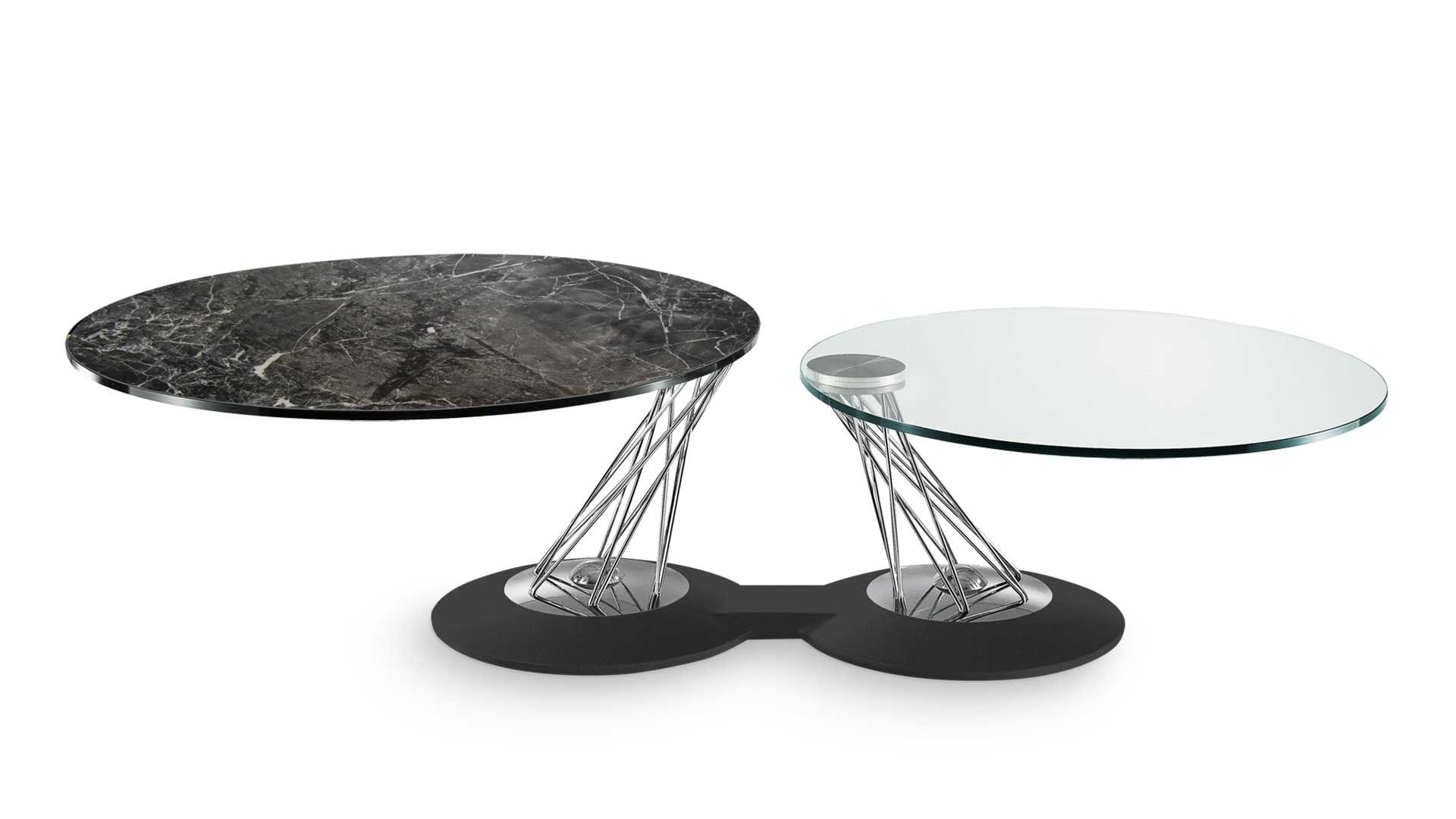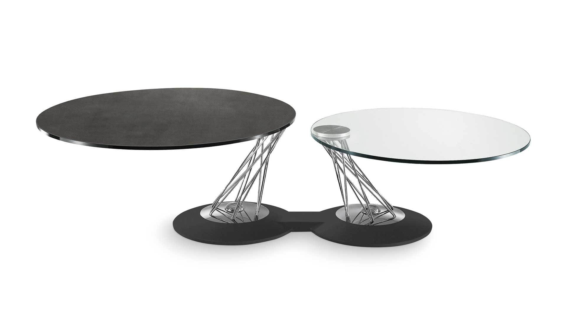 Designerski włoski stolik kawowy GEMELLI - stolik o intrygującym designie; podstawa metalowa pokryta materiałem syntetycznym; kolumna metalowa w dwóch kolorach; blaty szklane. Unikalny mechanizm rozkładający.