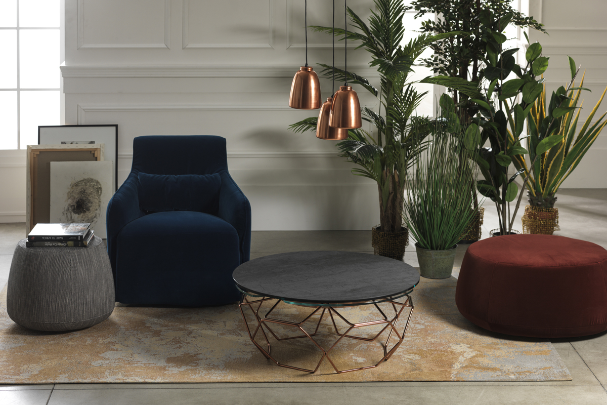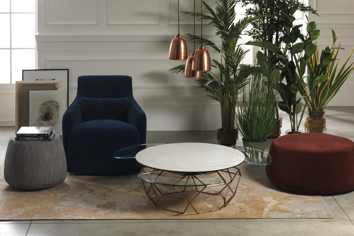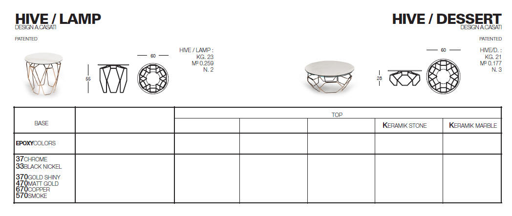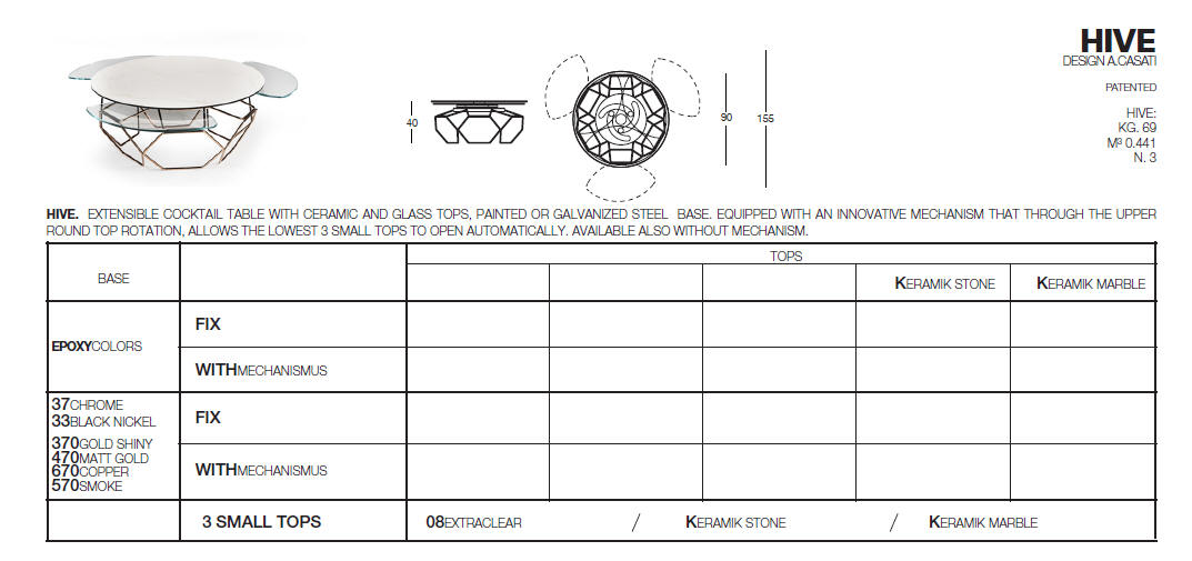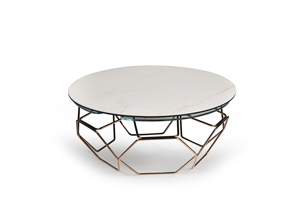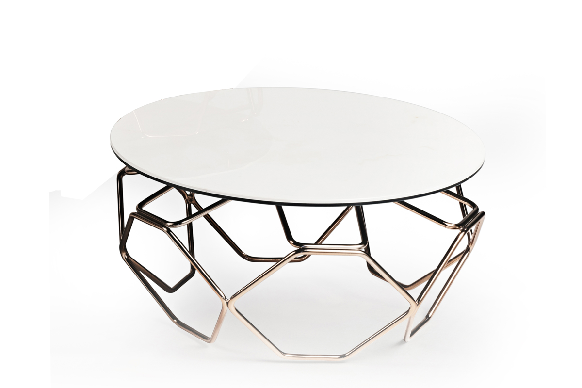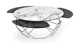 Designerskie włoskie stoliki kawowe HIVE - stoliki o intrygującym designie; podstawa metalowa; centralny blat ceramiczny, w modelu obrotowym trzy blaty pomocnicze ceramiczne lub szklane.