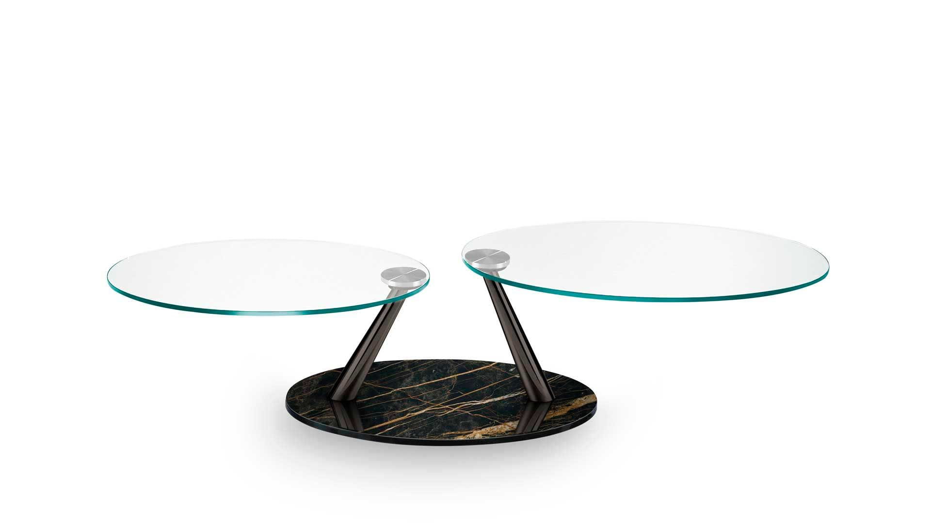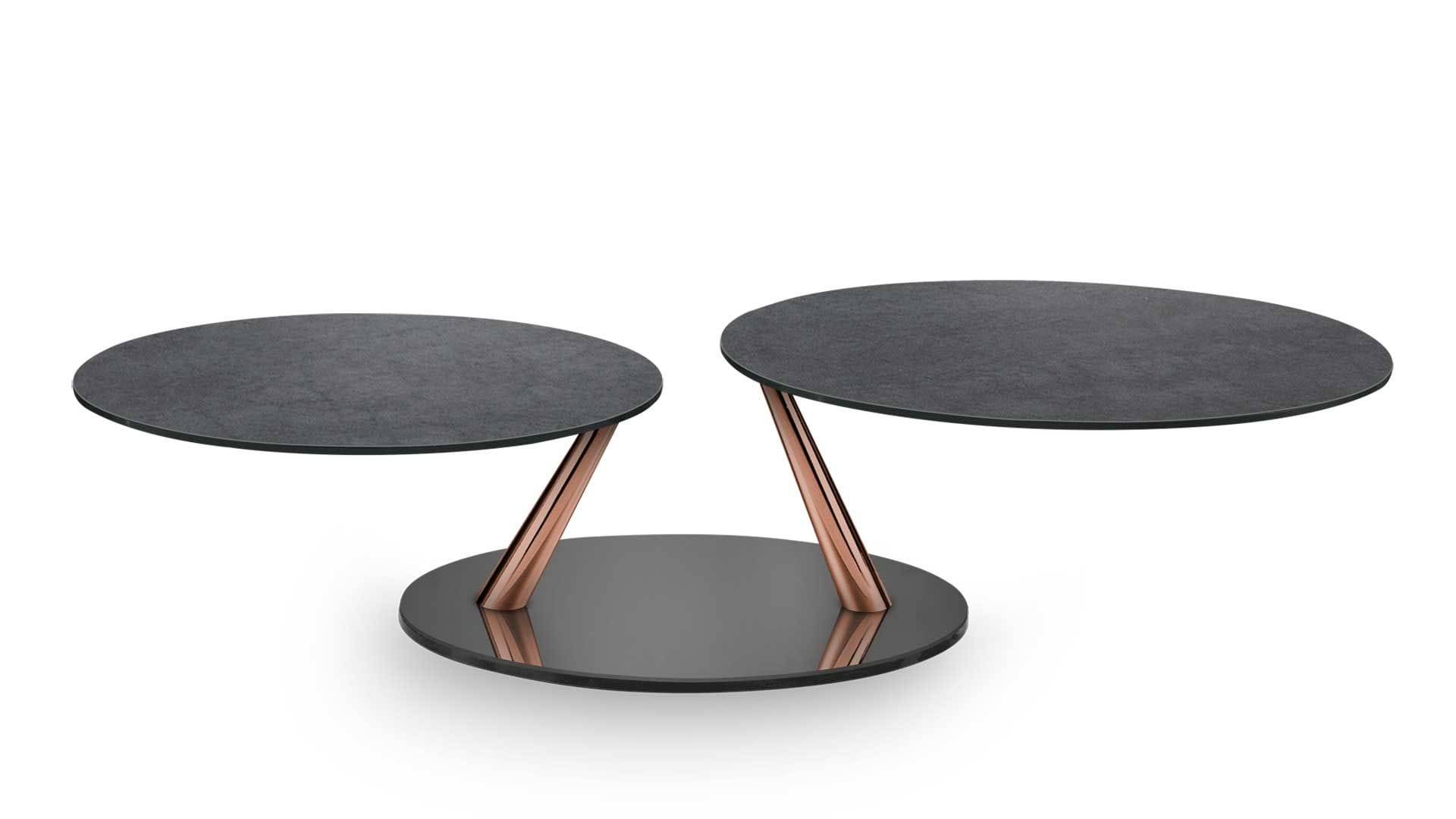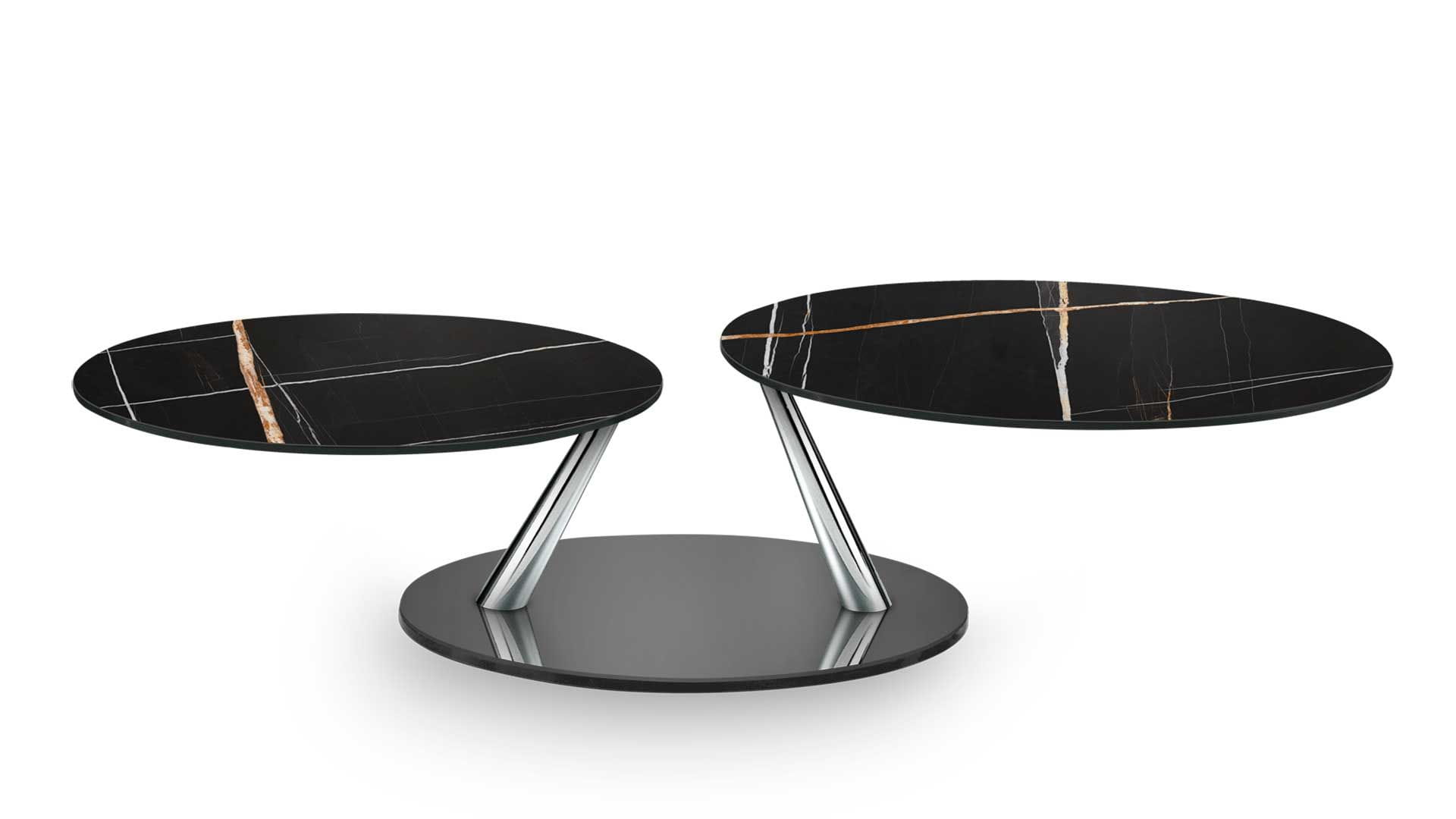 Designerski włoski stolik kawowy MILES - stolik o intrygującym designie; podstawa metalowa; kolumny metalowe, blaty szkło lub ceramiczne. Unikalny mechanizm rozkładający. W podstawie ukryte kółka ułatwiające przesuwanie.