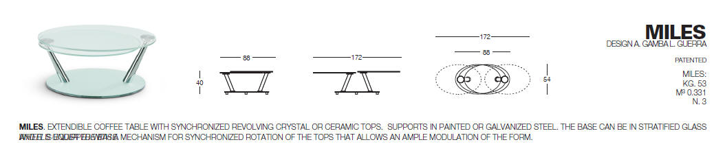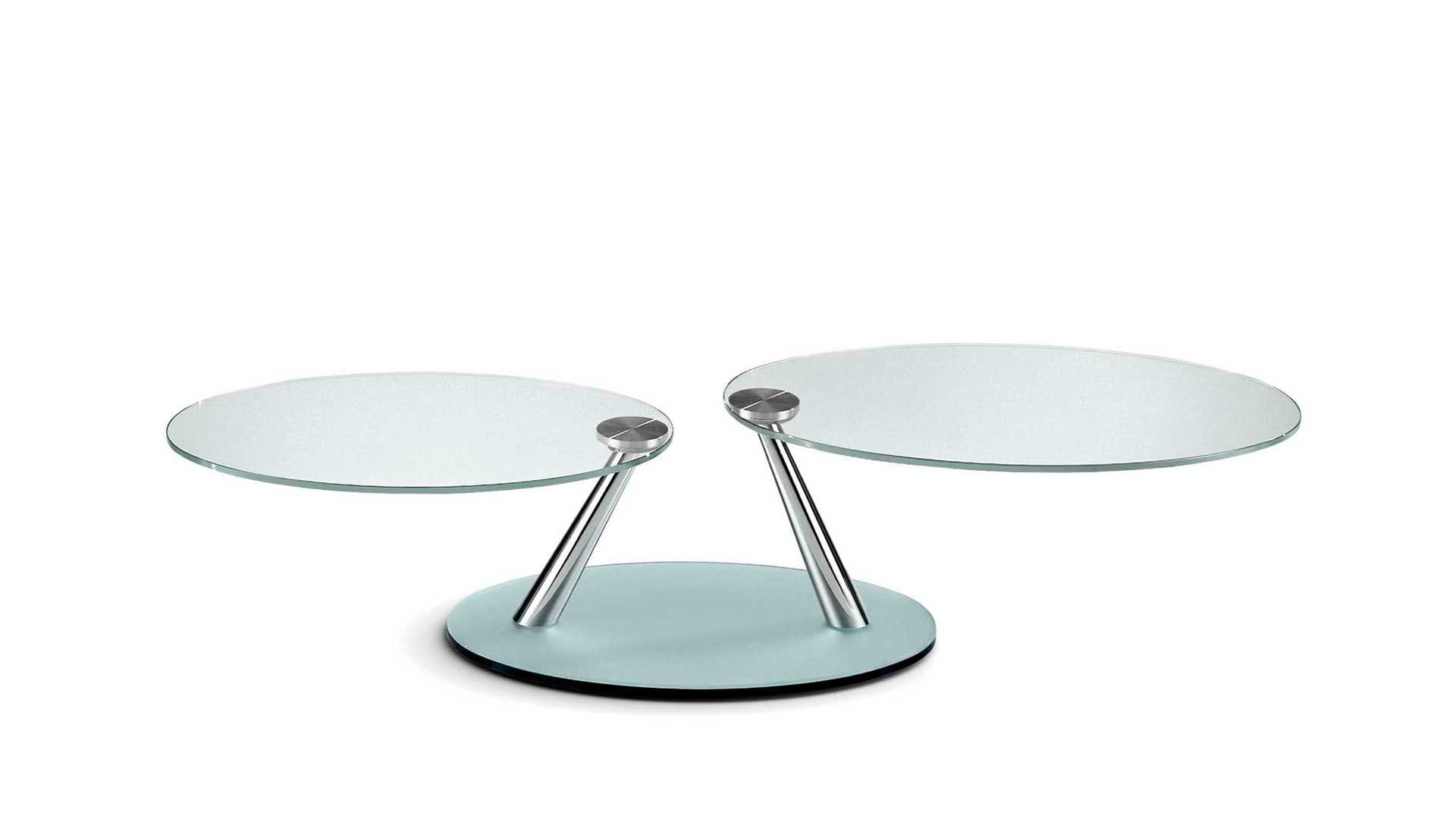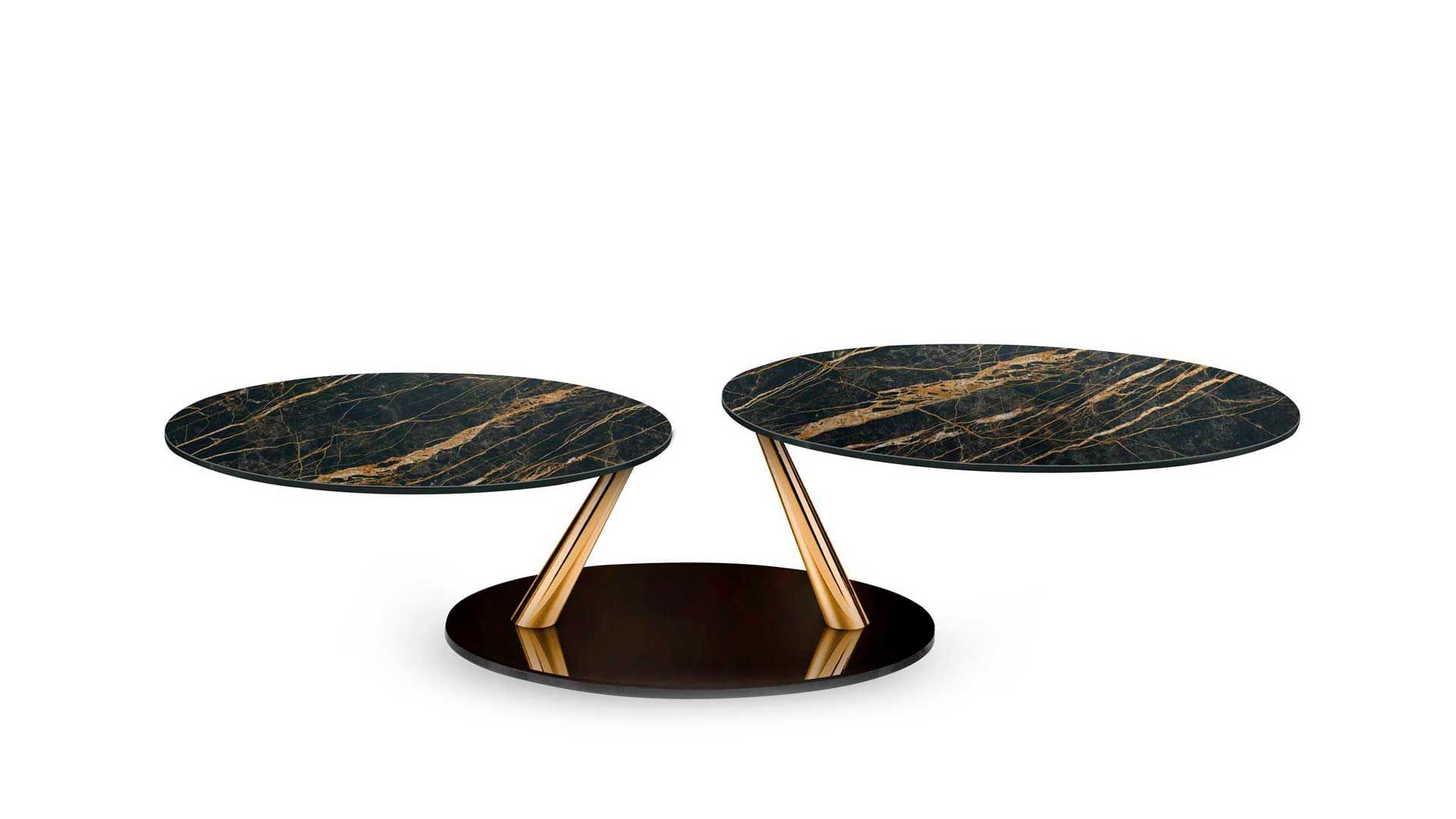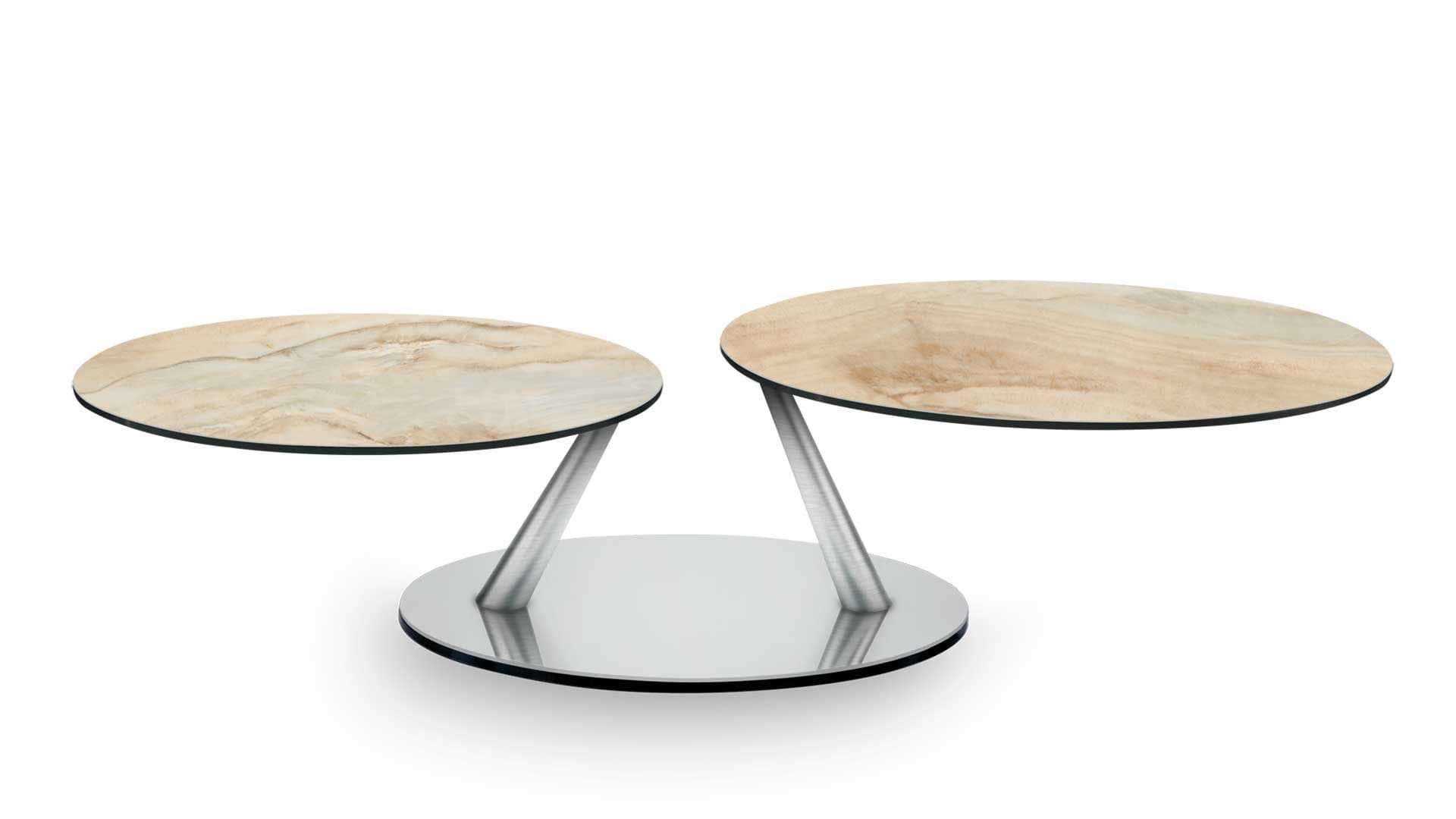 Designerski włoski stolik kawowy MILES - stolik o intrygującym designie; podstawa metalowa; kolumny metalowe, blaty szkło lub ceramiczne. Unikalny mechanizm rozkładający. W podstawie ukryte kółka ułatwiające przesuwanie.