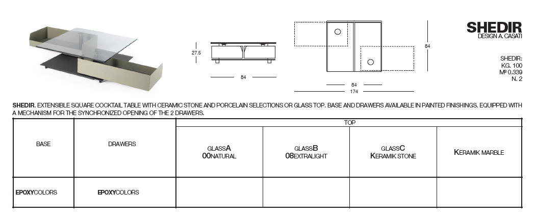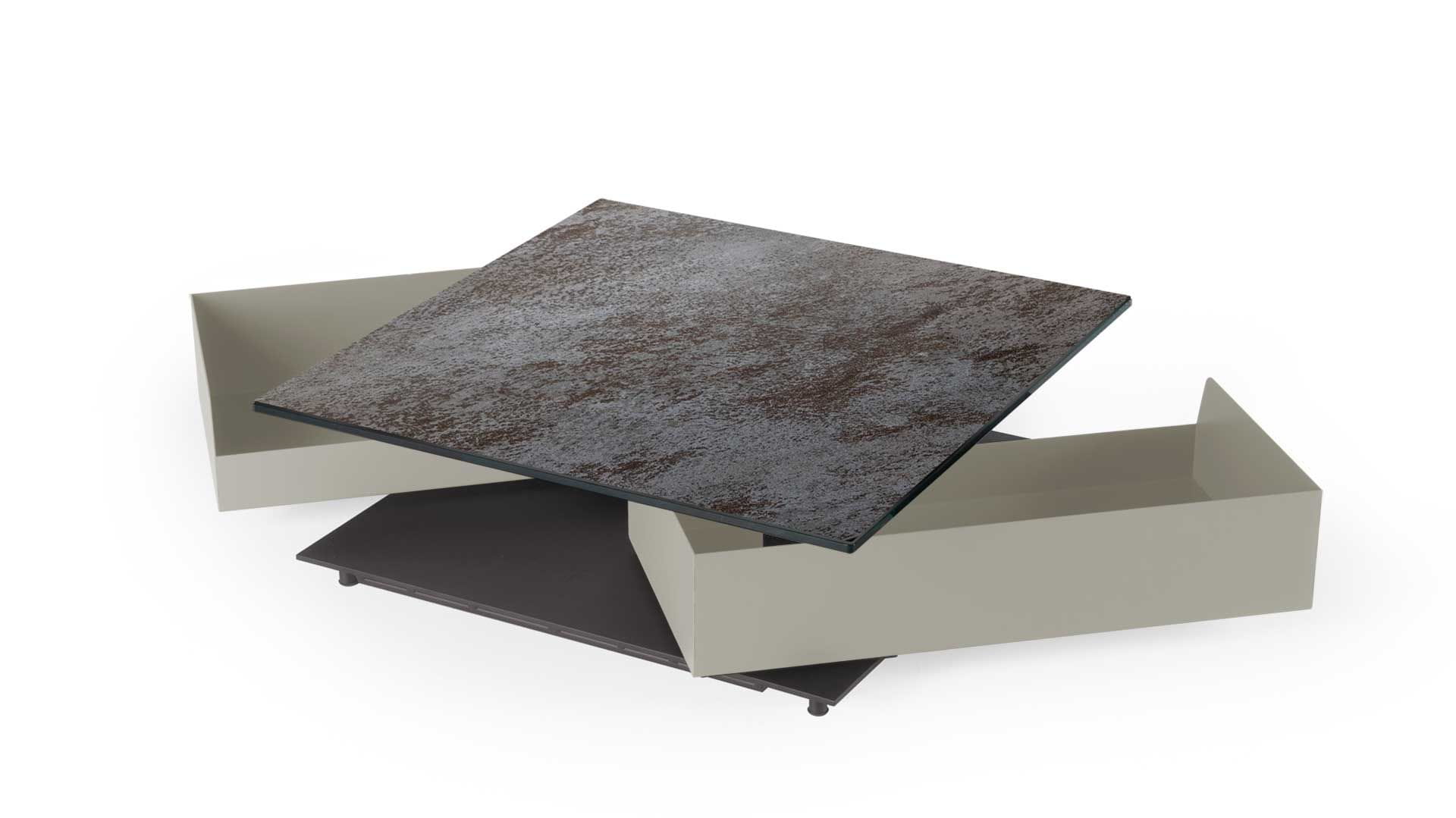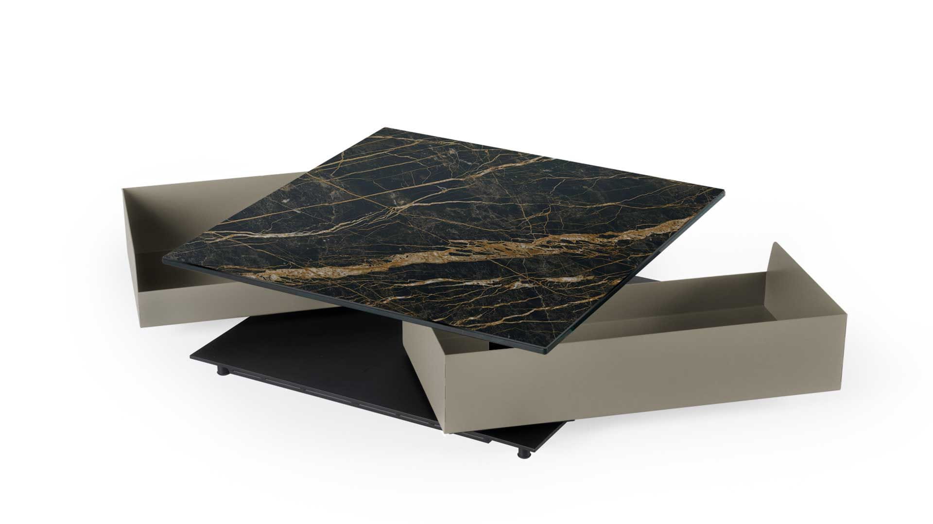 Designerski włoski stolik kawowy SHEDIR - stolik o intrygującym designie; podstawa metalowa; blat szkło, ceramiczne. Stolik wyposażony w dwie pojemne i wygodne w użytkowaniu szuflady chowane pod blatem. Stolik wyposażony w mechanizm pozwalający na łatwe i synchroniczne otwieranie szuflad.