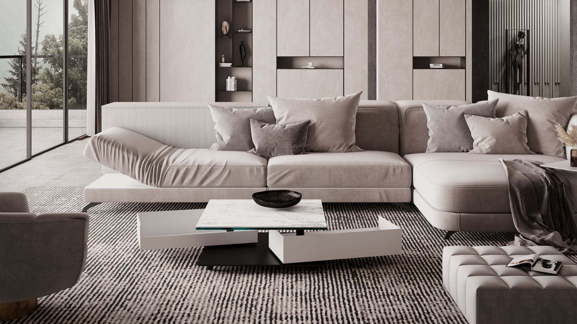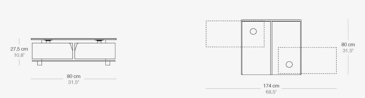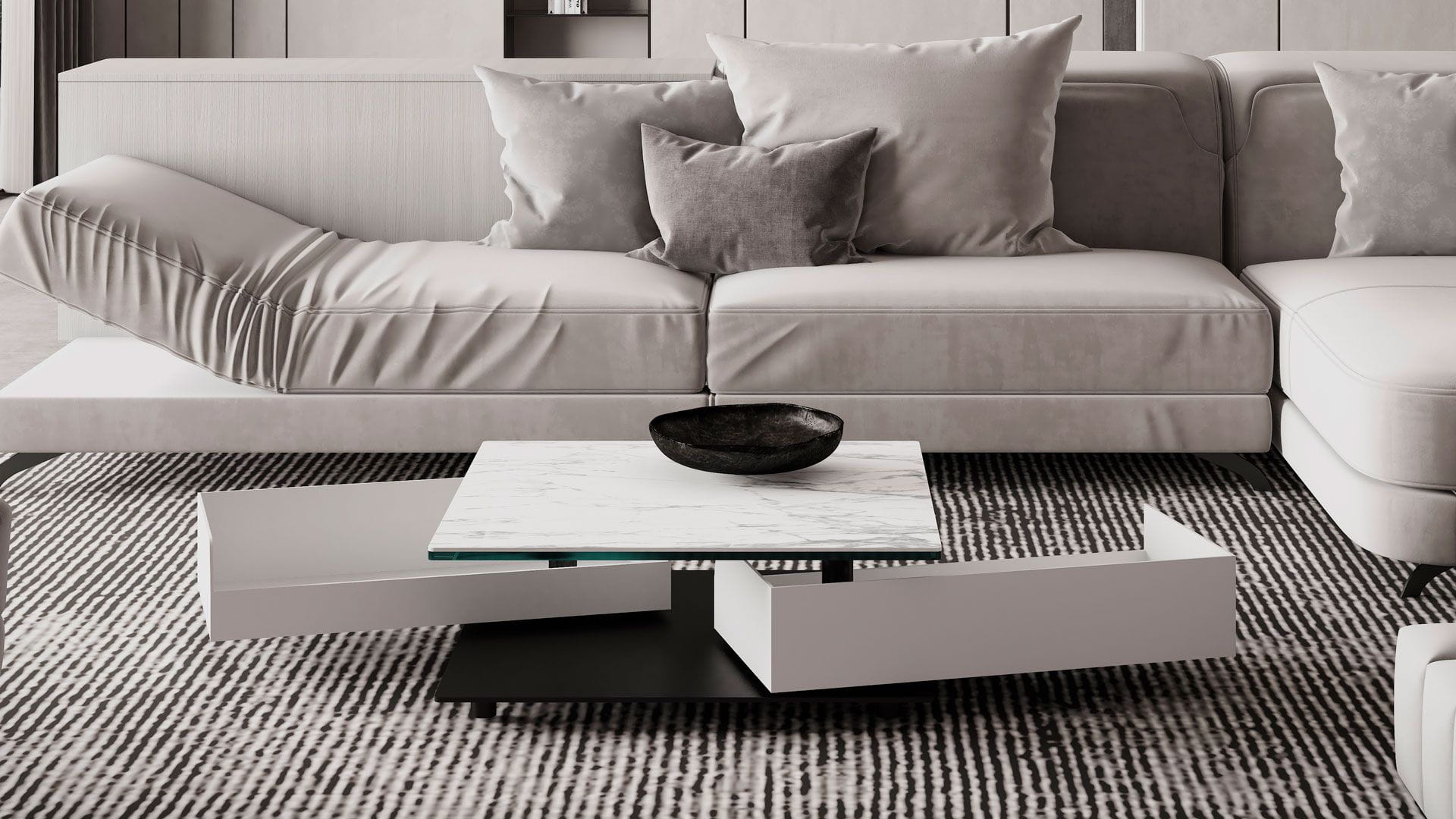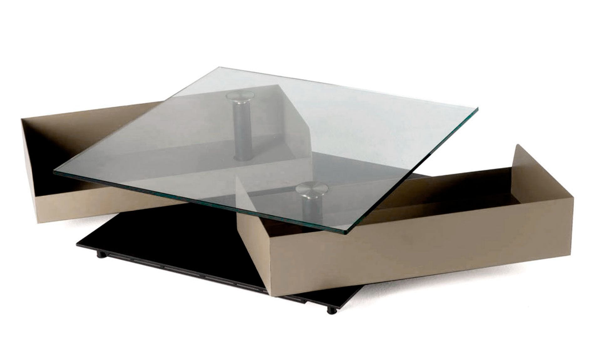 Designerski włoski stolik kawowy SHEDIR - stolik o intrygującym designie; podstawa metalowa; blat szkło, ceramiczne. Stolik wyposażony w dwie pojemne i wygodne w użytkowaniu szuflady chowane pod blatem. Stolik wyposażony w mechanizm pozwalający na łatwe i synchroniczne otwieranie szuflad.