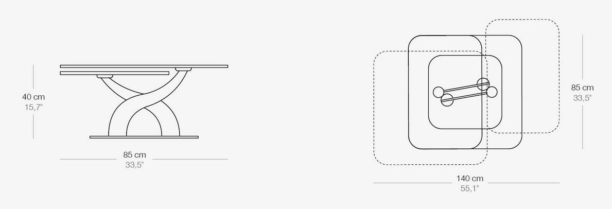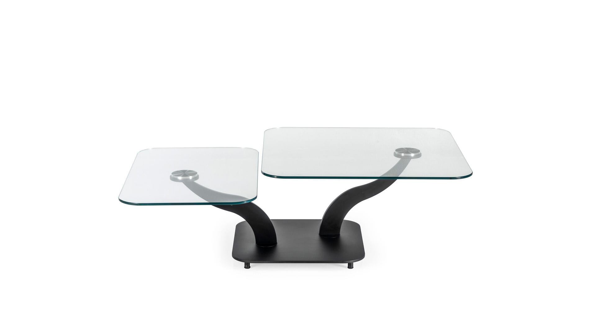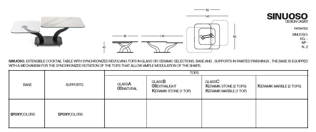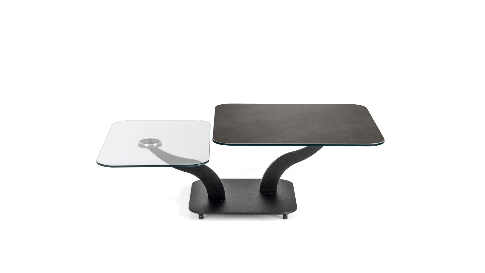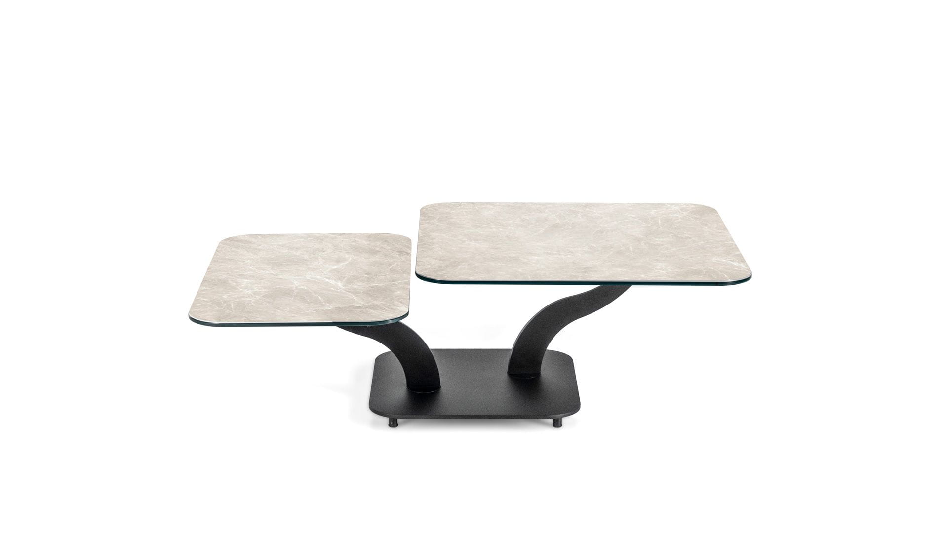 Designerski włoski stolik kawowy SINUOSO - stolik o intrygującym designie; podstawa metalowa; blaty szkło, ceramiczne. Unikalny mechanizm rozkładający.