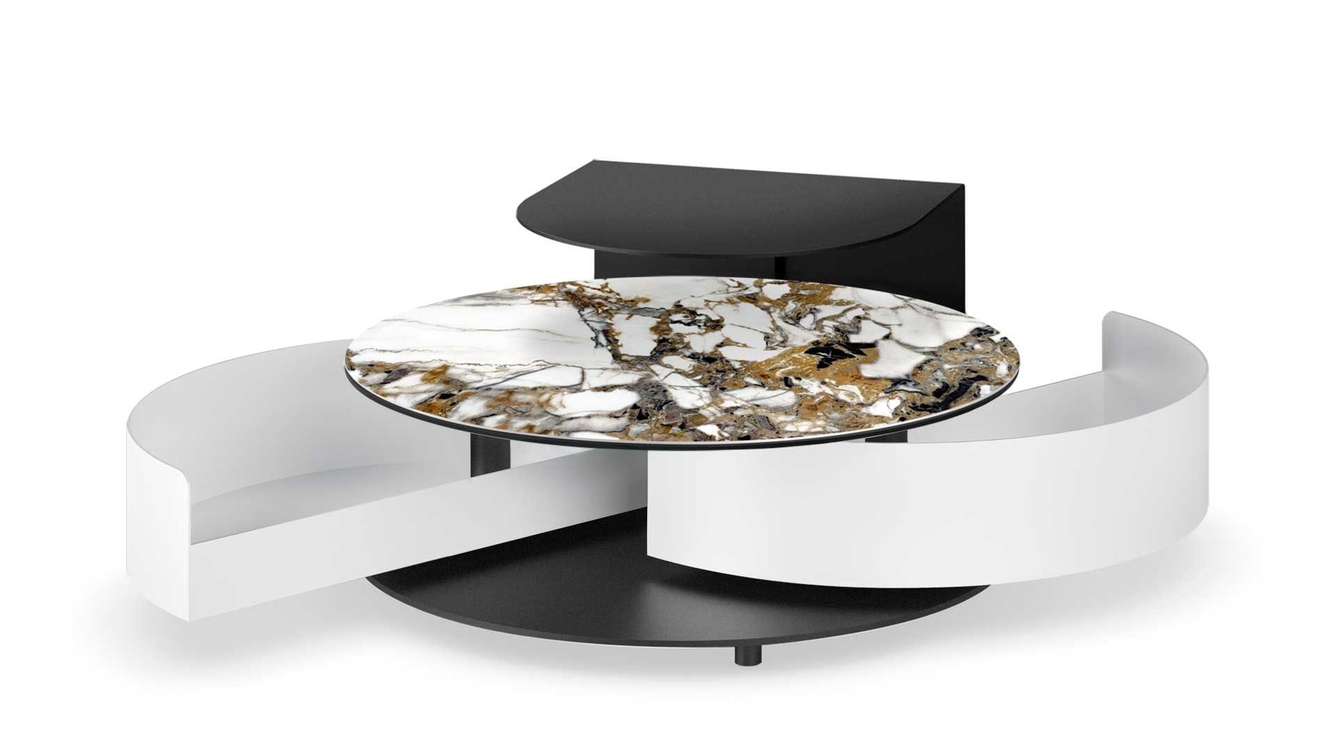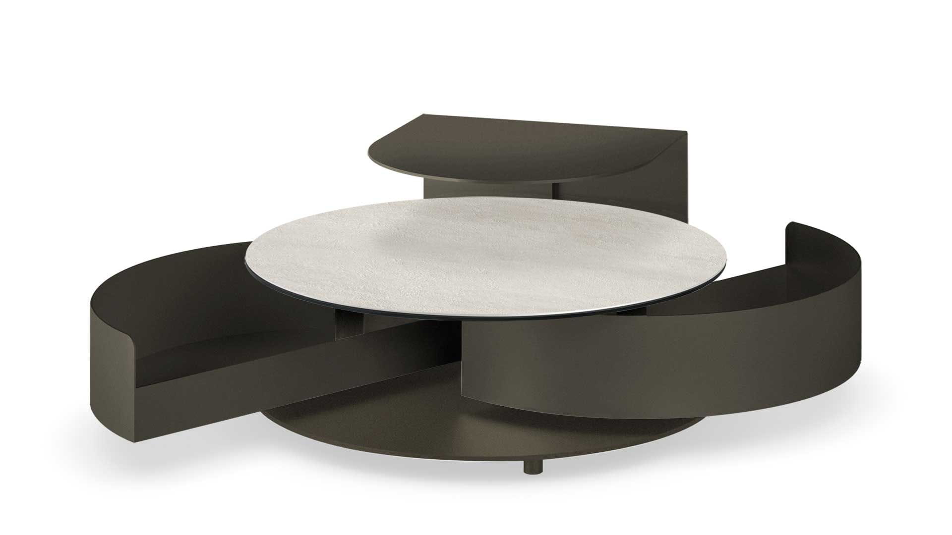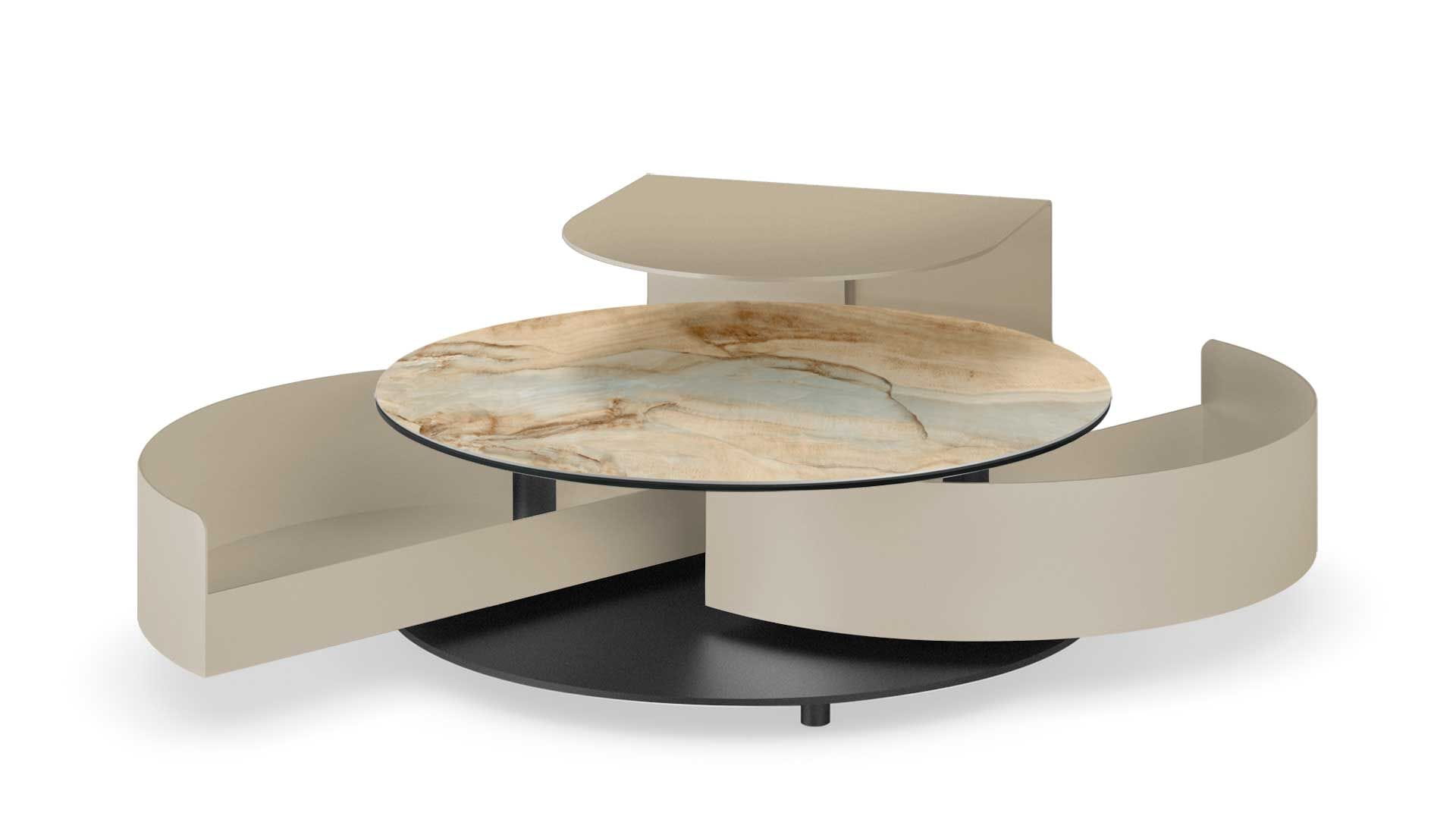 Designerski włoski stolik kawowy THETA SHELF - stolik o intrygującym designie; podstawa metalowa; blat szkło, ceramiczne. Stolik wyposażony w dwie pojemne i wygodne w użytkowaniu szuflady chowane pod blatem. Stolik wyposażony w mechanizm pozwalający na łatwe i synchroniczne otwieranie szuflad. Dodatkowo stolik wyposażony w metalową półkę.