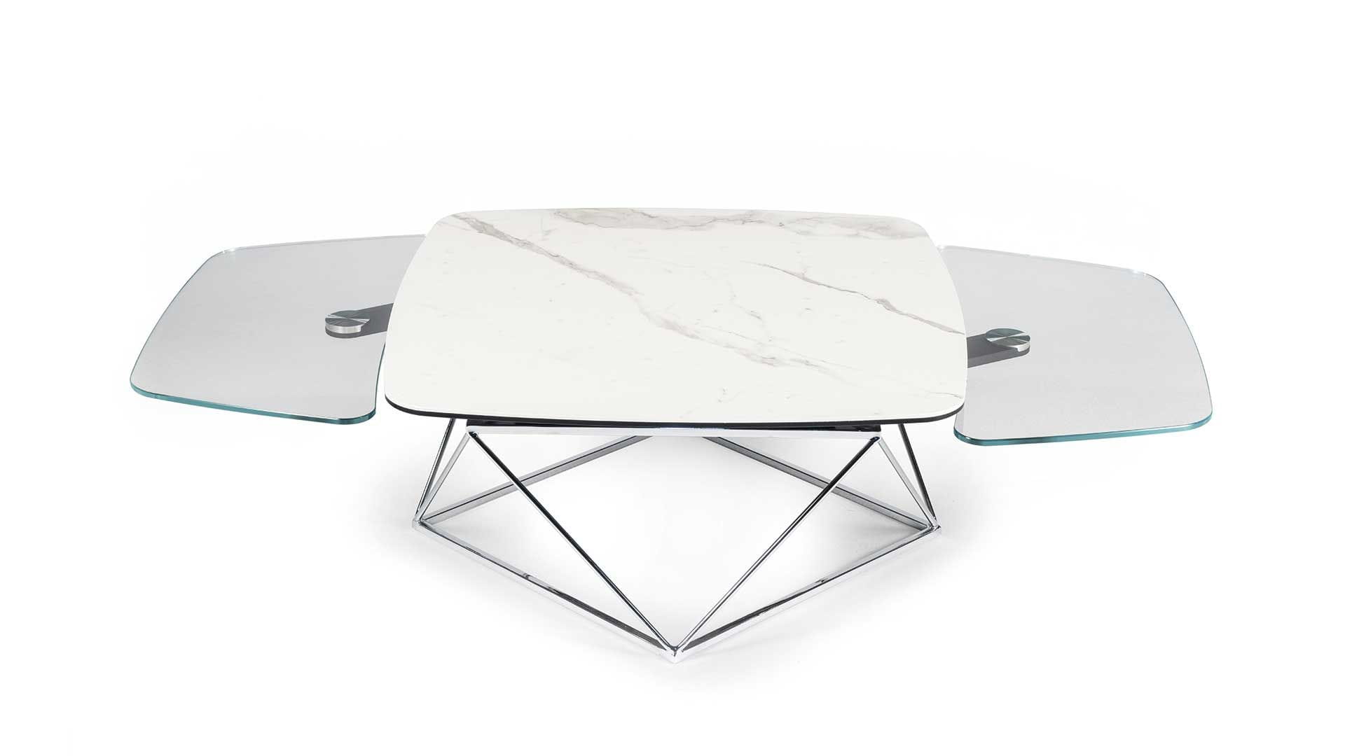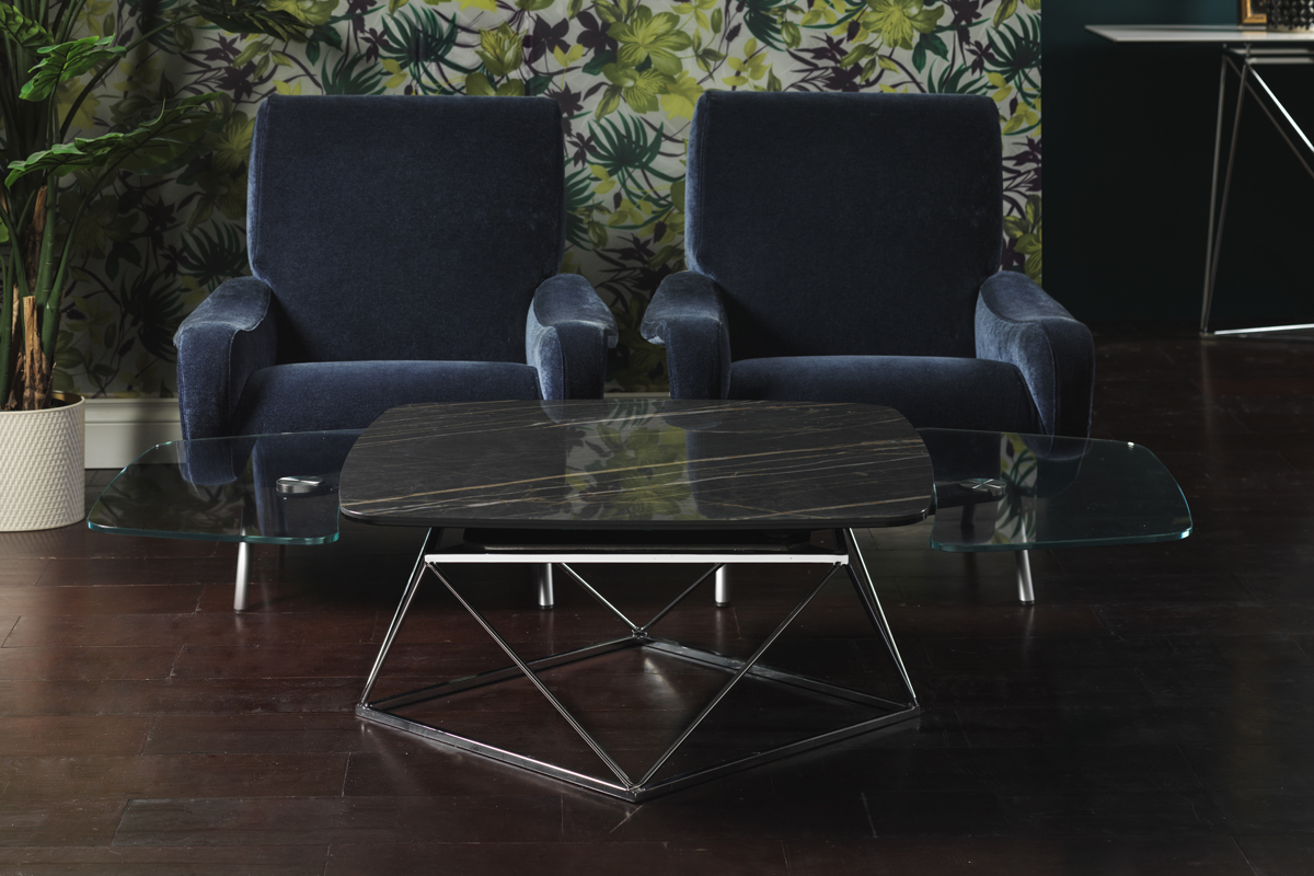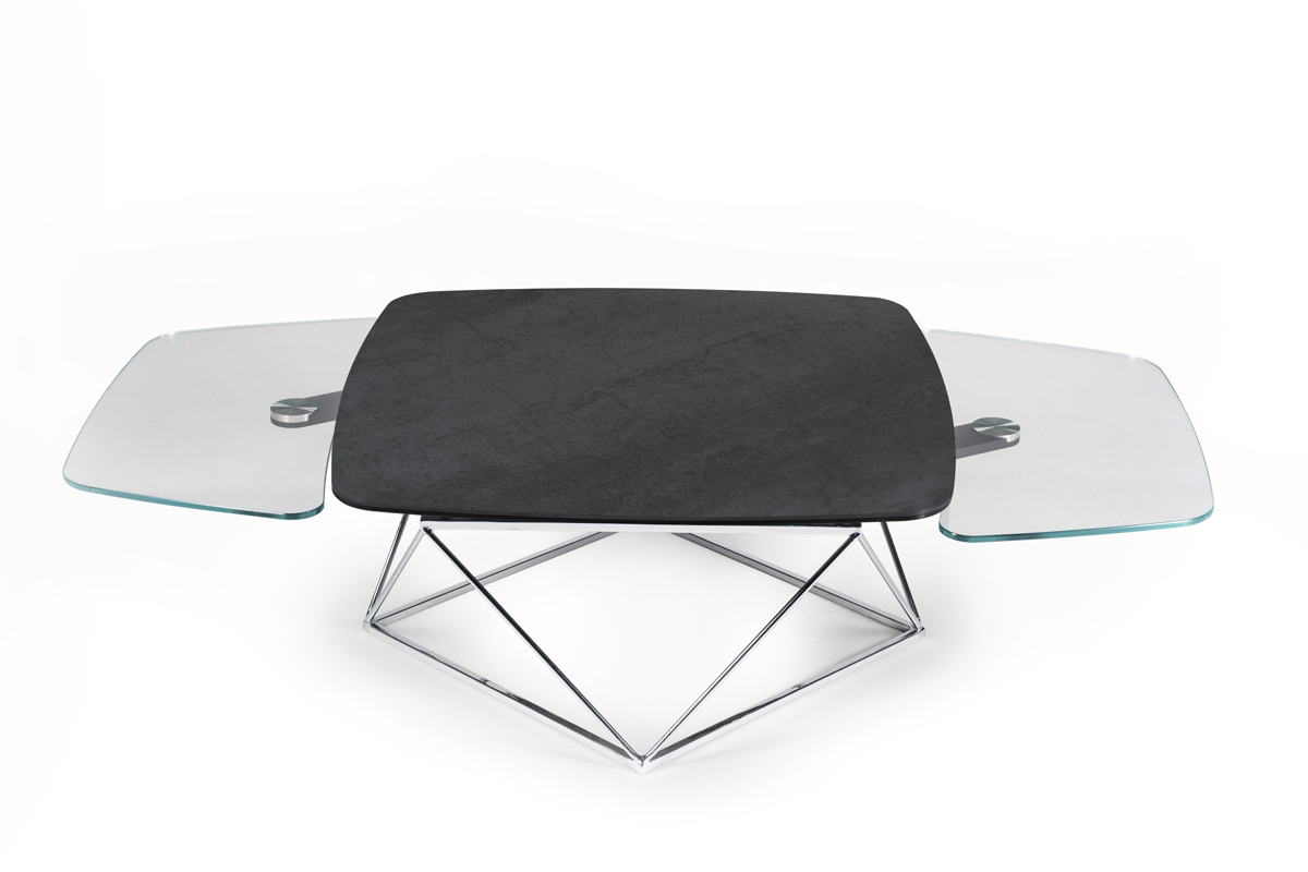 Designerski włoski stolik kawowy UPTOWN - stolik o intrygującym designie; podstawa metalowa; centralny blat ceramiczny, dwa blaty pomocnicze ceramiczne lub szklane. Stolik dostępny w wersji rozkładanej i nierozkładanej.