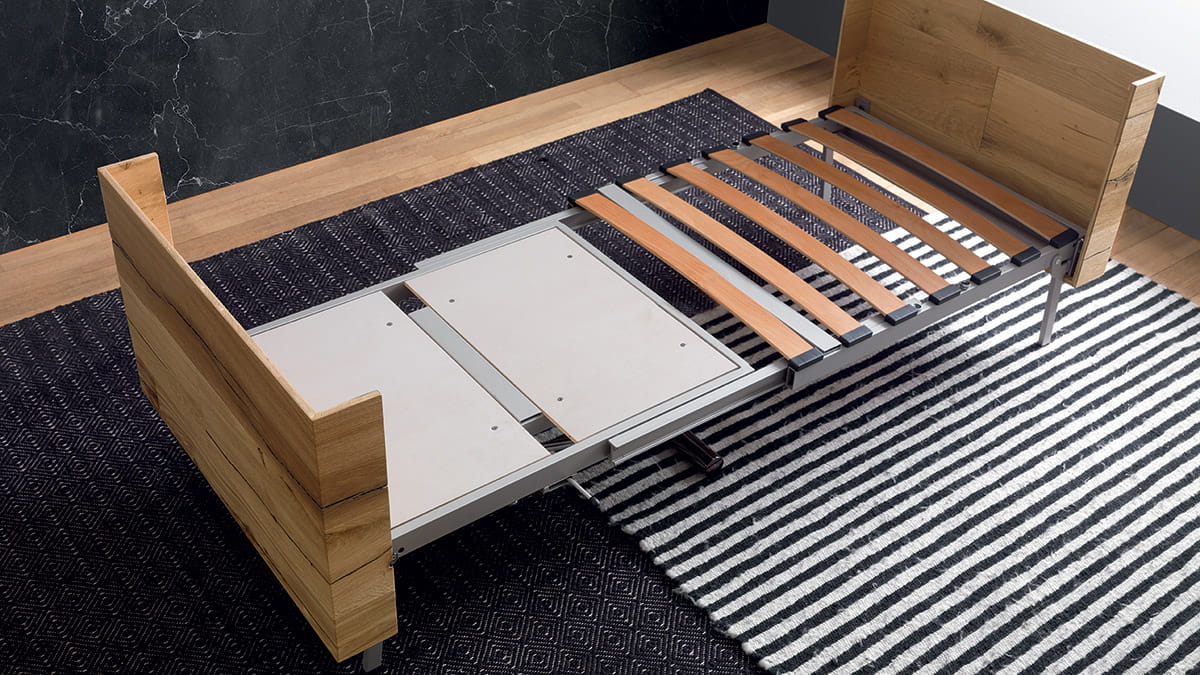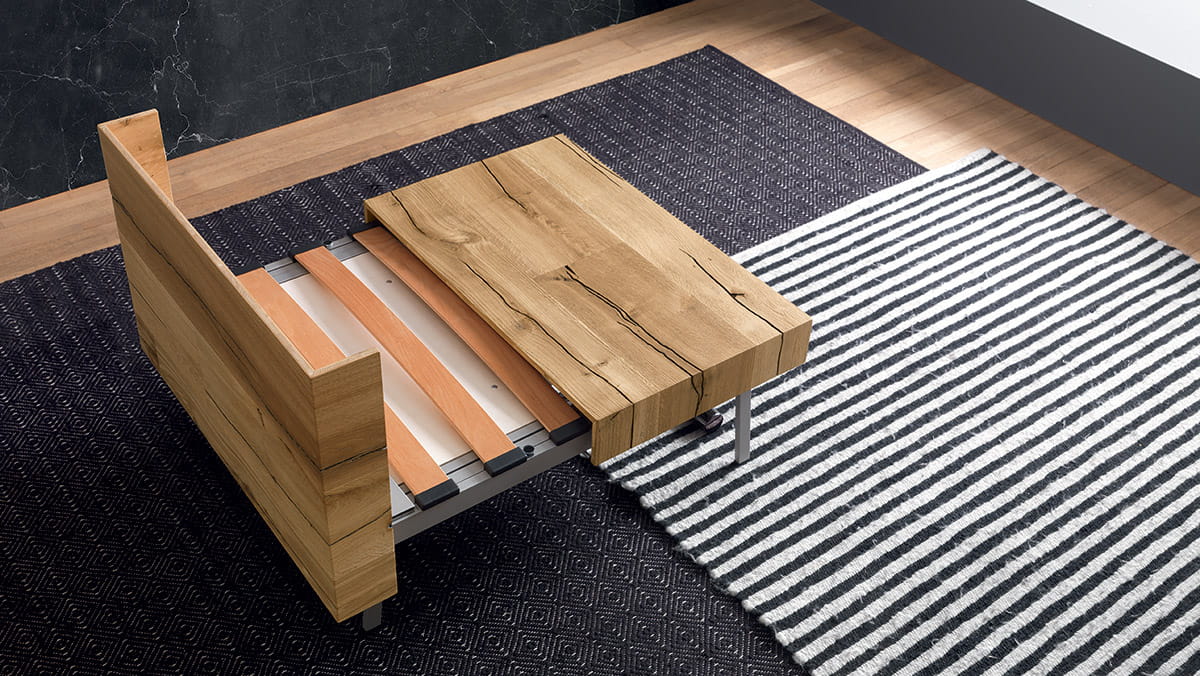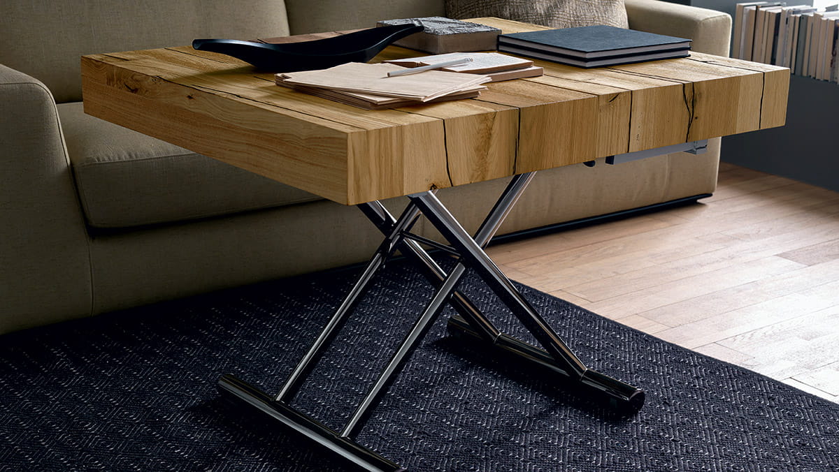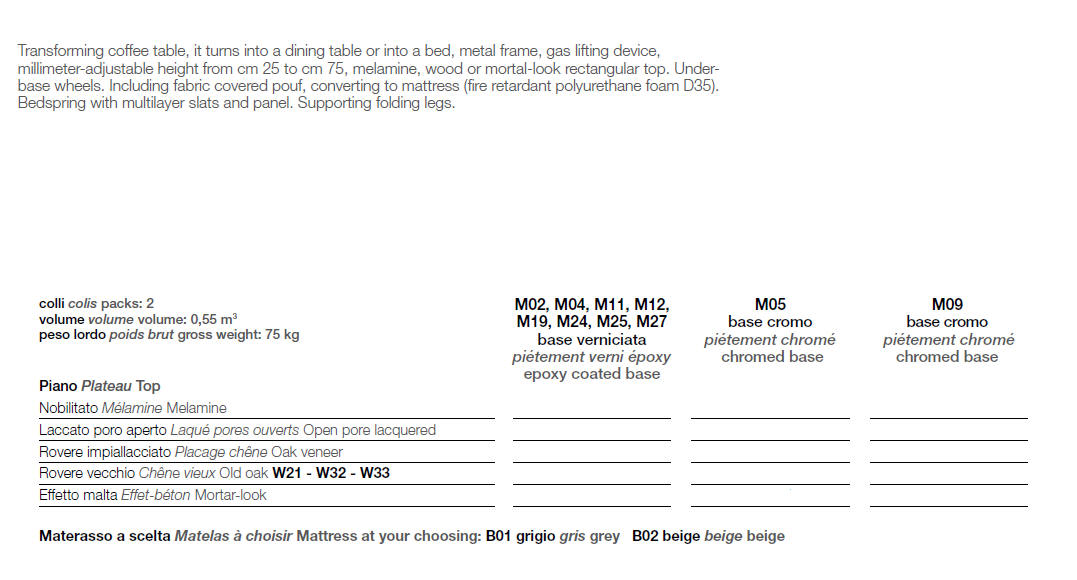 Nowoczesny włoski stolik podnoszony TAVOLETTO stolik ma ukryte rozkładane łóżko - stół regulowany ze stolika kawowego do stołu jadalnianego; podstawa metalowa; mechanizm podnoszenia gazowy; w podstawie ukryte kółka ułatwiające regulację wysokości; regulacja wysokości od 25 cm do 75 cm; blat: Melamine, Open pore lacquered, Oak veneer, Solid Wood, Mortar-look. Materac do łóżka przechowywany osobno.