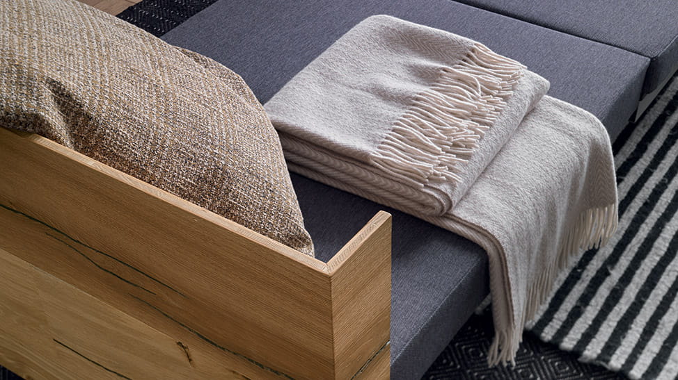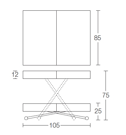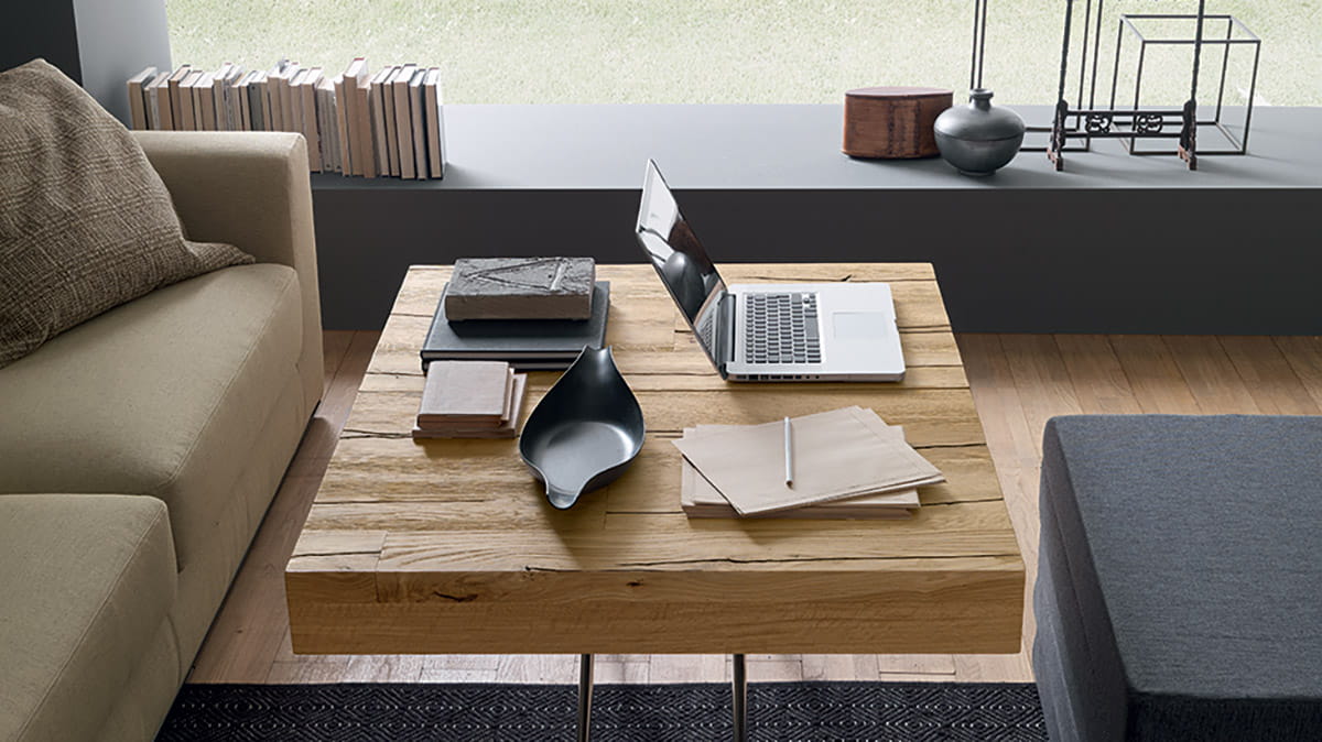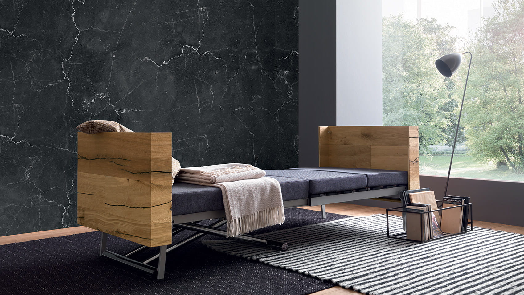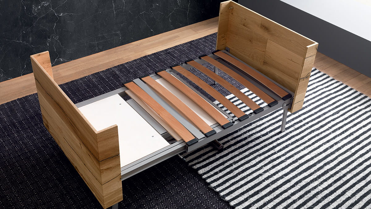 Nowoczesny włoski stolik podnoszony TAVOLETTO stolik ma ukryte rozkładane łóżko - stół regulowany ze stolika kawowego do stołu jadalnianego; podstawa metalowa; mechanizm podnoszenia gazowy; w podstawie ukryte kółka ułatwiające regulację wysokości; regulacja wysokości od 25 cm do 75 cm; blat: Melamine, Open pore lacquered, Oak veneer, Solid Wood, Mortar-look. Materac do łóżka przechowywany osobno.