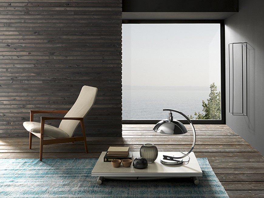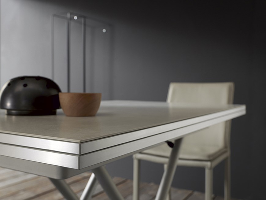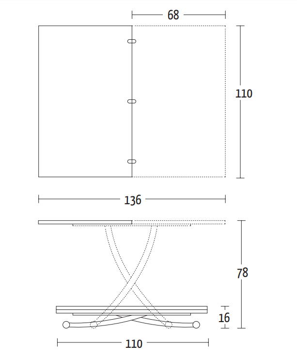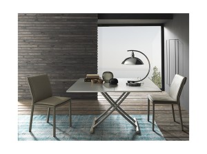 Nowoczesny włoski stolik podnoszony rozkładany do wielkości stołu BESSY - stół regulowany ze stolika kawowego do stołu jadalnianego; podstawa metalowa; mechanizm podnoszenia gazowy; w podstawie ukryte kółka ułatwiające regulację wysokości; regulacja wysokości od 16 cm do 78 cm; blat: melamina, Glass, Frosted glass, Matt lacquered, High gloss lacquered, Open pore lacquered, Oak veneer, Mortar-look, Ceramic.