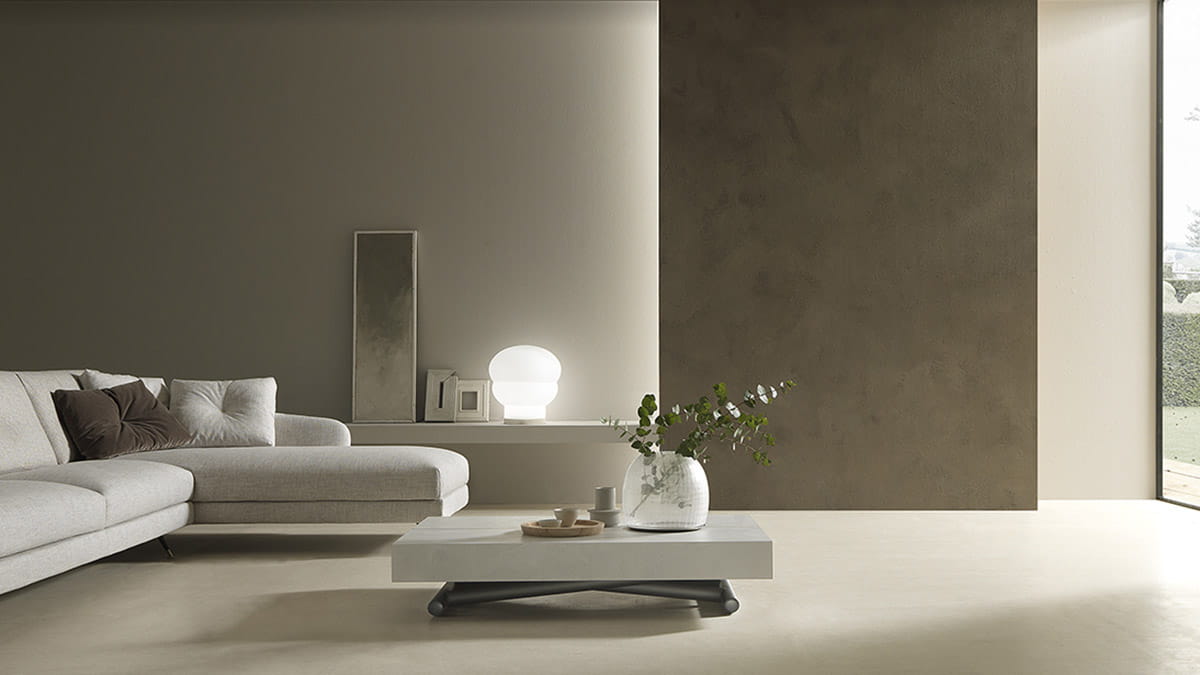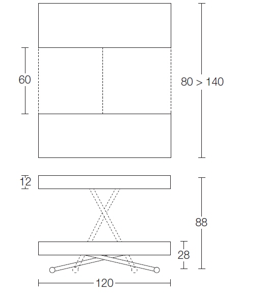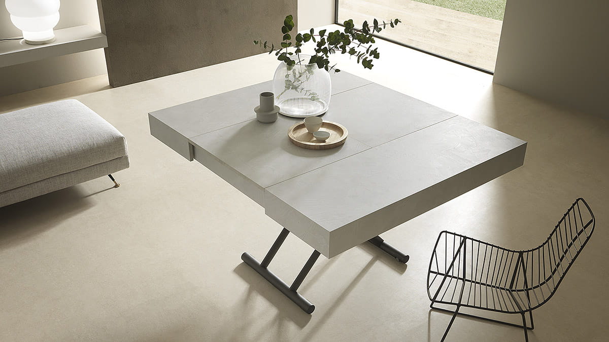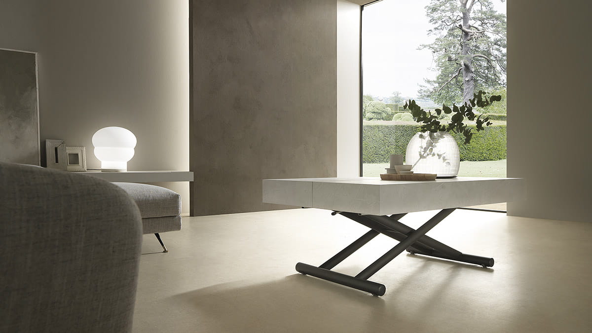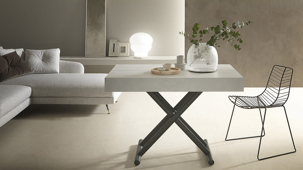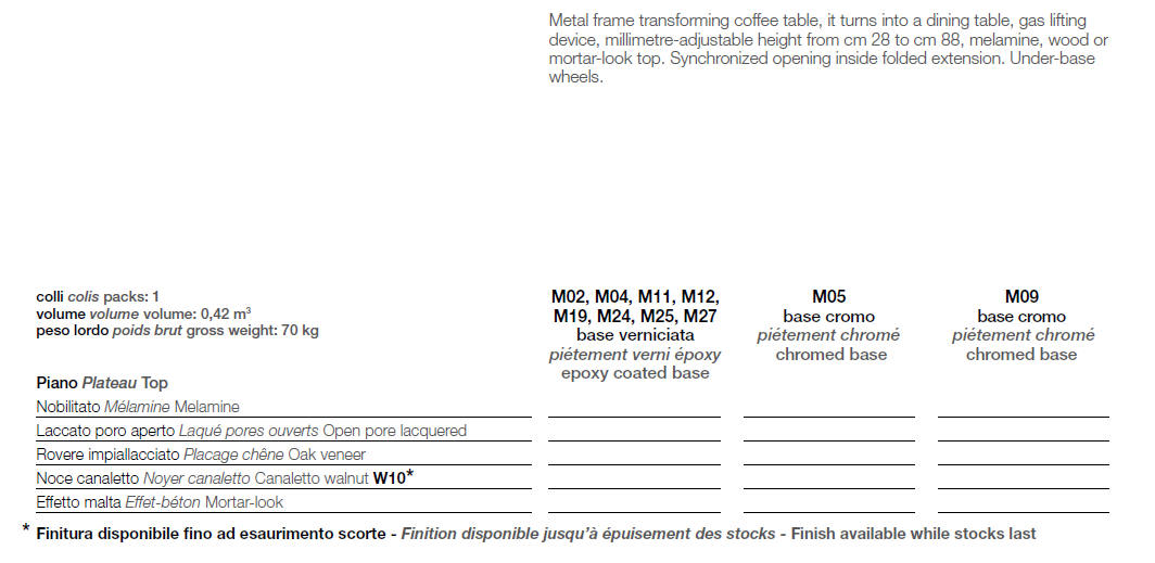 Nowoczesny włoski stolik podnoszony rozkładany do wielkości stołu DIARIO - stół regulowany ze stolika kawowego do stołu jadalnianego; podstawa metalowa; mechanizm podnoszenia gazowy; w podstawie ukryte kółka ułatwiające regulację wysokości; regulacja wysokości od 28 cm do 88 cm; blat: veneer wood, Melamine, Mortar-look, open pore wood.