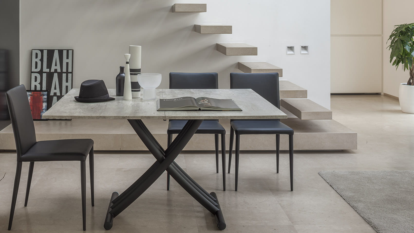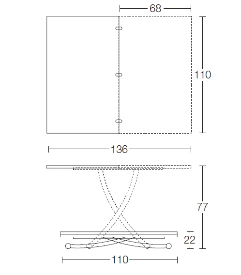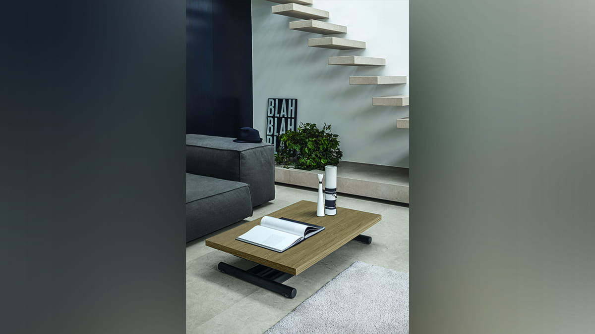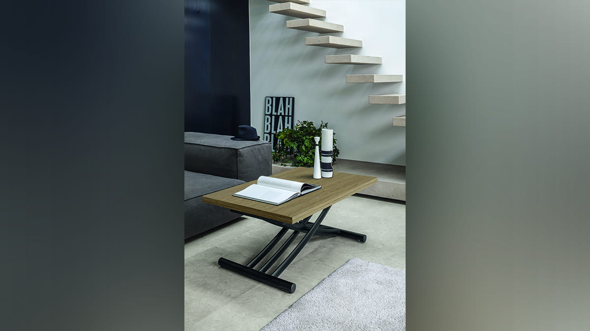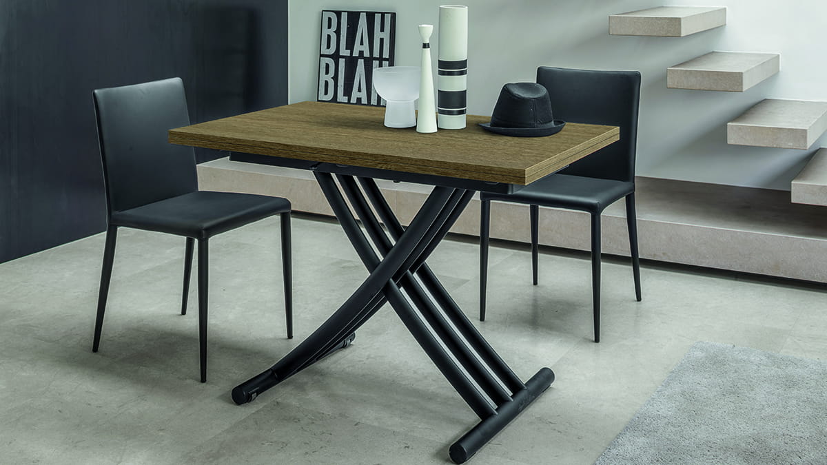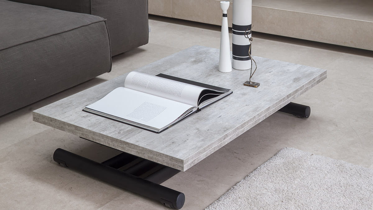 Nowoczesny włoski stolik podnoszony rozkładany do wielkości stołu FENICE - stół regulowany ze stolika kawowego do stołu jadalnianego; podstawa metalowa; mechanizm podnoszenia gazowy; w podstawie ukryte kółka ułatwiające regulację wysokości; regulacja wysokości od 30 cm do 78 cm; blat: Melamine, Mortar-look, ceramica, glass.
