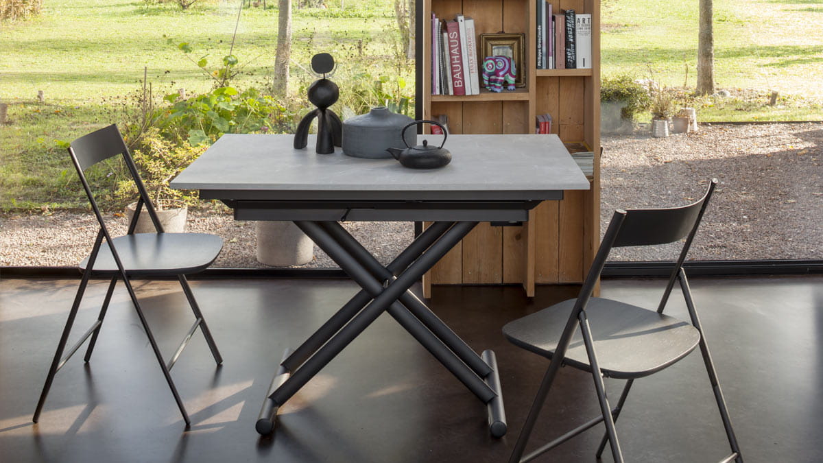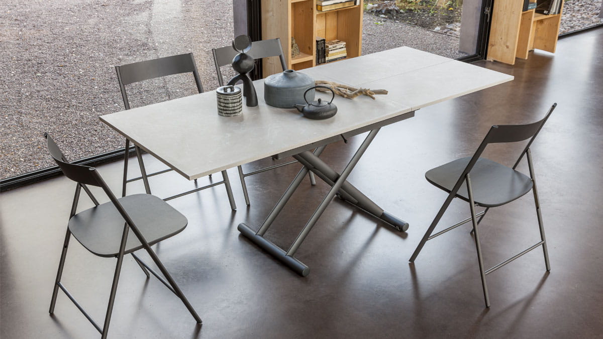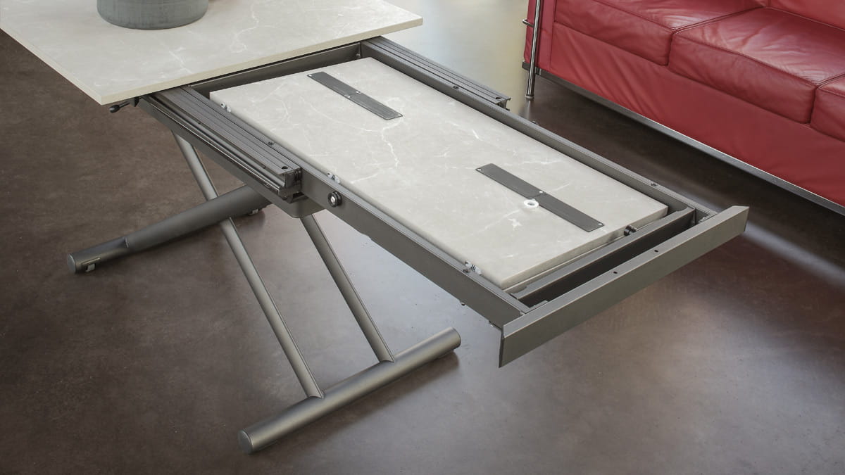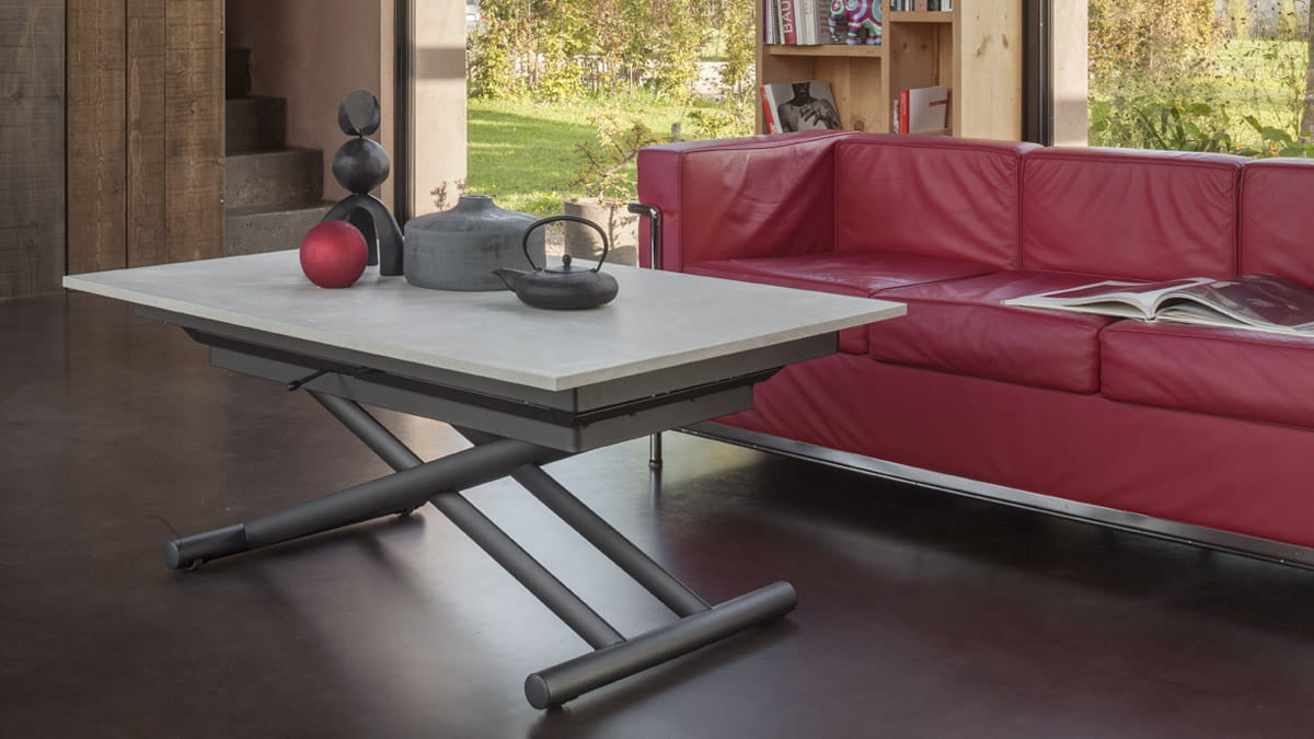 Nowoczesny włoski stolik podnoszony rozkładany do wielkości stołu SIRIO - stół regulowany ze stolika kawowego do stołu jadalnianego; mechanizm podnoszenia gazowy; regulacja wysokości od 33 cm do 82 cm; blat: melamina, glass, open pore, oak veneer, mortar look, ceramica 3mm, ceramica 5mm.