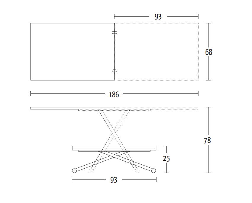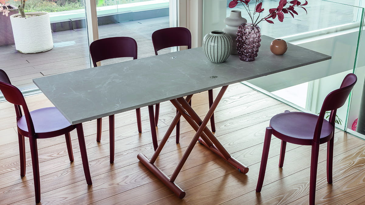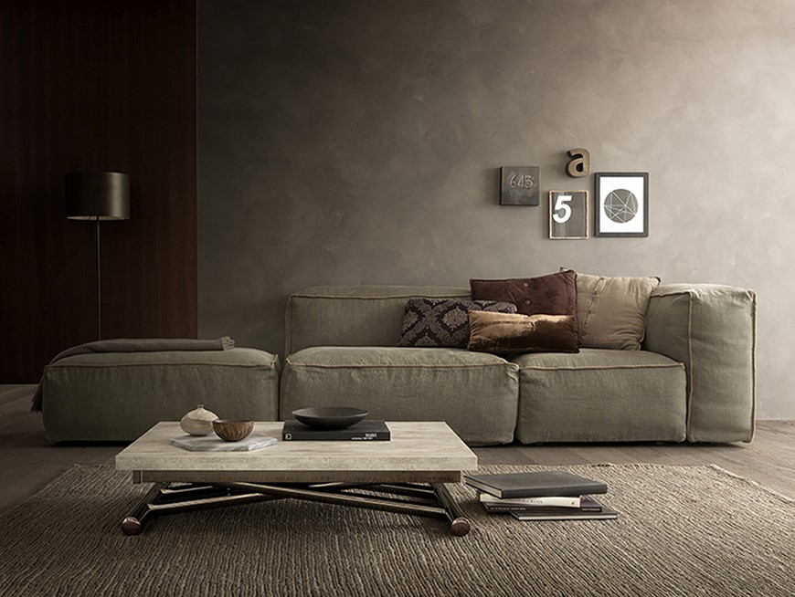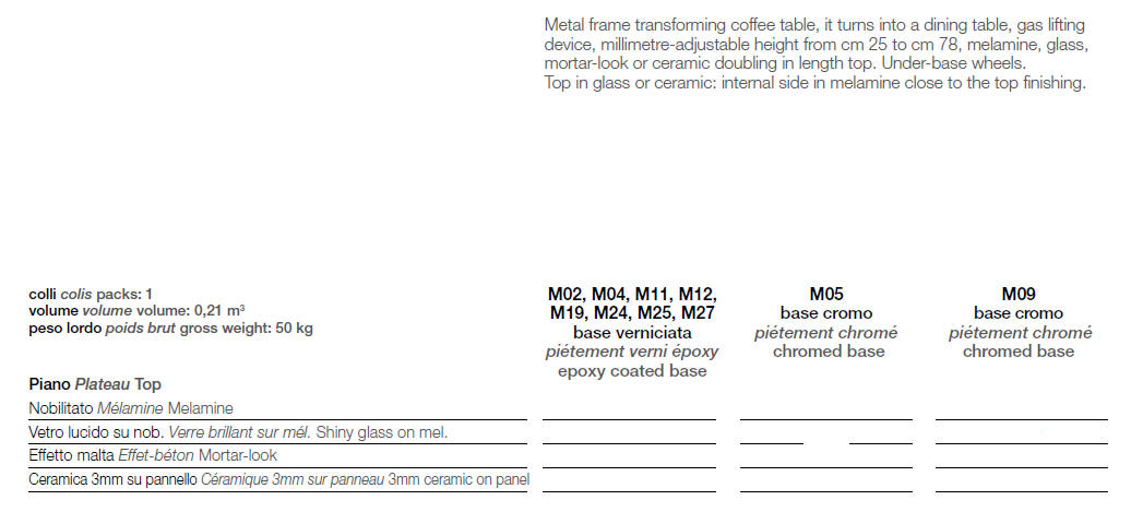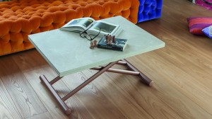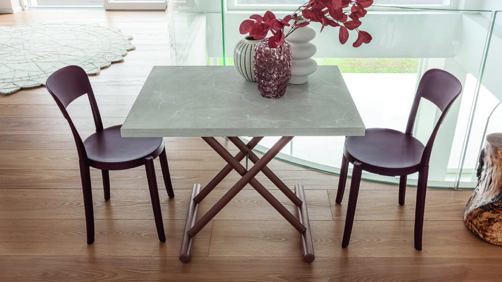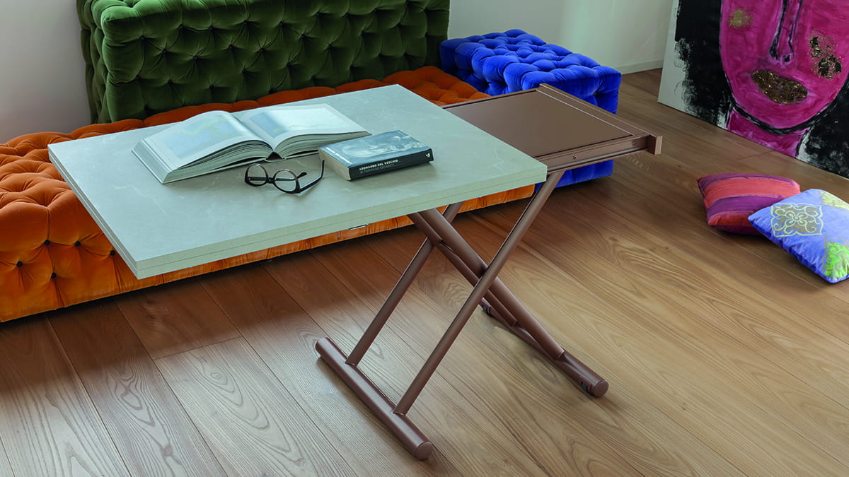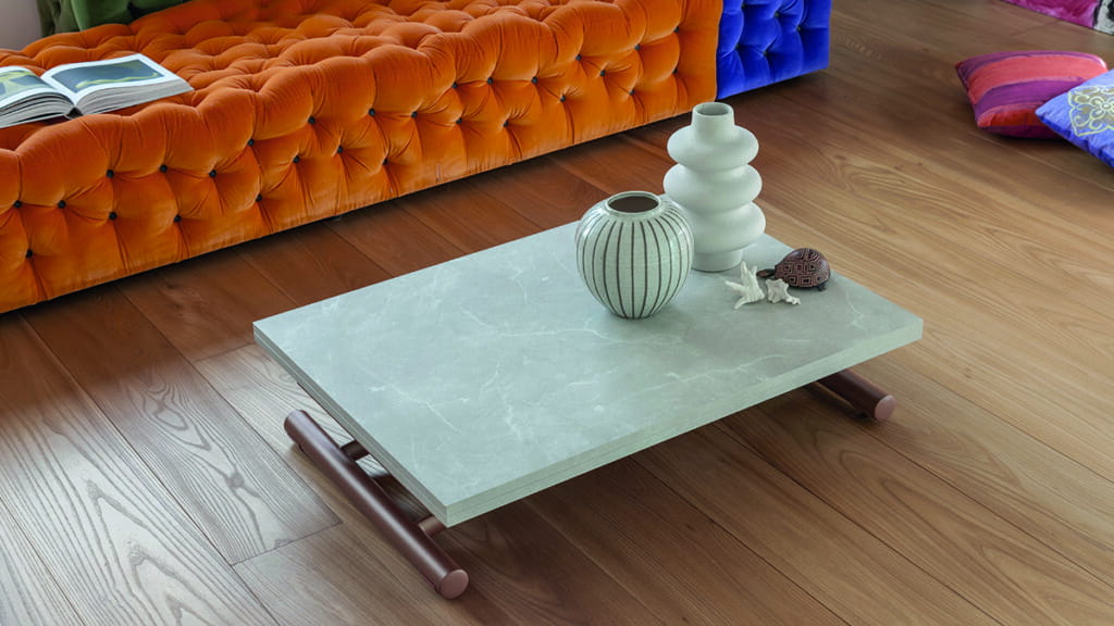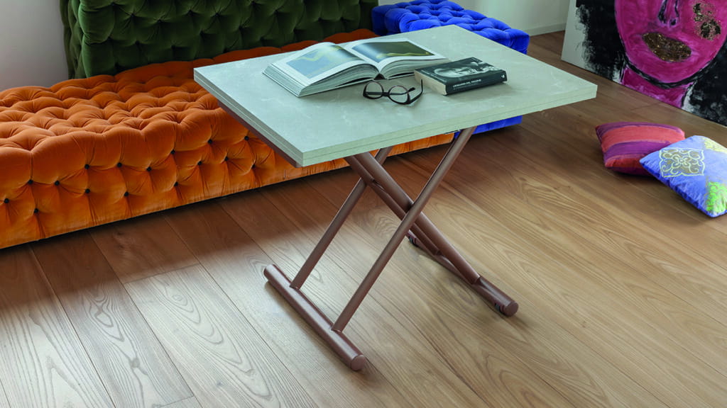 Nowoczesny włoski stolik podnoszony rozkładany do wielkości stołu GINGILLO - stół regulowany ze stolika kawowego do stołu jadalnianego; podstawa metalowa; mechanizm podnoszenia gazowy; regulacja wysokości od 25 cm do 78 cm; w podstawie ukryte kółka ułatwiające regulację wysokości; blat: melamina, glass, Mortar-look, Ceramic.