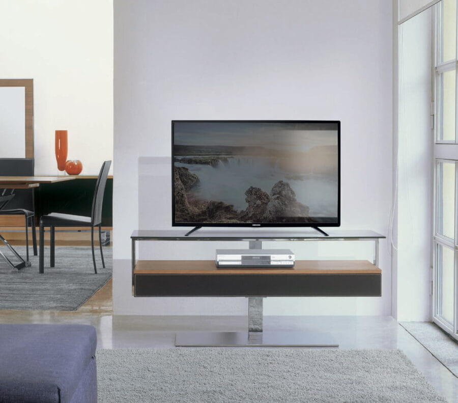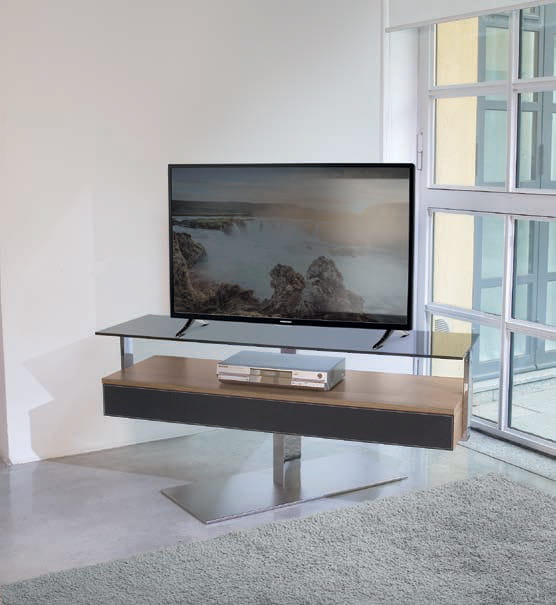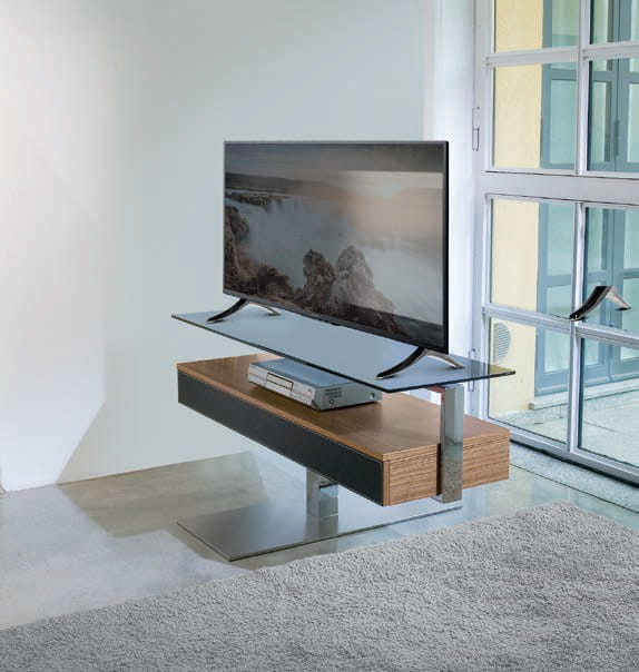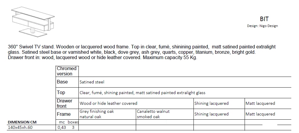 Szafka RTV BIT - nowoczesna szafka; obrotowa w pełnym zakresie 360 stopni; podstawa metalowa lub lakierowana; blat szklany transparentny, dymiony, lakierowany w połysku lub lakierowany matowy; szafka wyposażona w szufladę; front szuflady drewniany, lakierowana matowa lub z połyskiem lub pokryty skórą. Maksymalne obciążenie 55 kg.