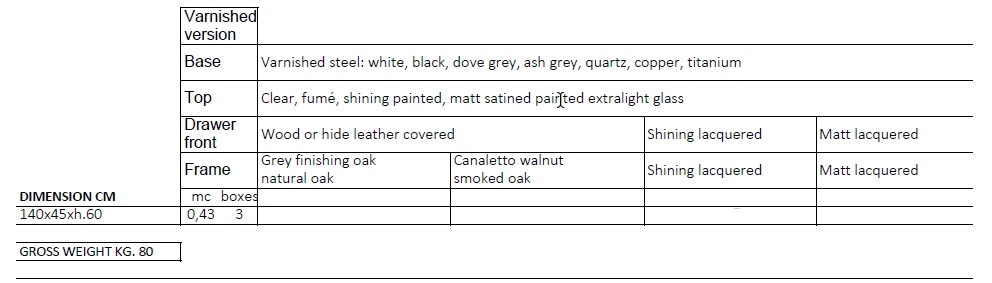 - 140x45xh60 cena od 11 817 zł brutto (dotyczy wariantu: baza: varnished steel; blat: Clear, fumé, shining painted, matt satined painted extralight glass; front szuflady: Matt lacquered; rama: Matt lacquered)