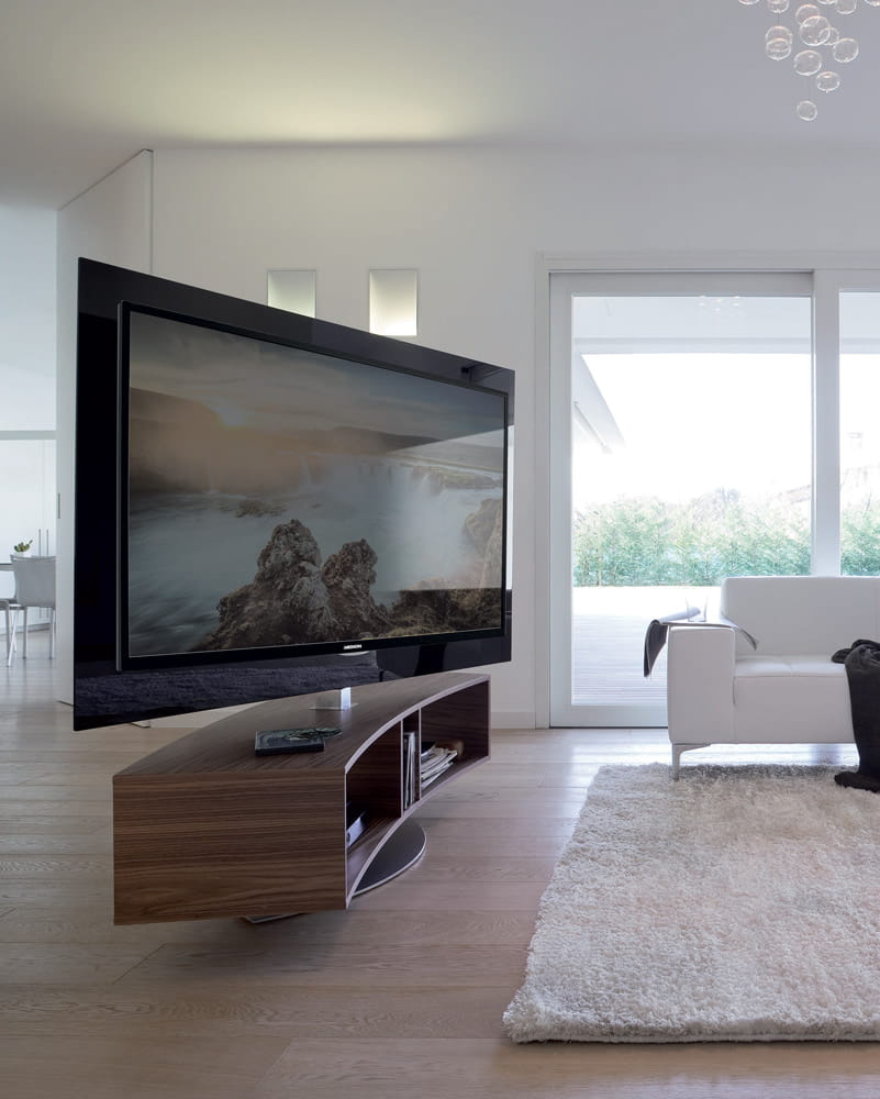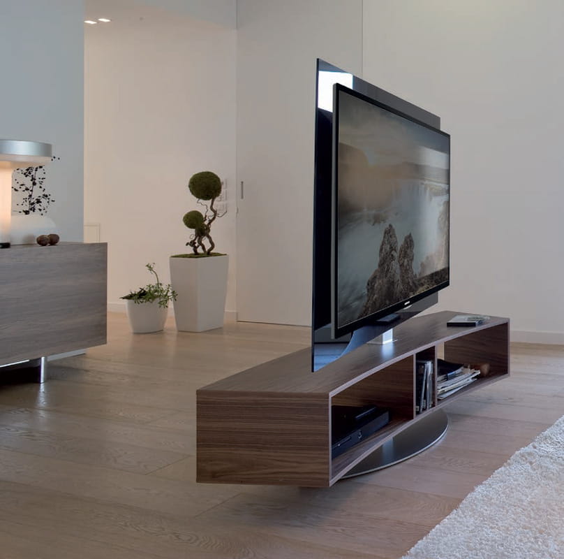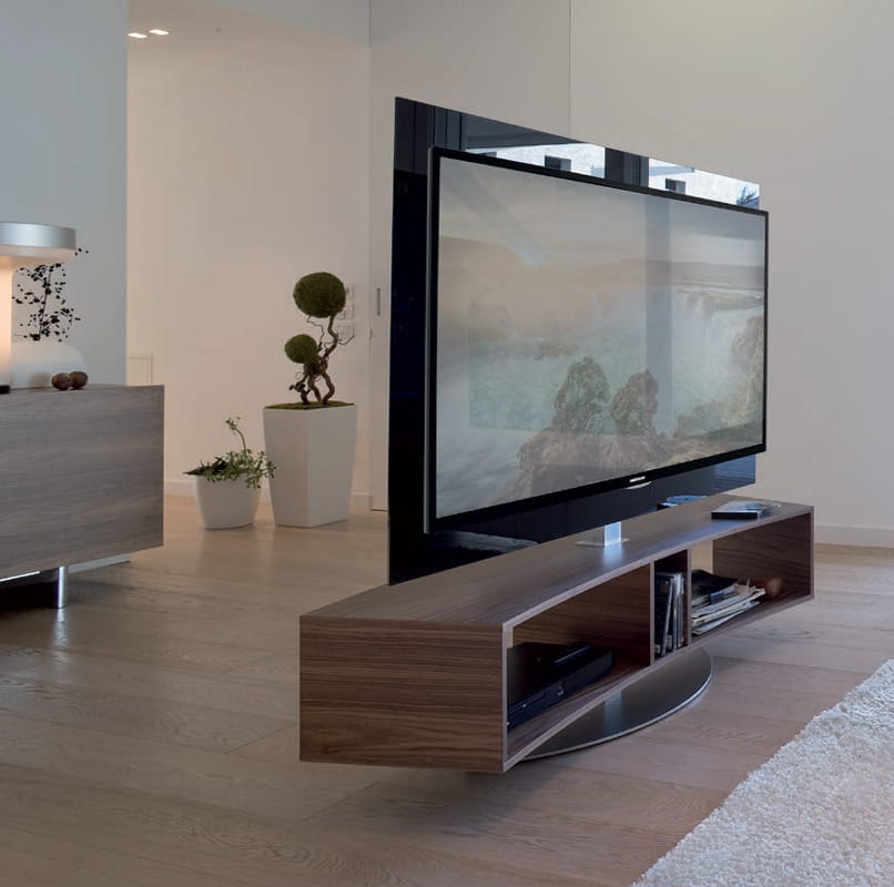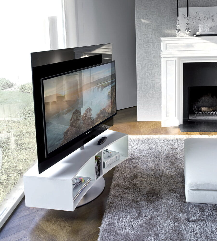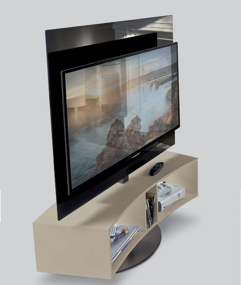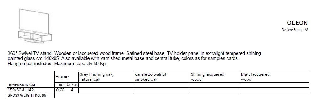 Szafka RTV ODEON- nowoczesna szafka; obrotowa w pełnym zakresie 360 stopni; podstawa metalowa; korpus drewniany lub drewniany lakierowany matowy lub z połyskiem. Szafka wyposażona w szklany panel lakierowany w połysku. Maksymalne obciążenie 50 kg.