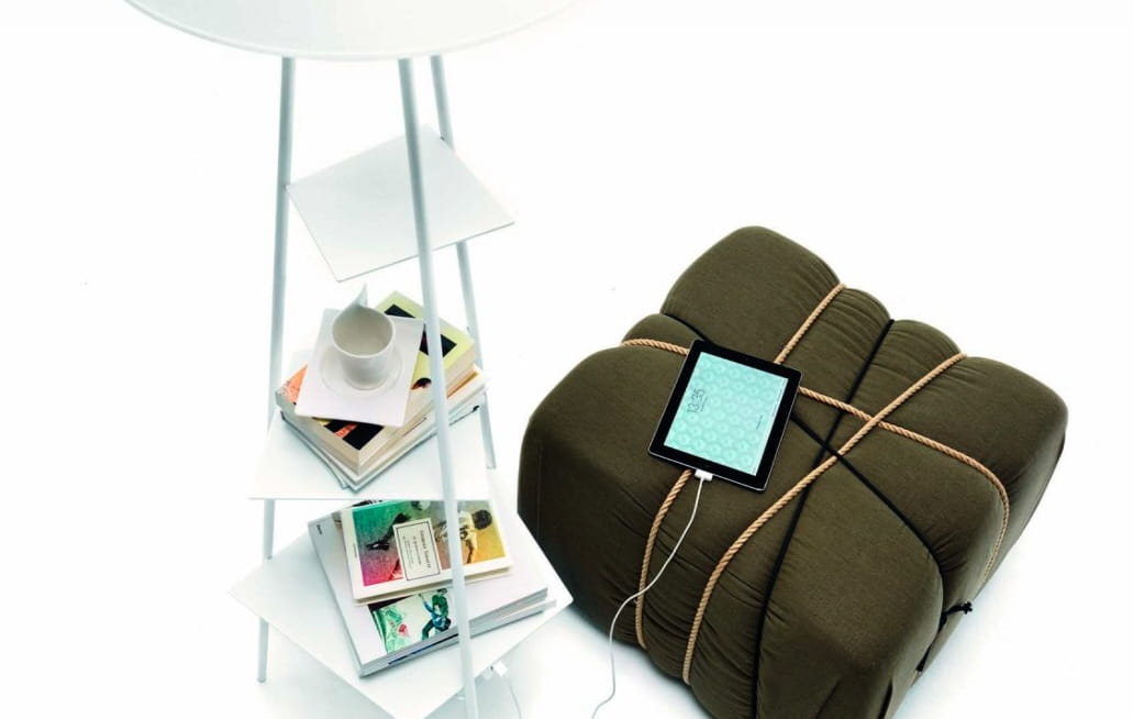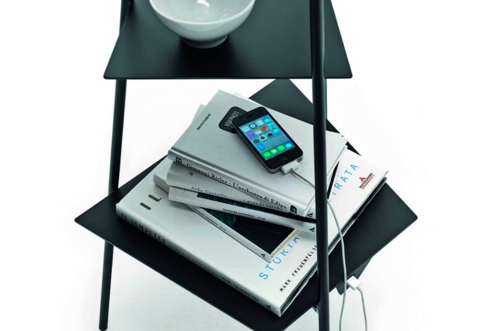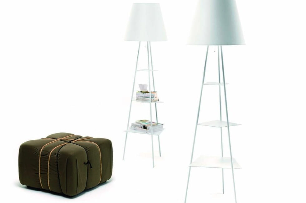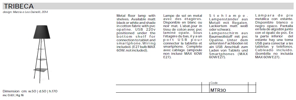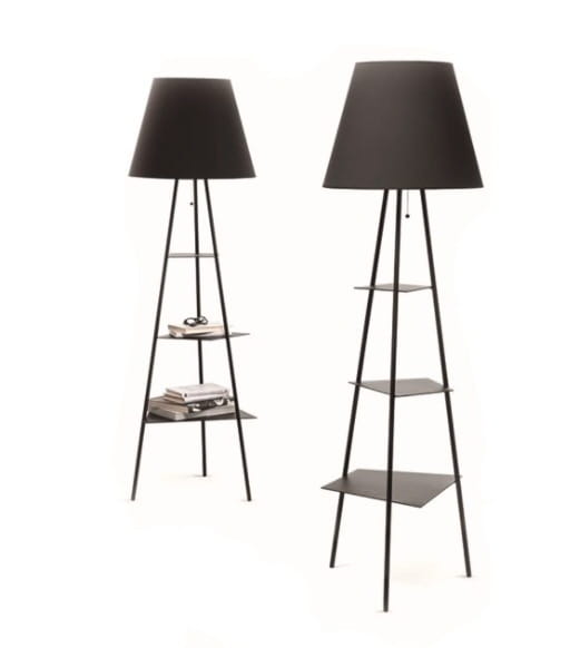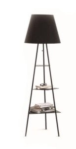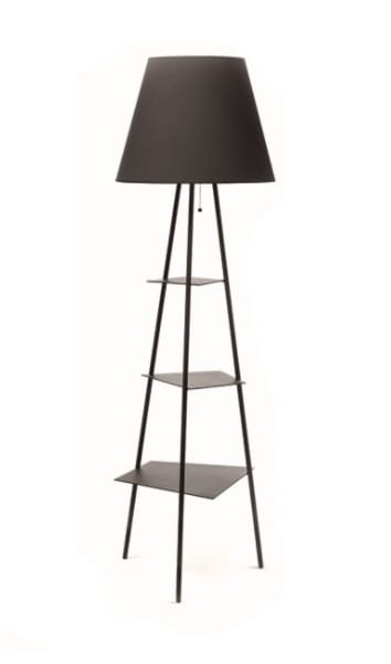 Lampa włoska TRIBECA - lampa podłogowa na podstawie metalowej wspartej na trzech nogach; lampa wyposażona w trzy wygodne półki. Lampa dostępna w dwóch kolorach.