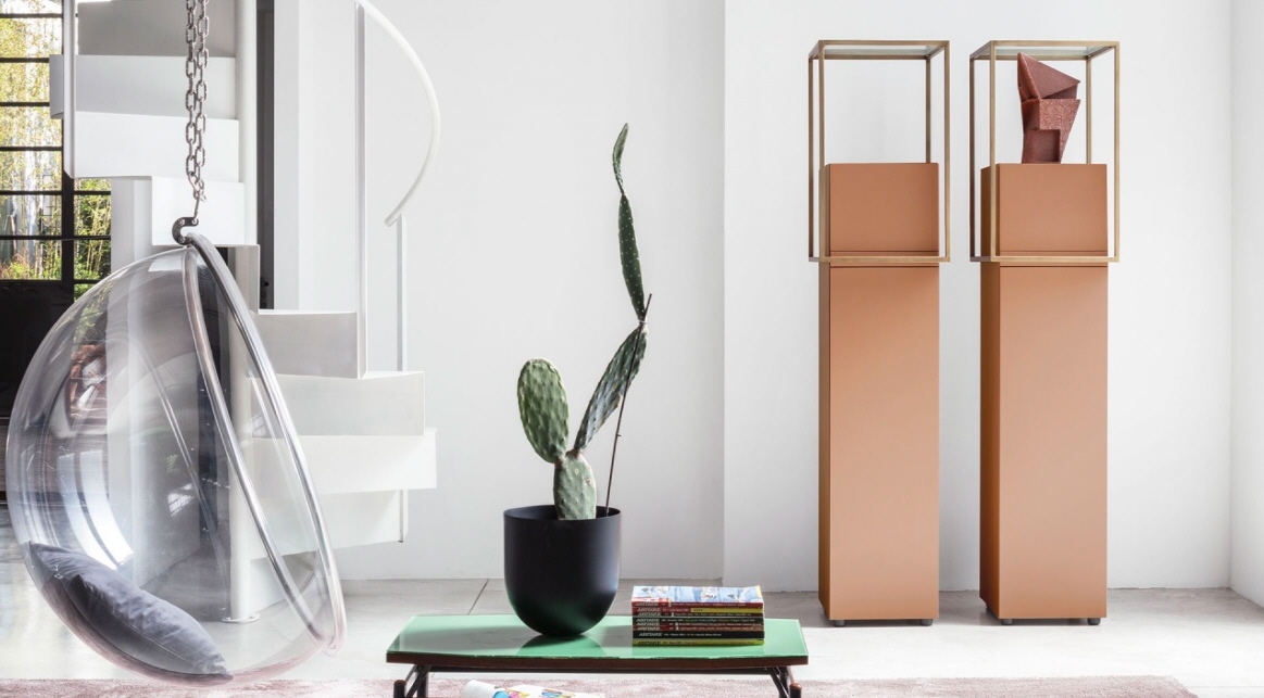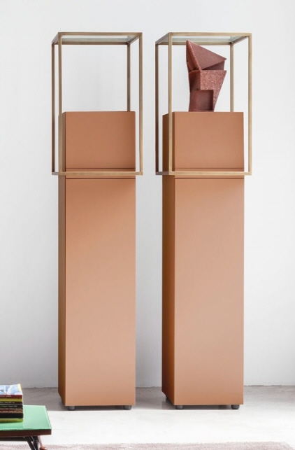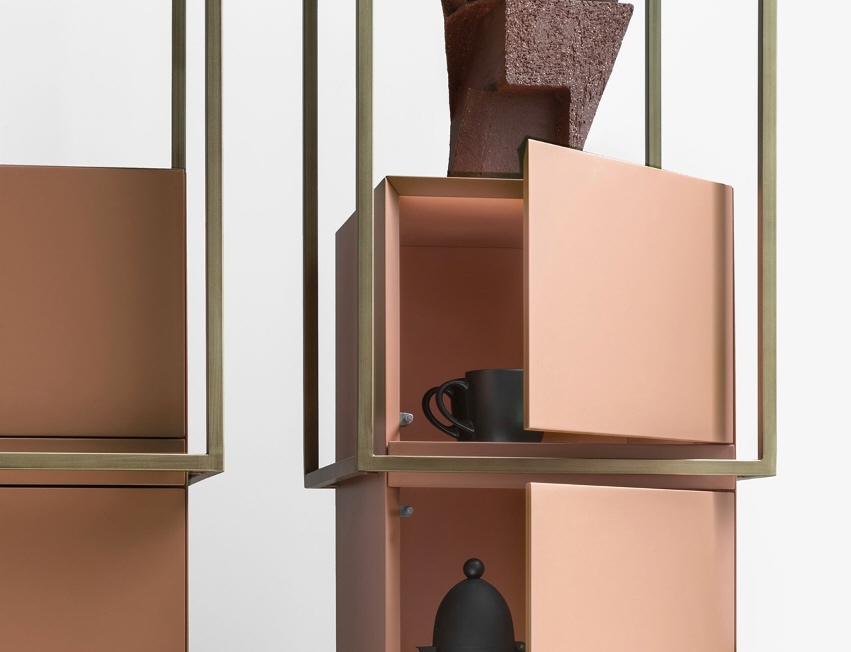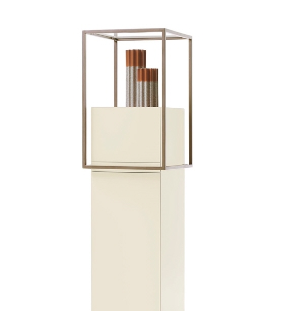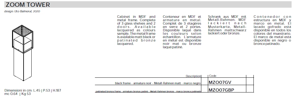 Regał, szafka włoska ZOOM - szafka doskonała do nowoczesnych wnętrz; składa się z dwóch części; część zamykana jest lakierowana; połączona jest z metalową ramą w dwóch kolorach z blatem szklanym.